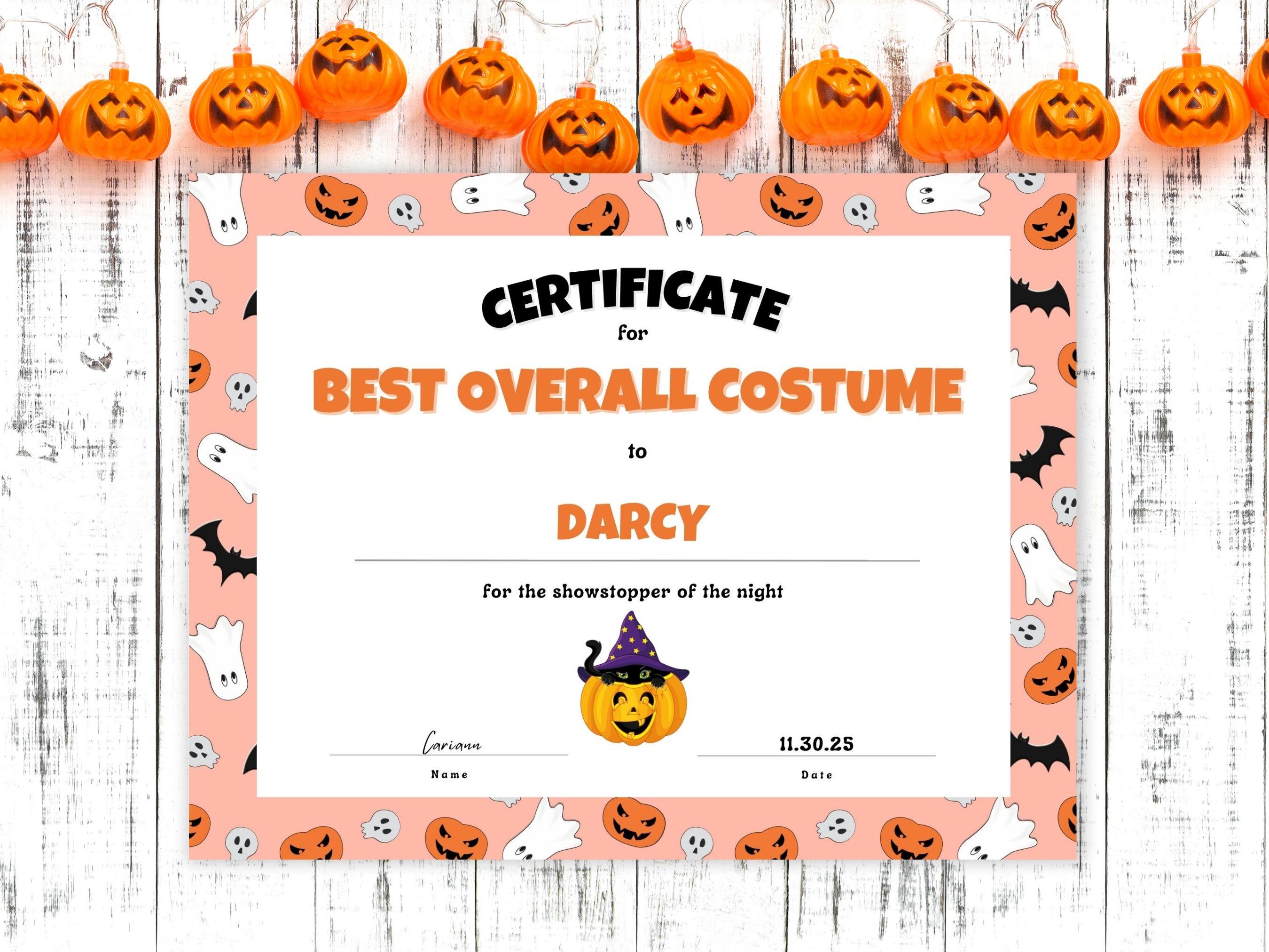 WHAT'S INCLUDED A bundle of 20 Halloween Costume Award Certificates featuring spooky and playful categories like "Scariest Costume," "Funniest Costume," and "Most Magical Wizard." Customizable certificate for any unique award your imagination can conjure up!