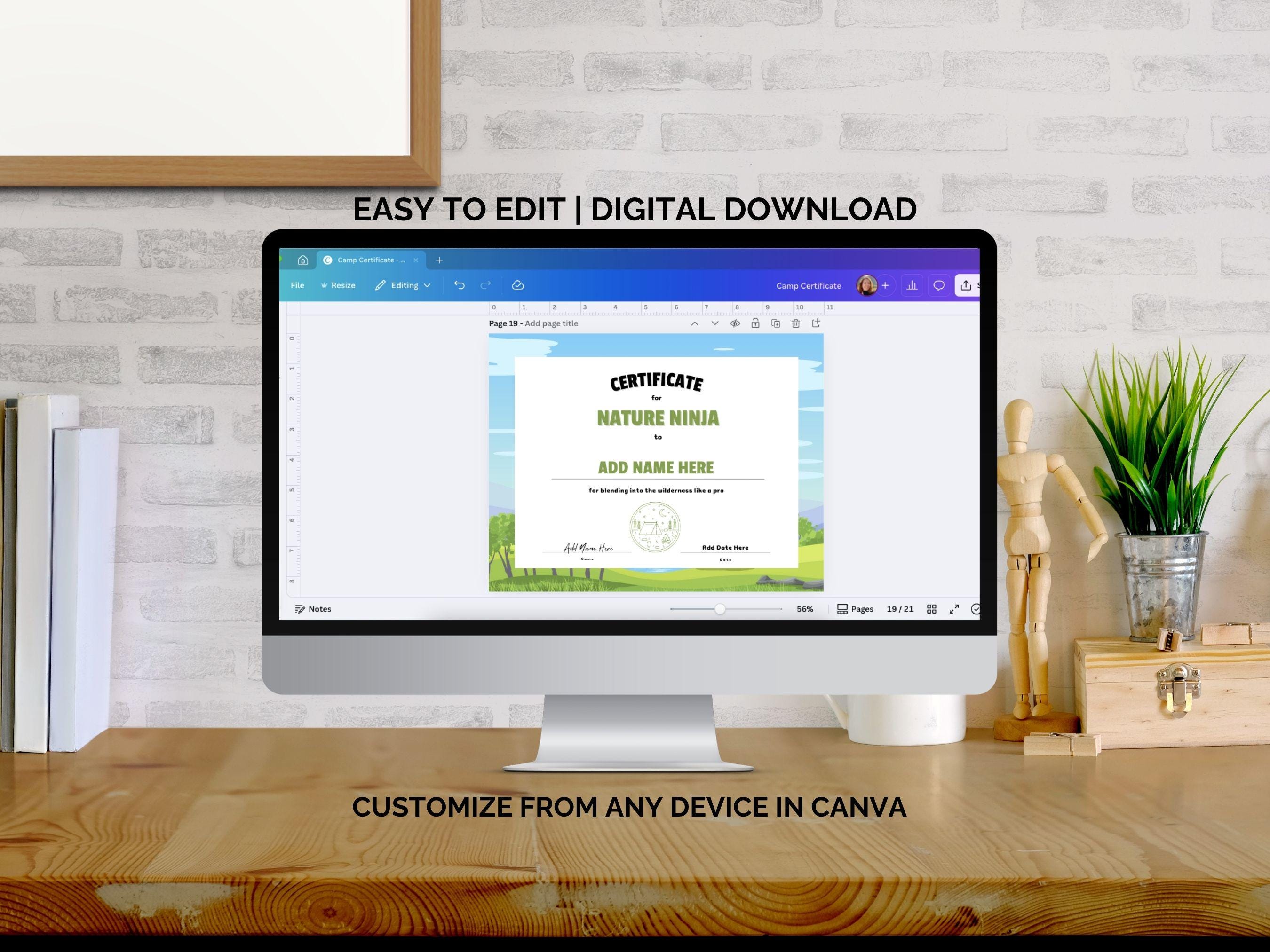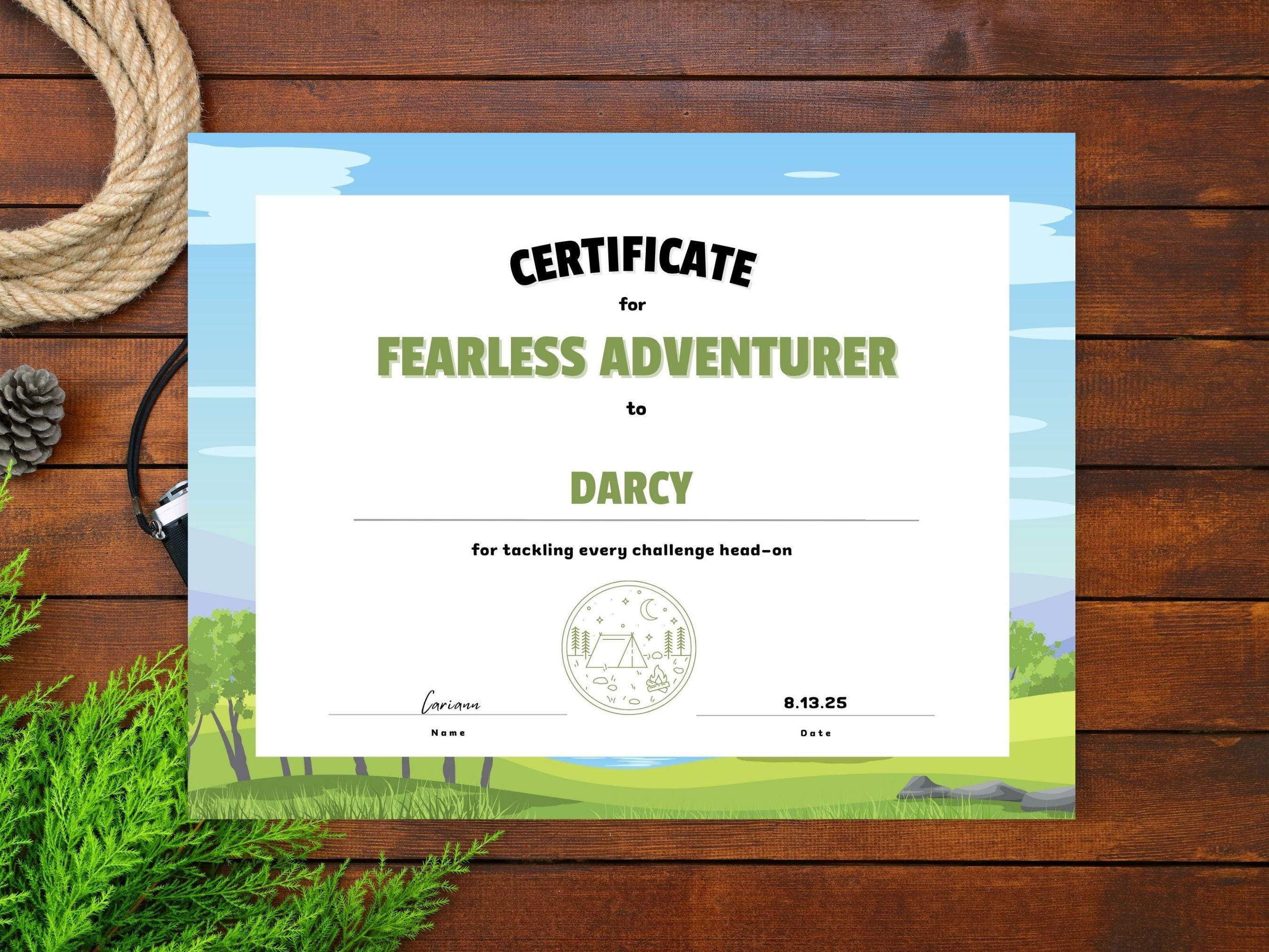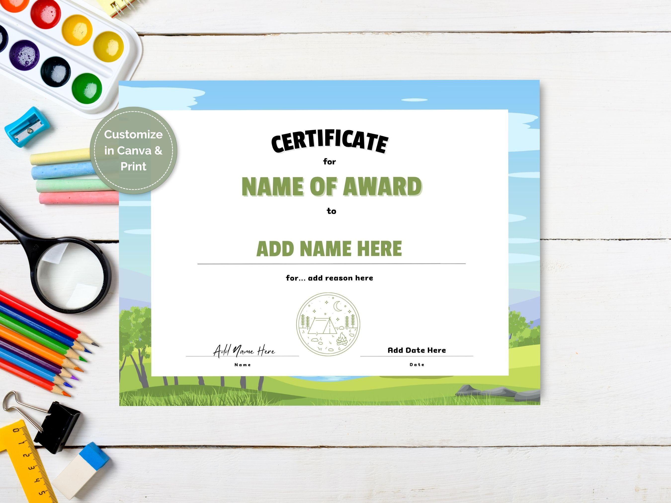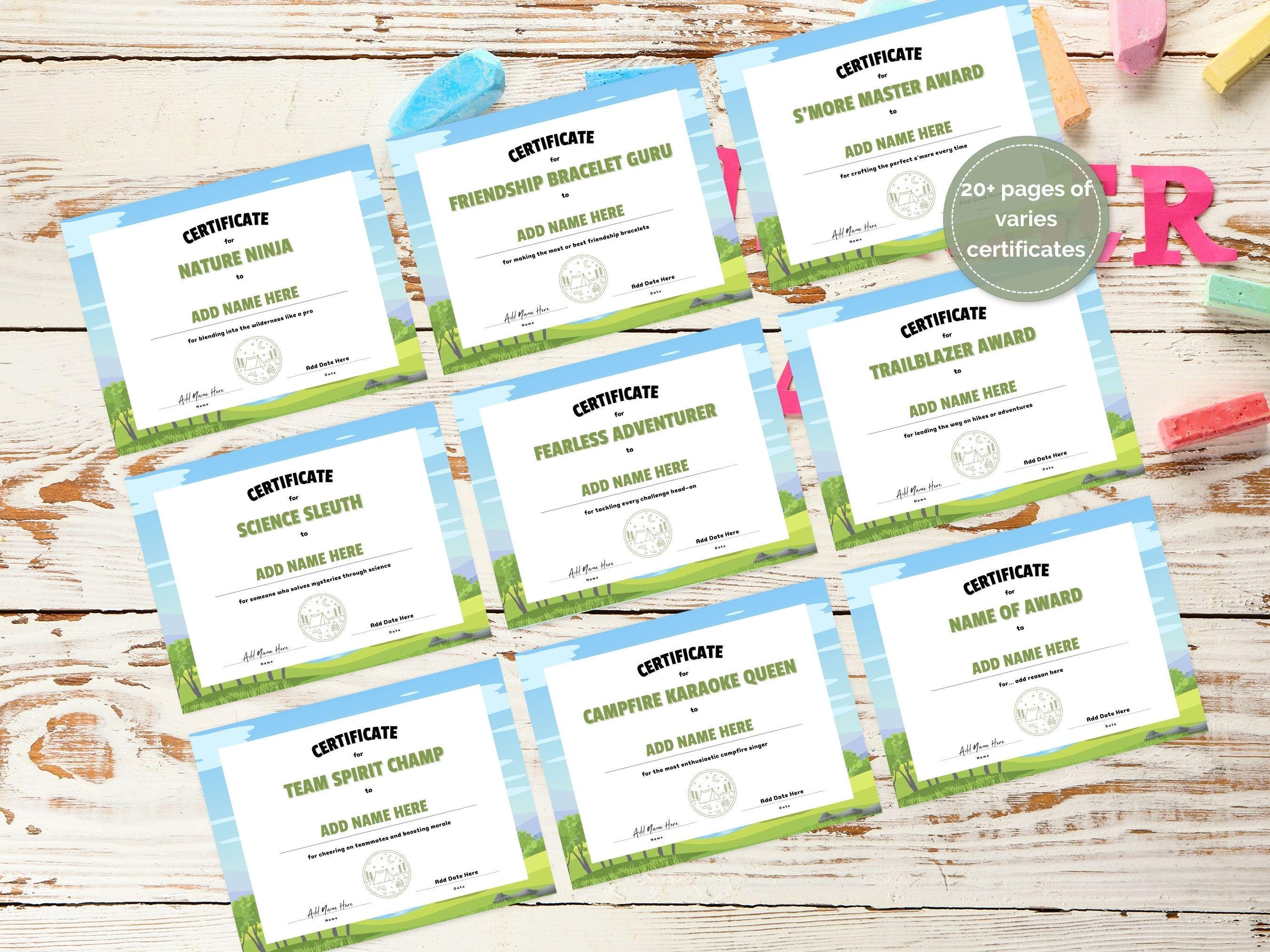 WHAT'S INCLUDED A fun bundle of 21 editable Camp Certificates with awards like “Nature Ninja,” “Campfire Storyteller,” and “Fearless Adventurer.” 1 customizable certificate so you can craft your own unique awards.