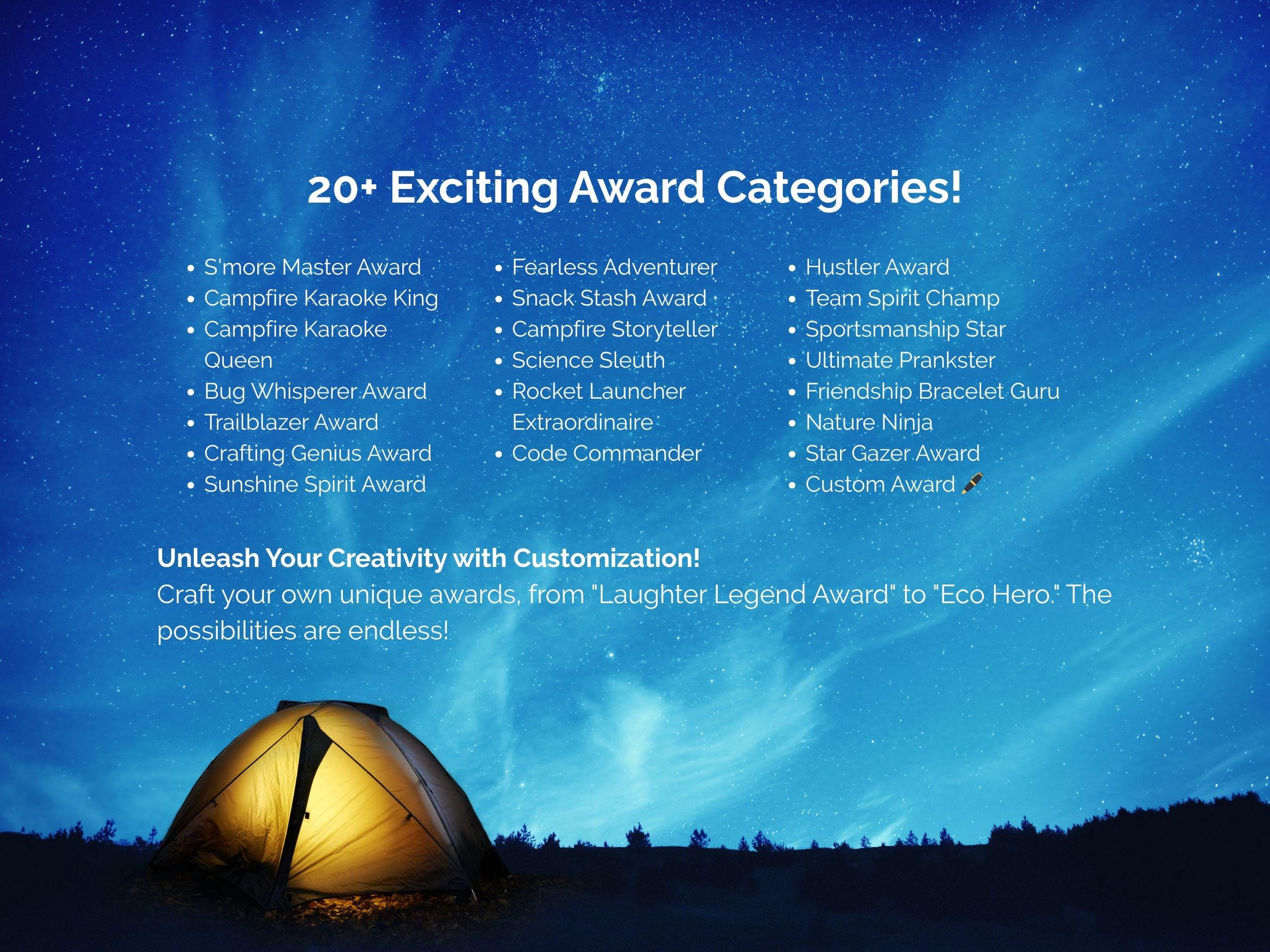 And the best part? There’s a fully customizable certificate included! Design your own awards to suit your camp’s personality. Whether it’s “Best Pancake Flipper” or “Ultimate Camp Explorer,” the options are endless.