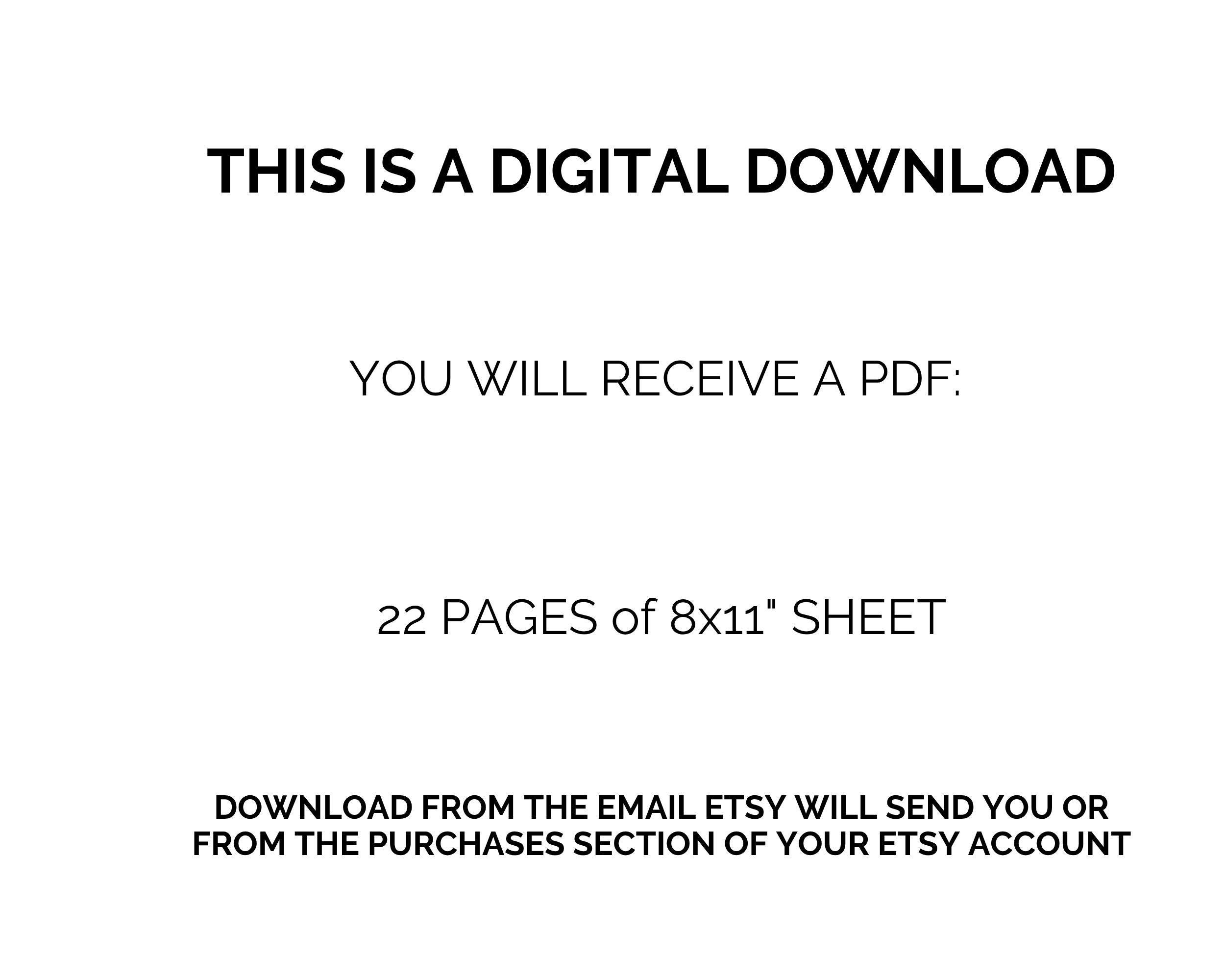 HOW TO GET YOUR FILES Add the item to your cart, choose your payment method, and complete your purchase. After purchase, you'll be directed to a download page on Etsy. Downloads will also be available in your Purchases section (www.etsy.com/your/purchases). Download your files. Print and enjoy! (Note: Colors may vary slightly depending on your printer and settings.)
