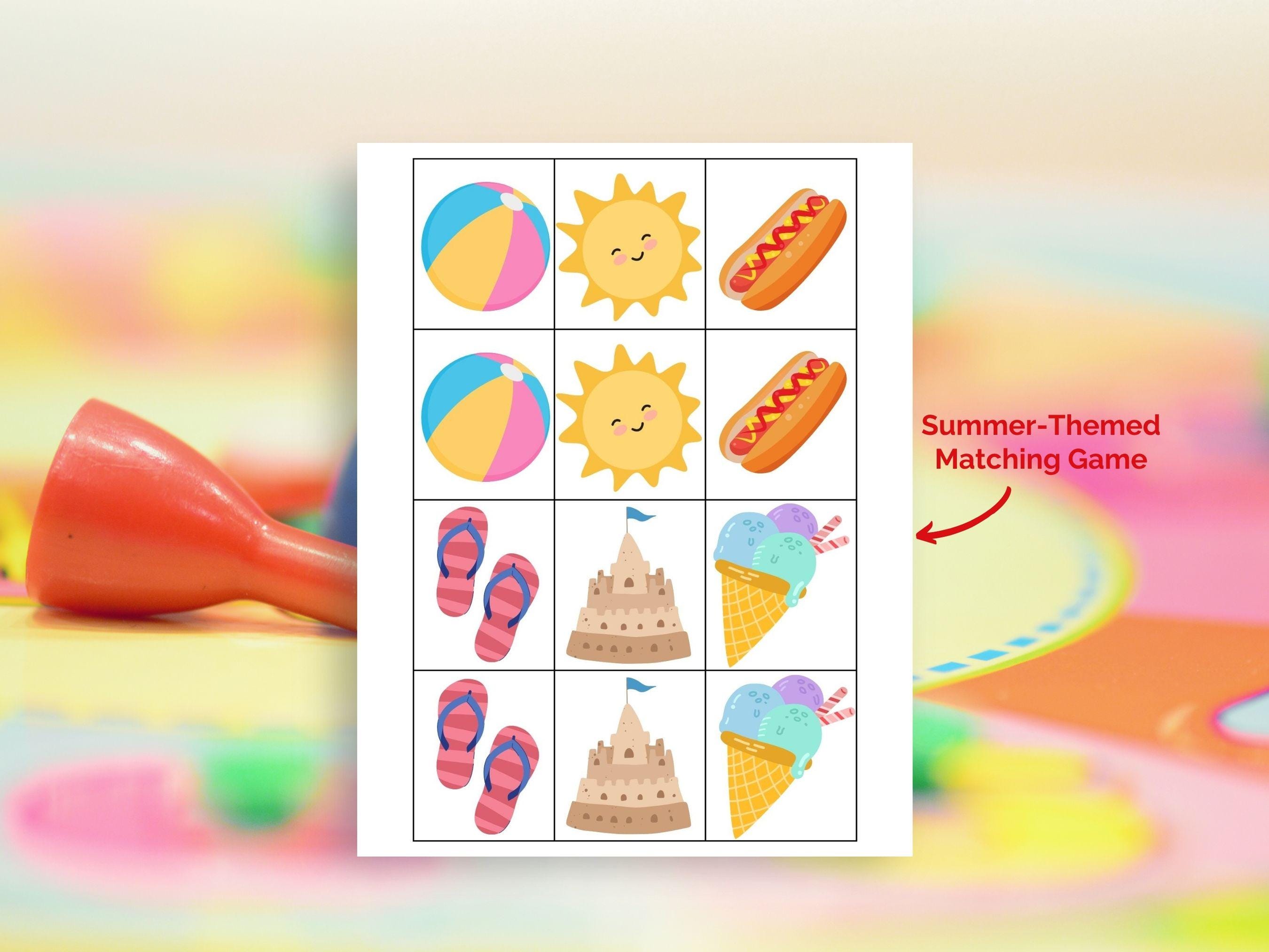 Matching Game: Memory-boosting fun with vibrant summer-themed pairs like beach balls, ice cream cones, and seashells.