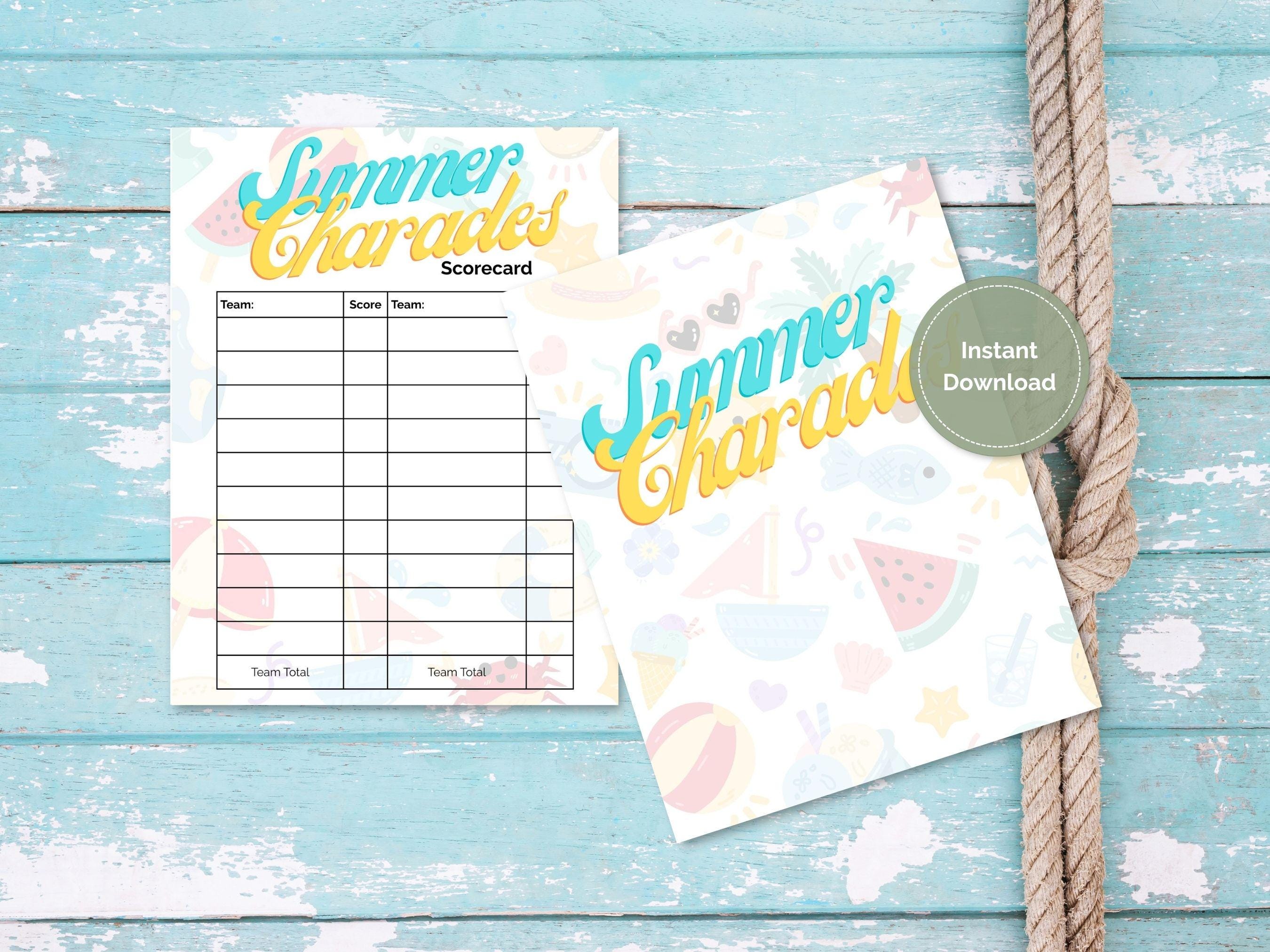 Charades: Hilarious acting and guessing fun with themes like beach volleyball, campfires, and more.