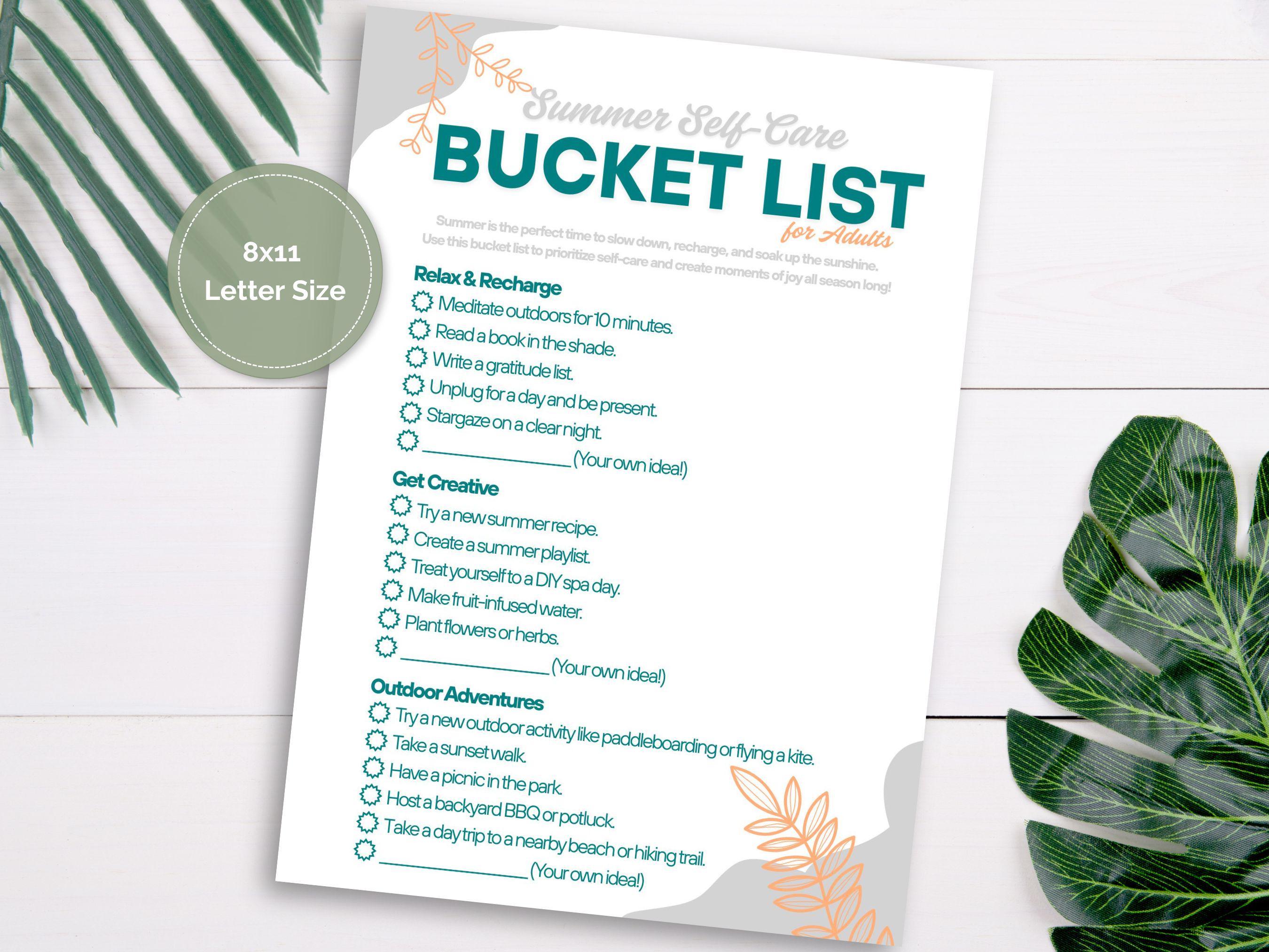 This bucket list is a digital download, making it easy to access and print instantly. Simply print it at home on standard 8.5x11" paper or card stock for added durability. Perfect for quick prep and a summer full of self-care!