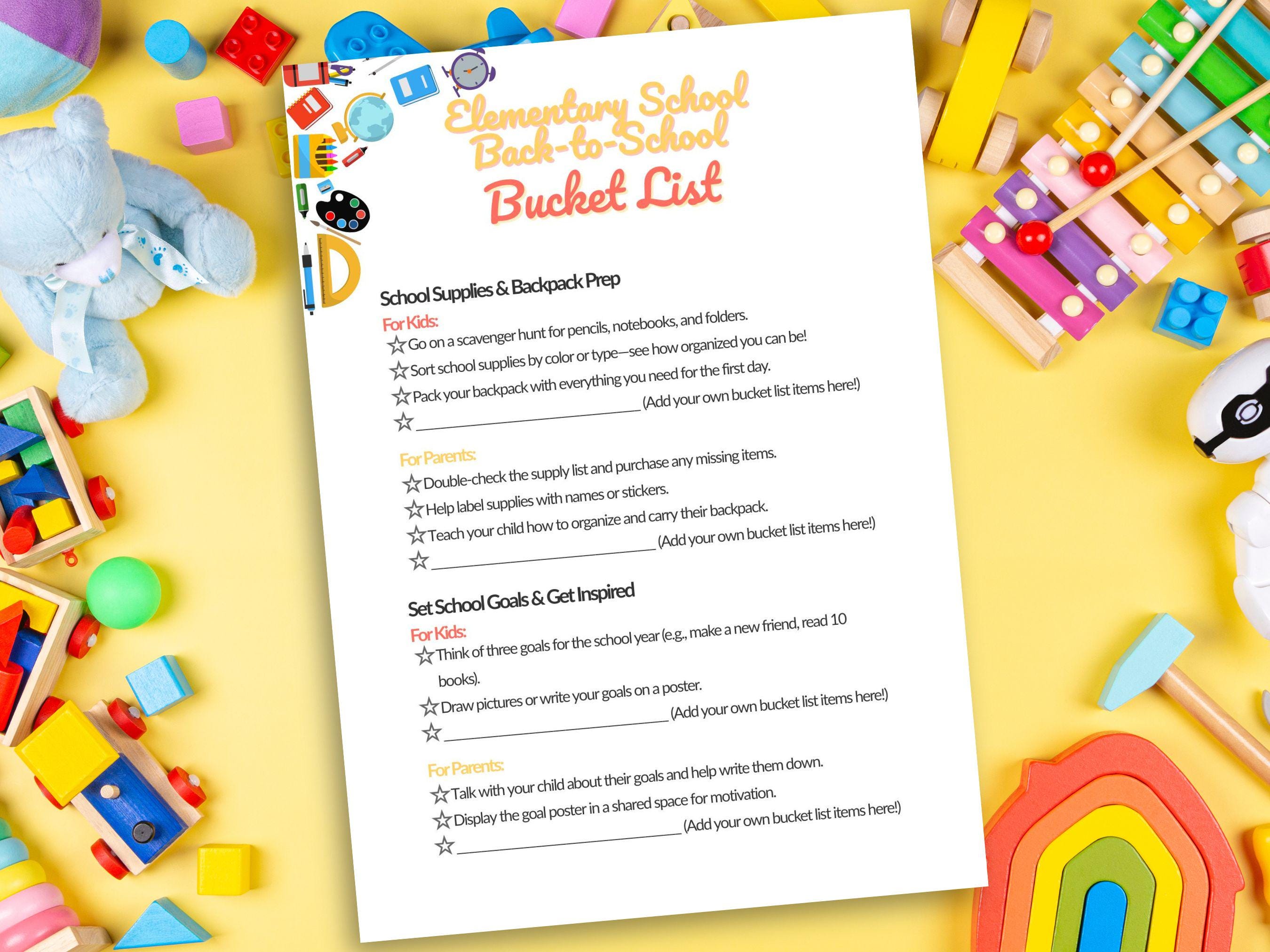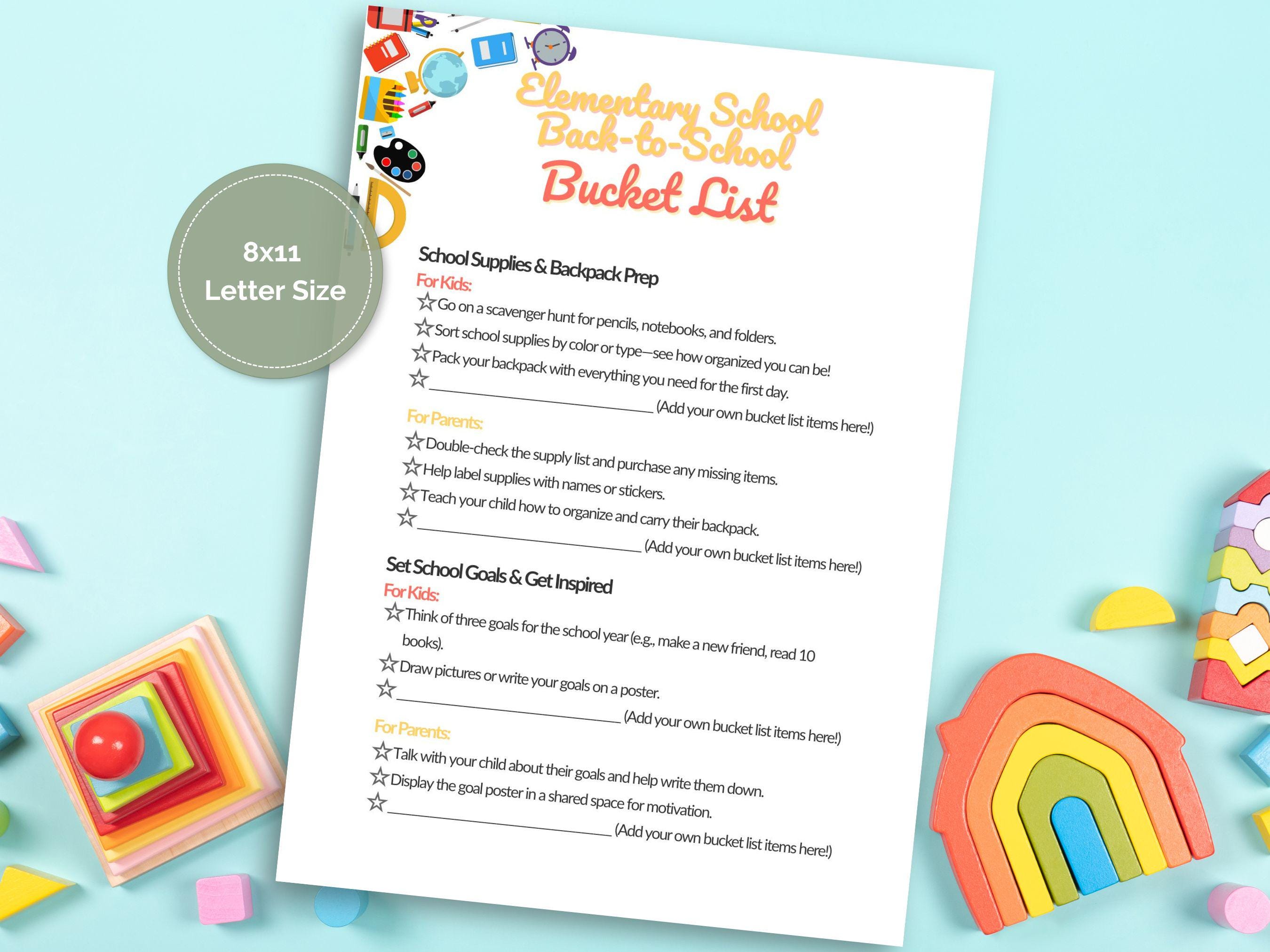 Elementary School Back-to-School Bucket List – Fun, Organized, and Stress-Free Prep for Kids & Parents 🎒 Make the transition back to school exciting and seamless with the Elementary School Back-to-School Bucket List! This thoughtfully designed printable is packed with practical, fun, and easy-to-follow activities to help both kids and parents prepare for a successful school year. From organizing supplies to building confidence, this bucket list ensures everyone feels ready, organized, and excited for the new adventures ahead.