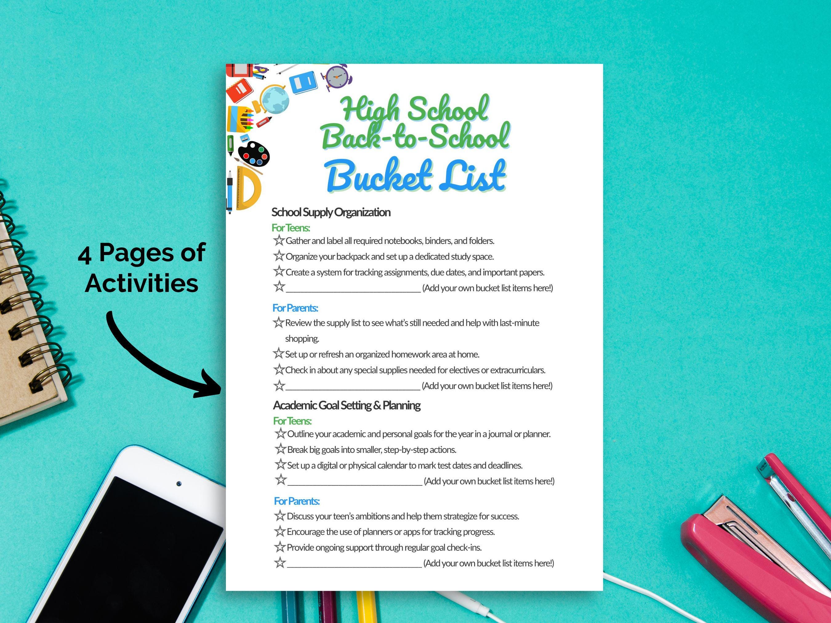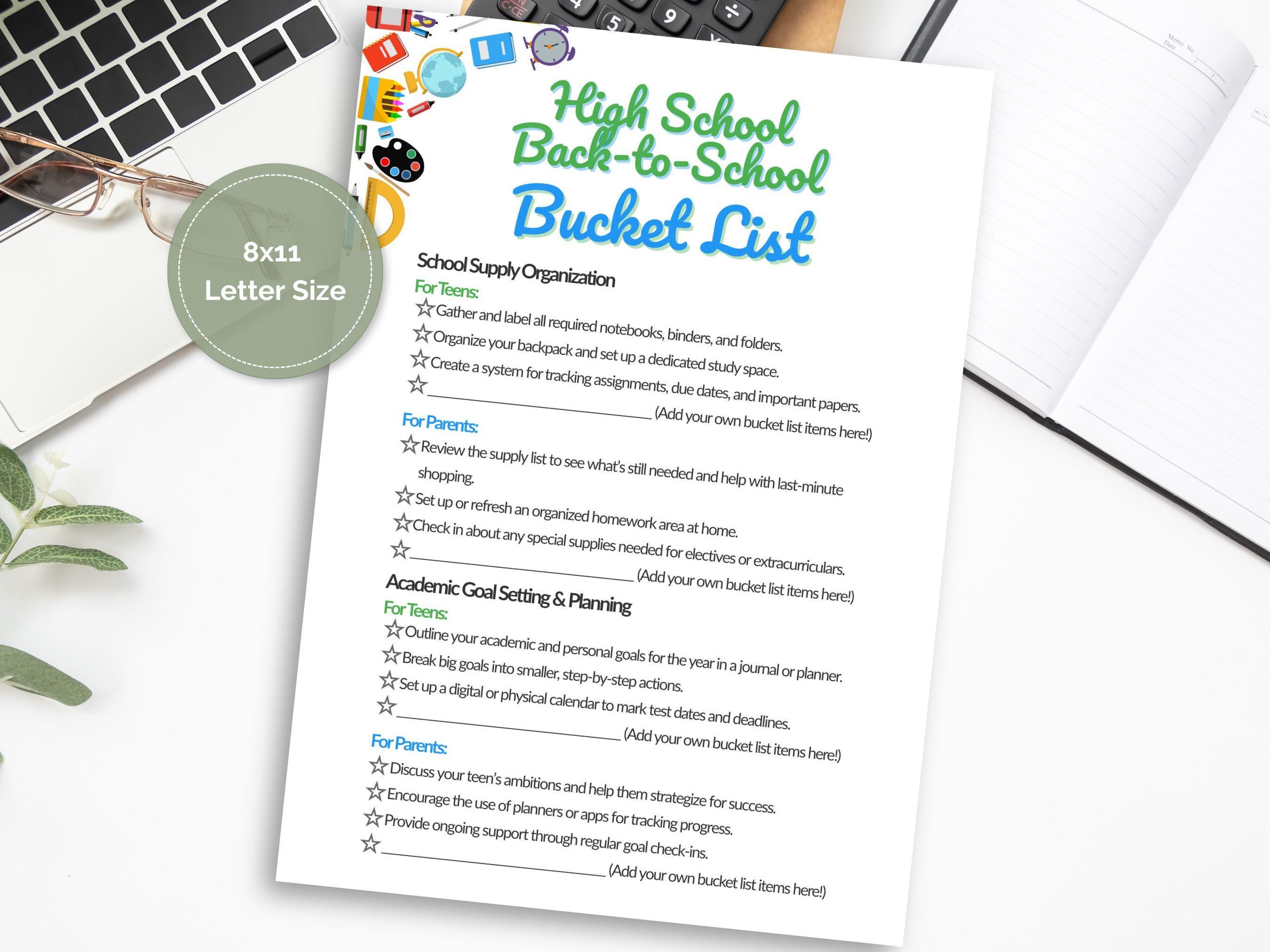 High School Back-to-School Bucket List – Fun, Organized, and Stress-Free Prep for Teens & Parents 🎓 Start the school year strong with the High School Back-to-School Bucket List! This thoughtfully designed printable is packed with practical, empowering, and fun activities to help both teens and parents prepare for a successful year. From organizing supplies to setting goals and building independence, this bucket list ensures everyone feels ready, confident, and excited for the challenges and opportunities ahead.