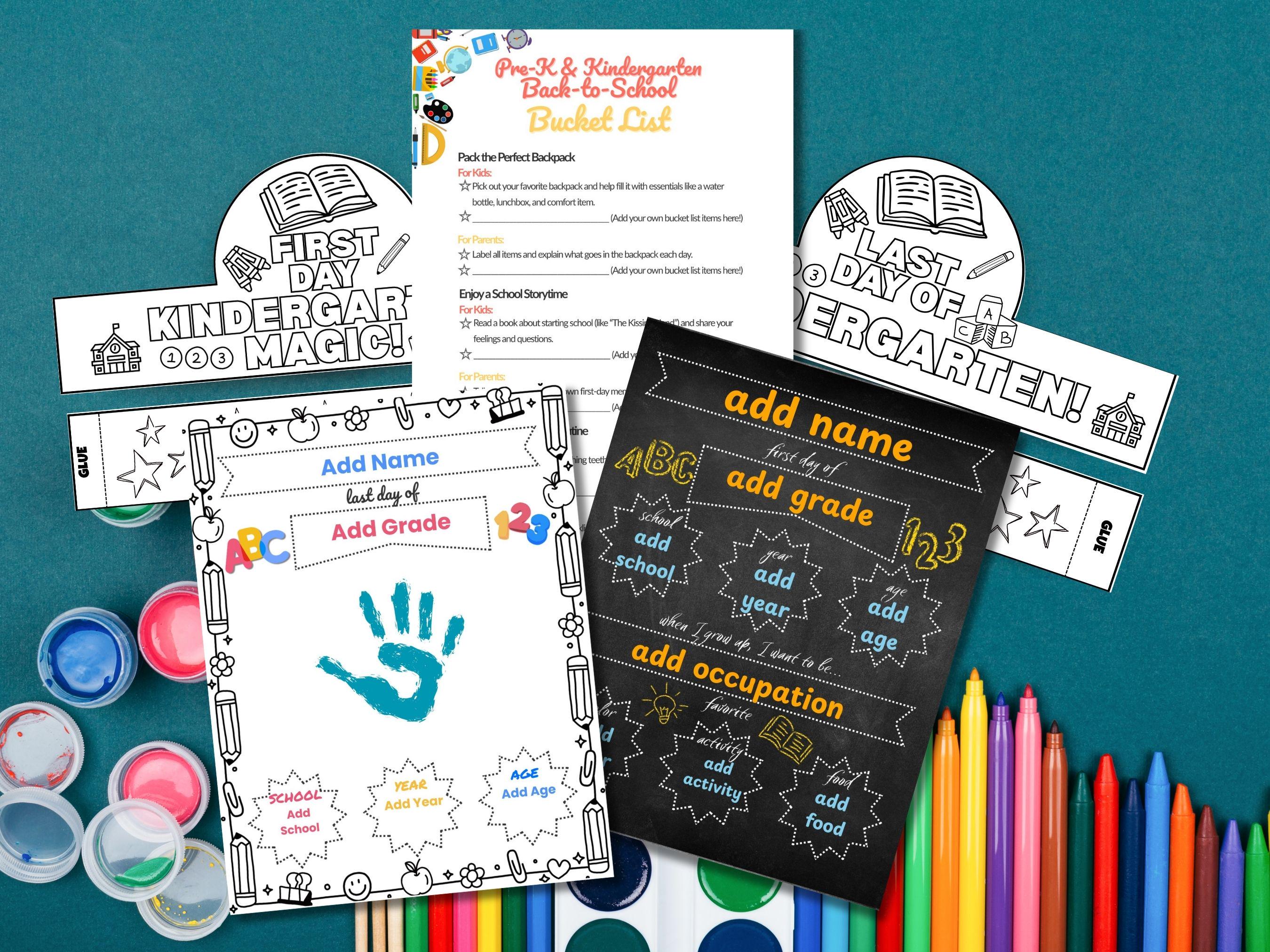 What’s Included: Customizable First & Last Day Chalkboard Signs (Editable in Canva) Add your child’s name, date, and other details to create a personalized keepsake. Customizable First & Last Day Handprint Signs (Editable in Canva) A sweet way to capture those tiny hands and create a lasting memory. Kindergarten Back-to-School Bucket List Fun activities to kick off the school year and make it unforgettable. First Day "Kindergarten Magic" Colorable Crown A creative and fun way to celebrate the first day of school. Last Day of Kindergarten Colorable Crown Celebrate the end of an amazing year with a crown your child can color and wear. Bonus Customizable Handprint Gift for Family (Editable in Canva) Create a heartfelt keepsake for grandparents or loved ones to treasure forever.