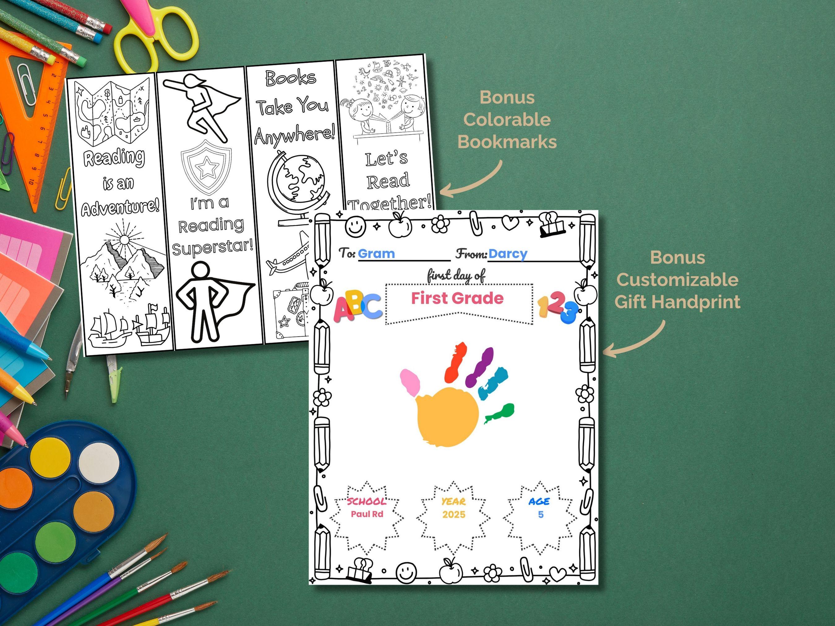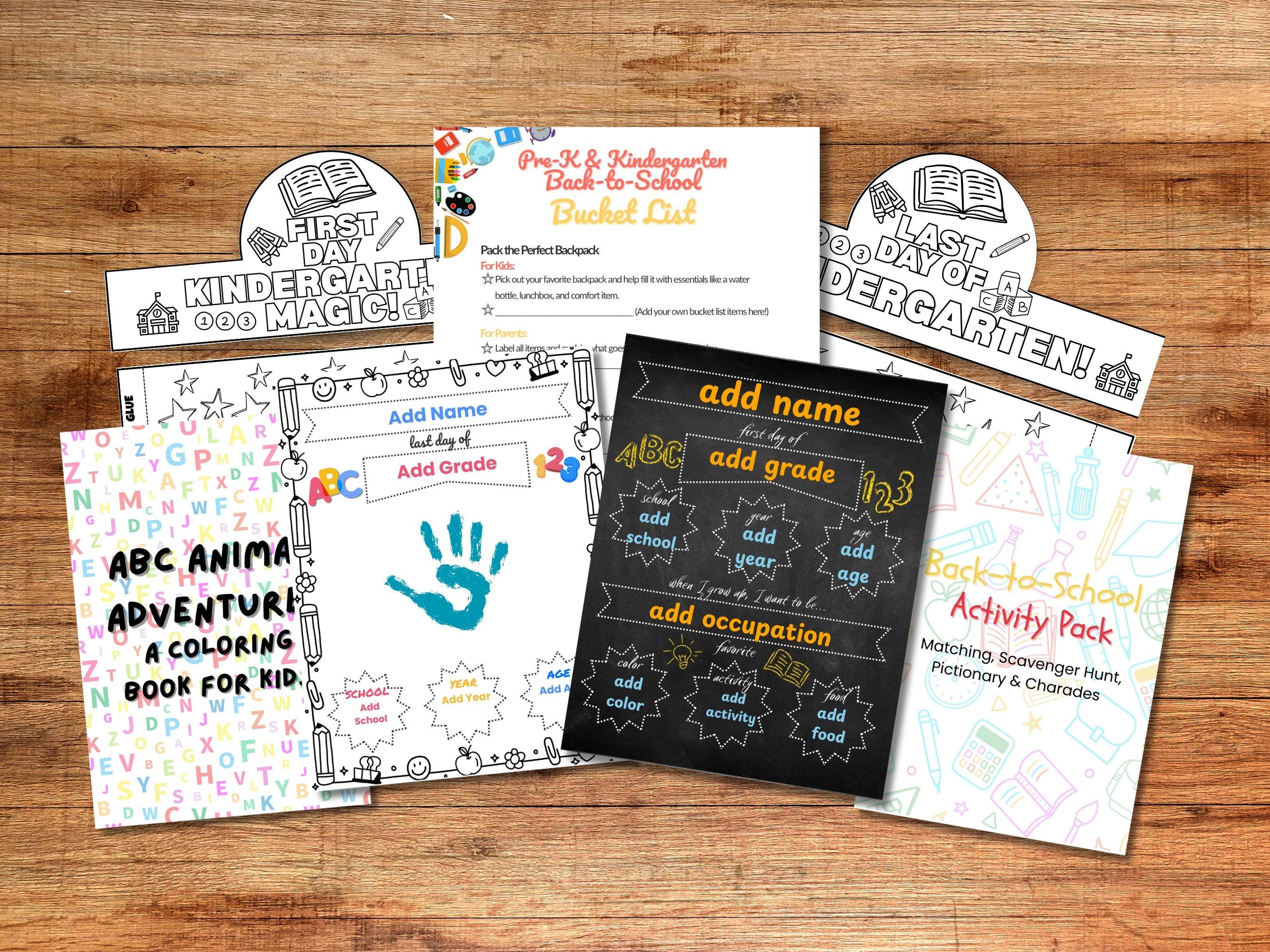 What’s Included: Keepsake Bundle: Customizable First & Last Day Chalkboard Signs (Editable in Canva) Add your child’s name, date, and other details to create a personalized keepsake. Customizable First & Last Day Handprint Signs (Editable in Canva) A sweet way to capture those tiny hands and create a lasting memory. Kindergarten Back-to-School Bucket List Fun and exciting activities to kick off the school year. First Day "Kindergarten Magic" Colorable Crown A creative and fun way to celebrate the first day of school. Last Day of Kindergarten Colorable Crown Celebrate the end of an amazing year with a crown your child can color and wear. Bonus Customizable Handprint Gift for Family (Editable in Canva) Create a heartfelt keepsake for grandparents or loved ones to treasure forever. Activity Bundle: ABC Animal Coloring Book A fun and educational coloring book featuring adorable animals for every letter of the alphabet. Back-to-School Games Memory Game: Boost your child’s memory skills with this fun matching game. Scavenger Hunt: A playful way to explore and learn while checking off items on the list. Pictionary & Charades: Encourage creativity and laughter with these classic games tailored for Kindergarten. Bonus Bookmarks Cute and colorful bookmarks to encourage a love for reading.
