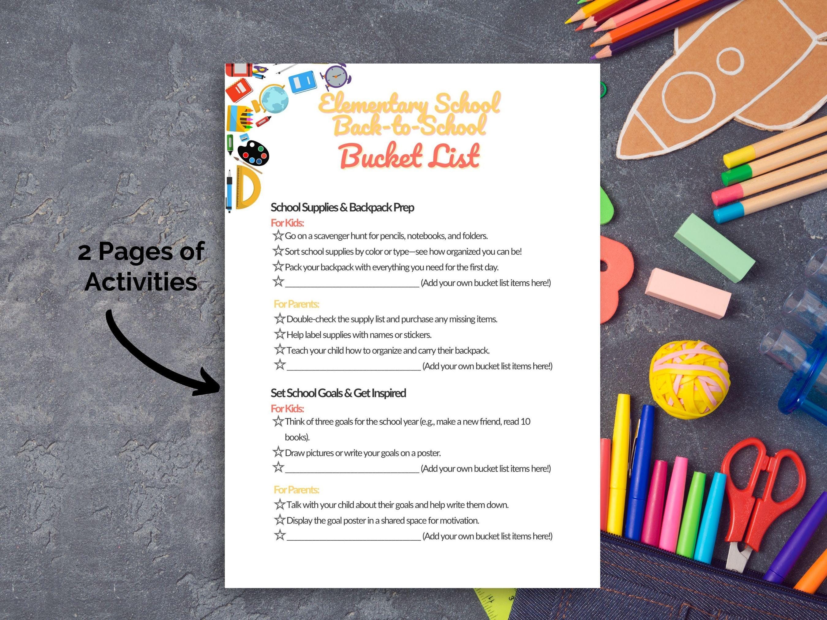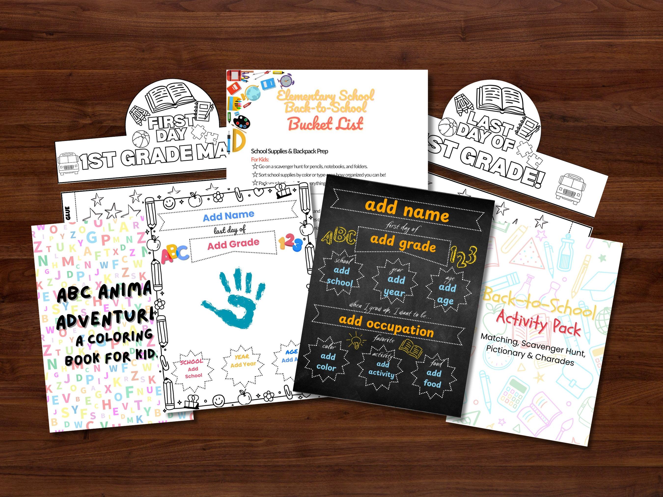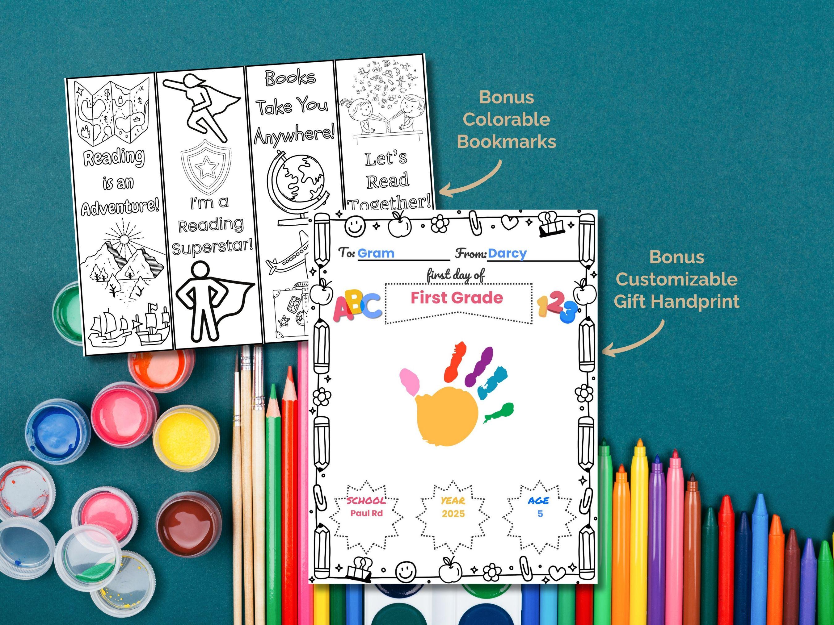 What’s Included: Keepsake Bundle: Customizable First & Last Day Chalkboard Signs (Editable in Canva) Add your child’s name, date, and other details to create a personalized keepsake. Customizable First & Last Day Handprint Signs (Editable in Canva) A sweet way to capture those tiny hands and create a lasting memory. Elementary School Back-to-School Bucket List Fun and exciting activities to kick off the school year. First Day "First Grade Magic" Colorable Crown A creative and fun way to celebrate the first day of school. Last Day of First Grade Colorable Crown Celebrate the end of an amazing year with a crown your child can color and wear. Bonus Customizable Handprint Gift for Family (Editable in Canva) Create a heartfelt keepsake for grandparents or loved ones to treasure forever. Activity Bundle: ABC Animal Coloring Book A fun and educational coloring book featuring adorable animals for every letter of the alphabet. Back-to-School Games Memory Game: Boost your child’s memory skills with this fun matching game. Scavenger Hunt: A playful way to explore and learn while checking off items on the list. Pictionary & Charades: Encourage creativity and laughter with these classic games tailored for First Grade. Bonus Bookmarks Cute and colorful bookmarks to encourage a love for reading.