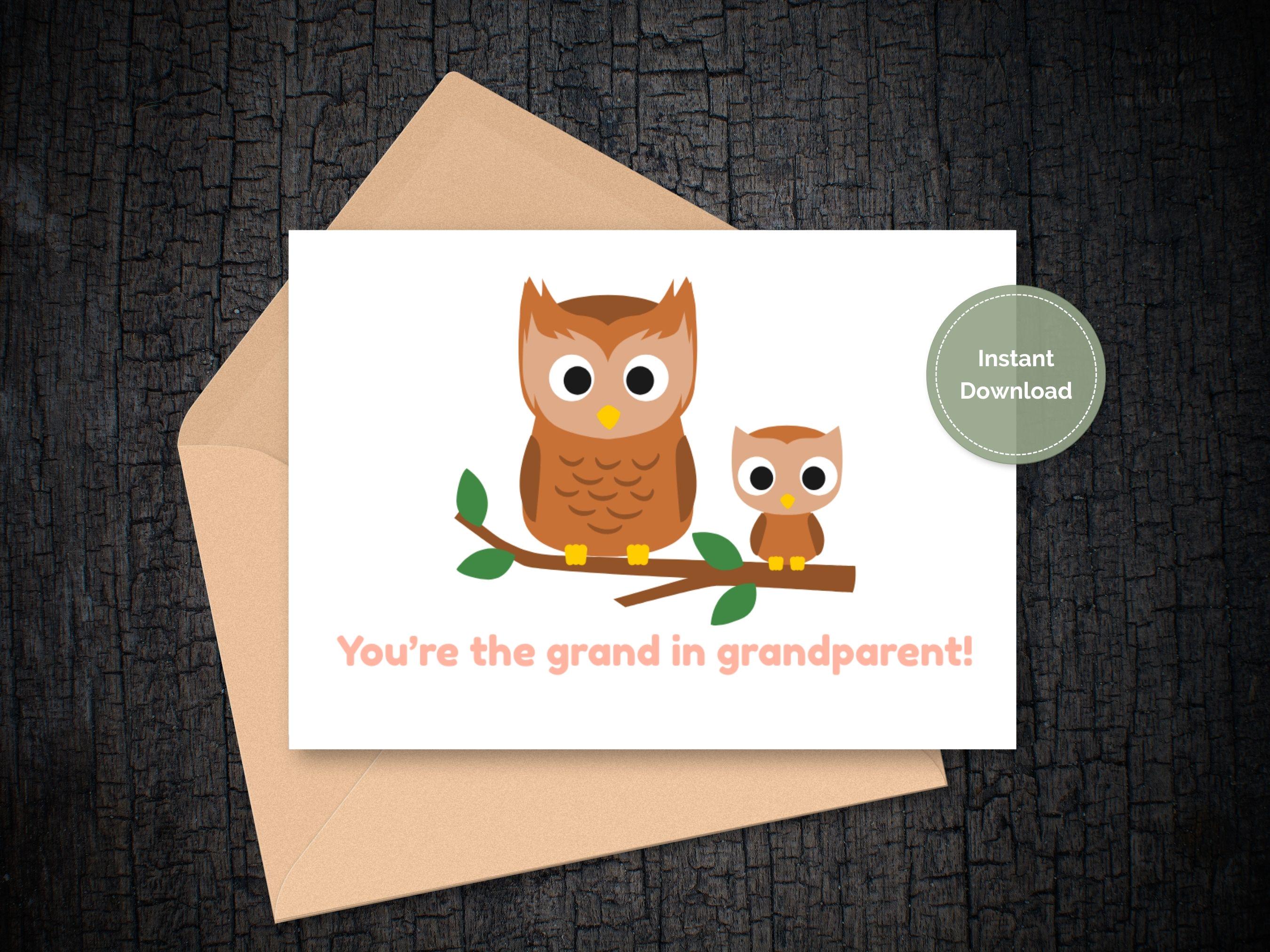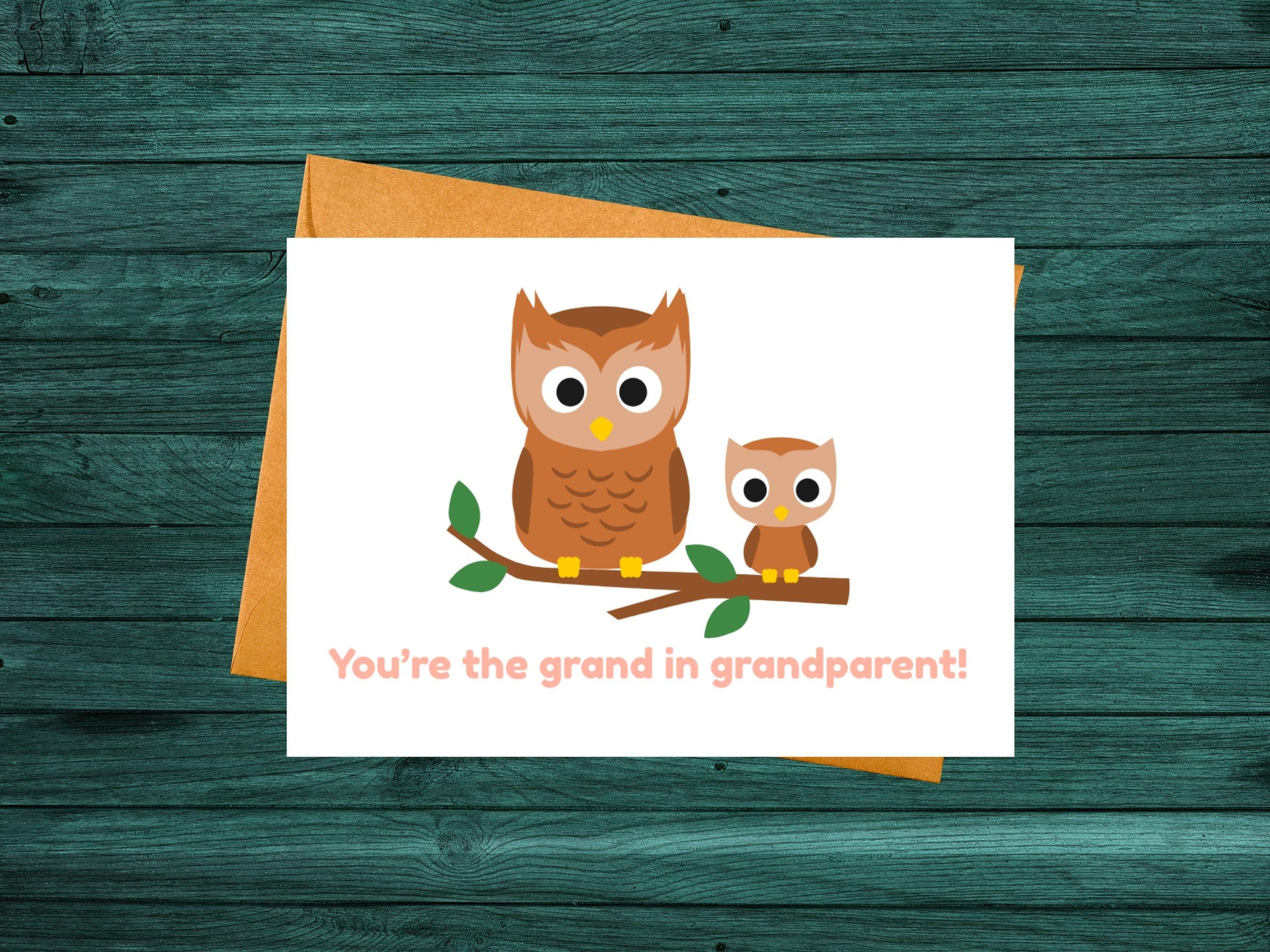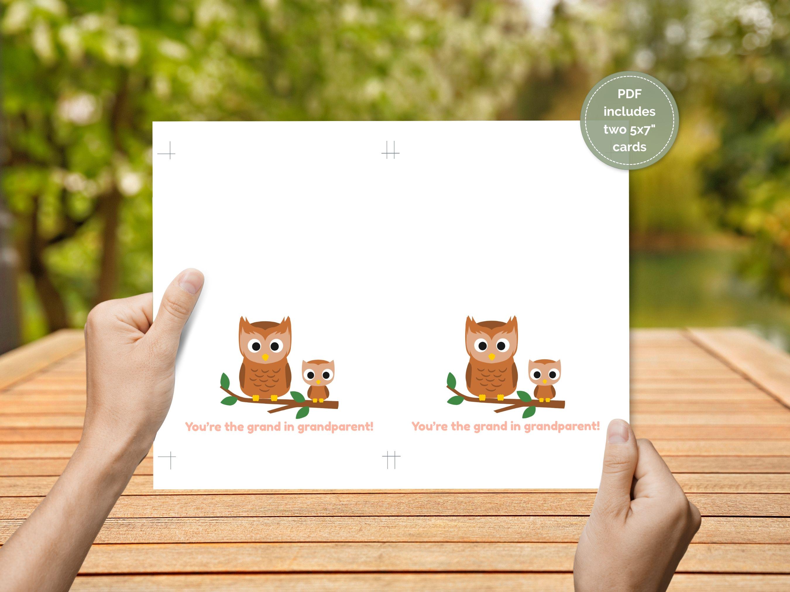 DESIGN FEATURES Adorable Owl Illustration: A sweet duo of cartoon owls, symbolizing the bond between grandparents and grandchildren. Playful Typography: The message "You’re the grand in grandparent!" adds a fun and loving touch. Soft, Cheerful Colors: Warm browns, greens, and pinks create a cozy and inviting design. Print-Ready Layout: Designed for easy at-home printing or professional services.