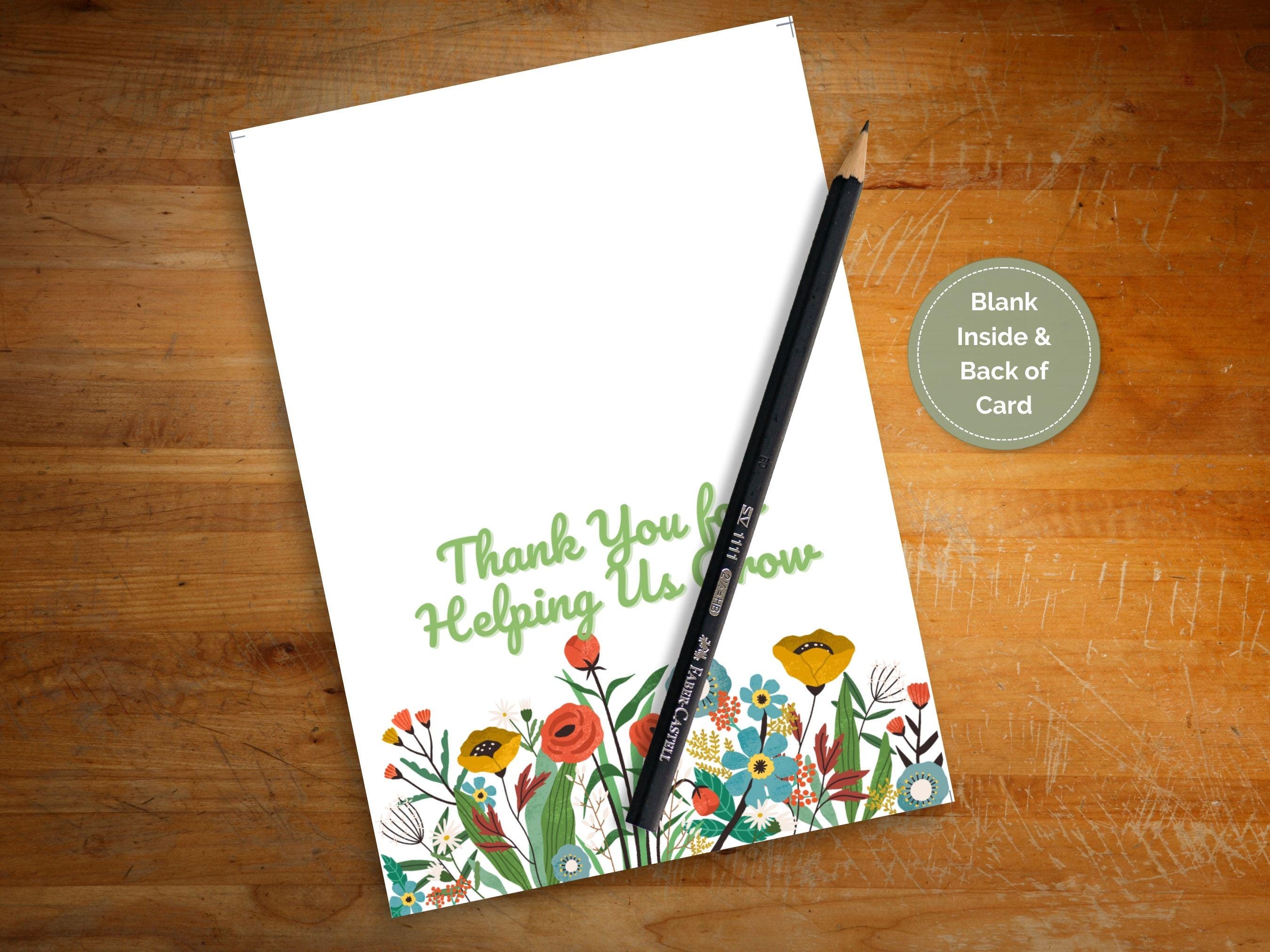 DESIGN FEATURES Heartfelt Message: The phrase "Thank You for Helping Us Grow" is elegantly displayed in a green cursive font, making it perfect for expressing gratitude. Vibrant Floral Design: A colorful arrangement of flowers and greenery adorns the bottom of the card, adding a cheerful and warm touch. Versatile Use: Ideal for Grandparents Day, Teacher Appreciation Week, birthdays, or any occasion to show your appreciation. Print-Ready Layout: Designed for easy at-home printing or professional services.