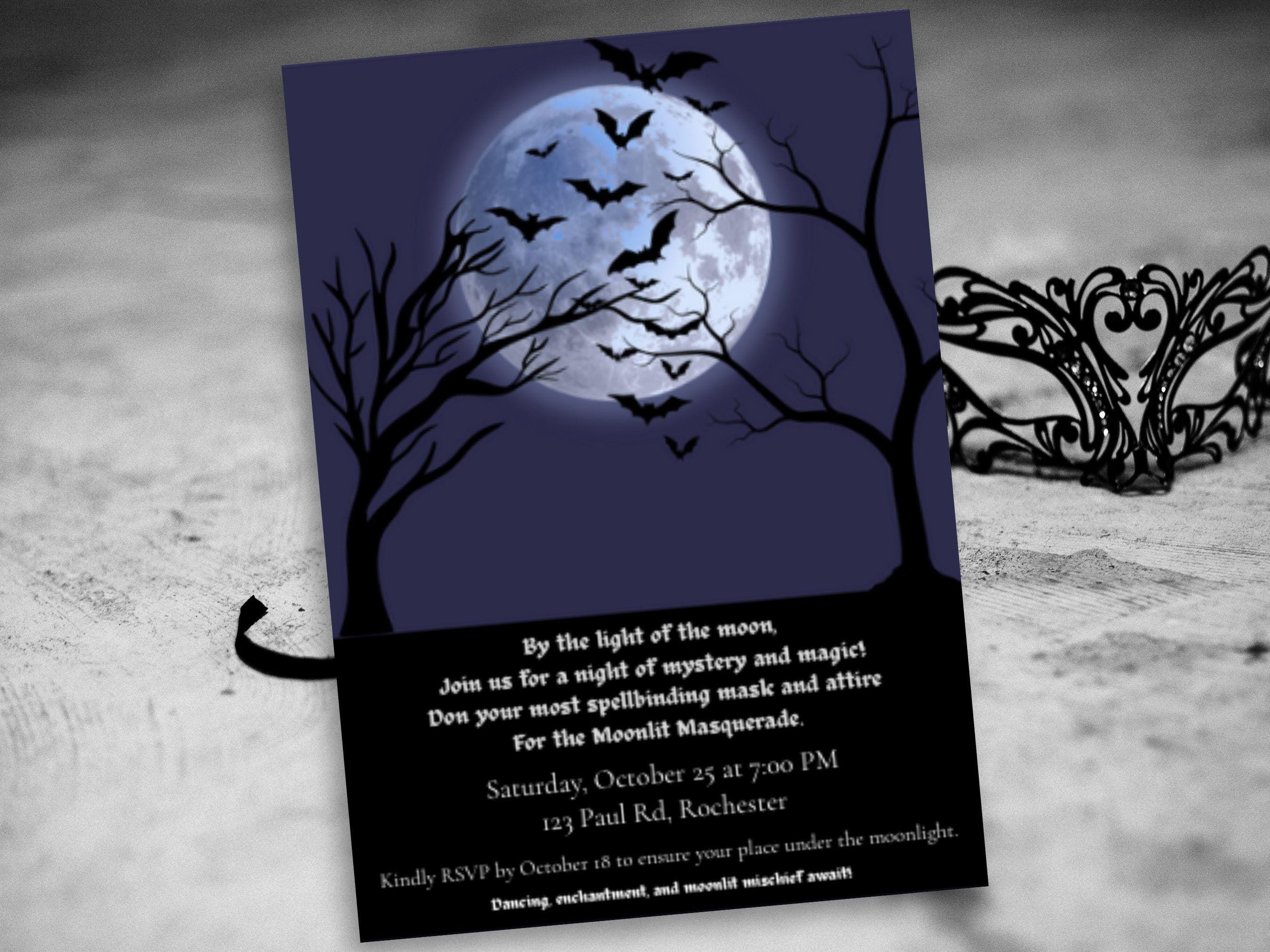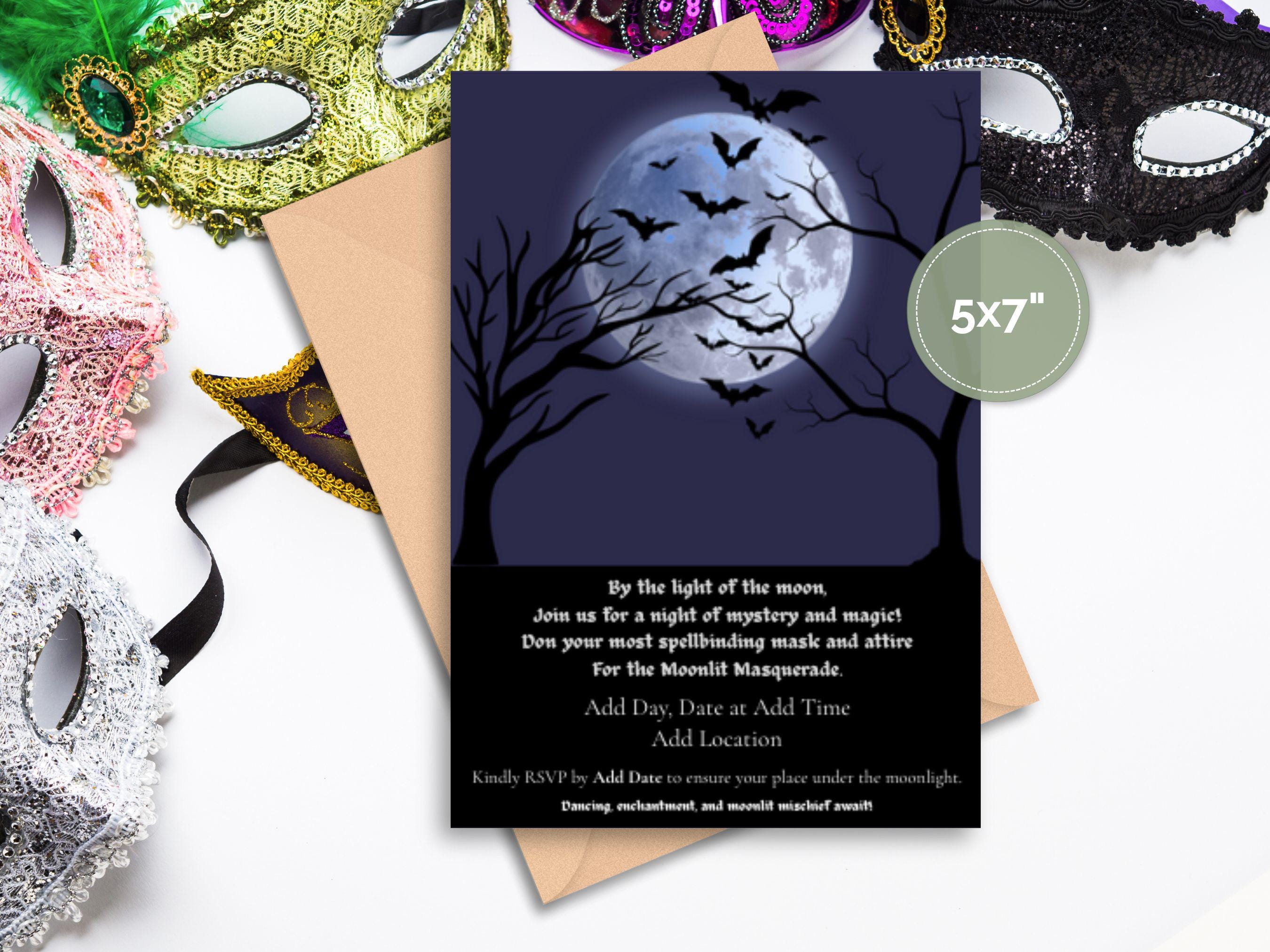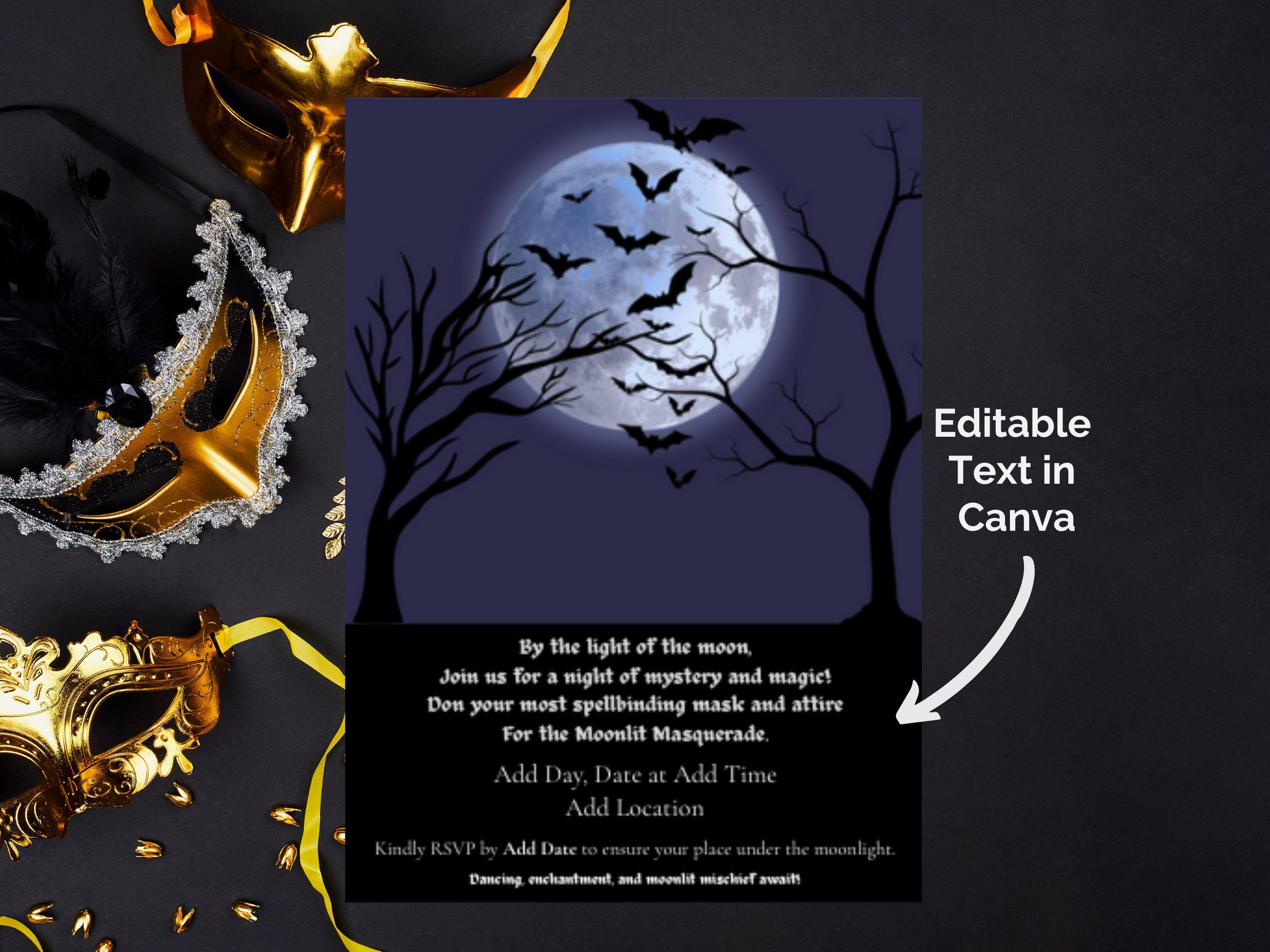Moonlit Masquerade Halloween Party Invitation - Editable Canva Template Set the stage for an unforgettable evening with our Moonlit Masquerade Halloween Party Invitation. This digital download features an elegant and mysterious design, with a glowing full moon, silhouetted trees, and bats in flight, transporting your guests into a magical night under the stars. Perfect for masquerade balls, Halloween gatherings, or other enchanting celebrations, this invitation captures the essence of a sophisticated and spooky affair.