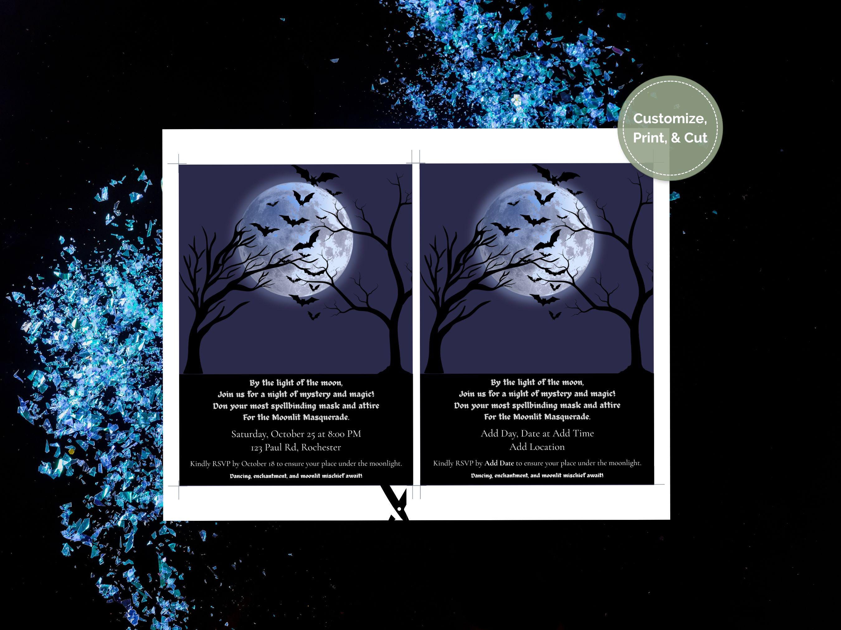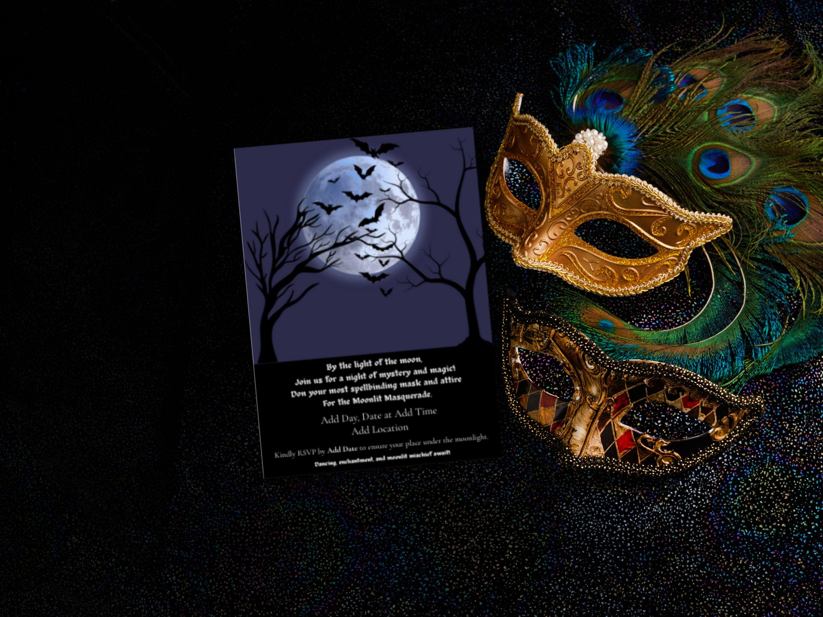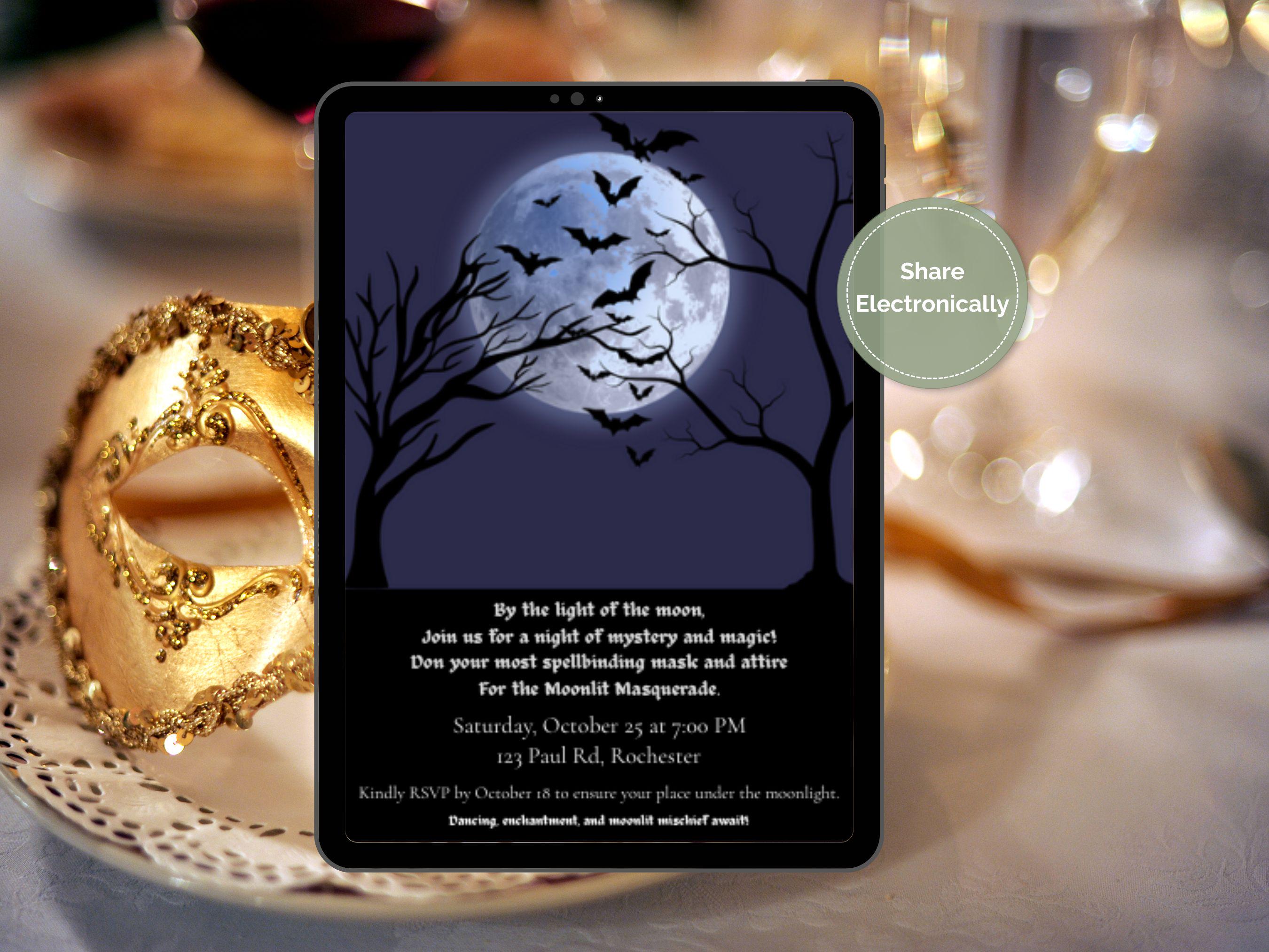 Moonlit Masquerade Halloween Party Invitation - Editable Canva Template Set the stage for an unforgettable evening with our Moonlit Masquerade Halloween Party Invitation. This digital download features an elegant and mysterious design, with a glowing full moon, silhouetted trees, and bats in flight, transporting your guests into a magical night under the stars. Perfect for masquerade balls, Halloween gatherings, or other enchanting celebrations, this invitation captures the essence of a sophisticated and spooky affair.