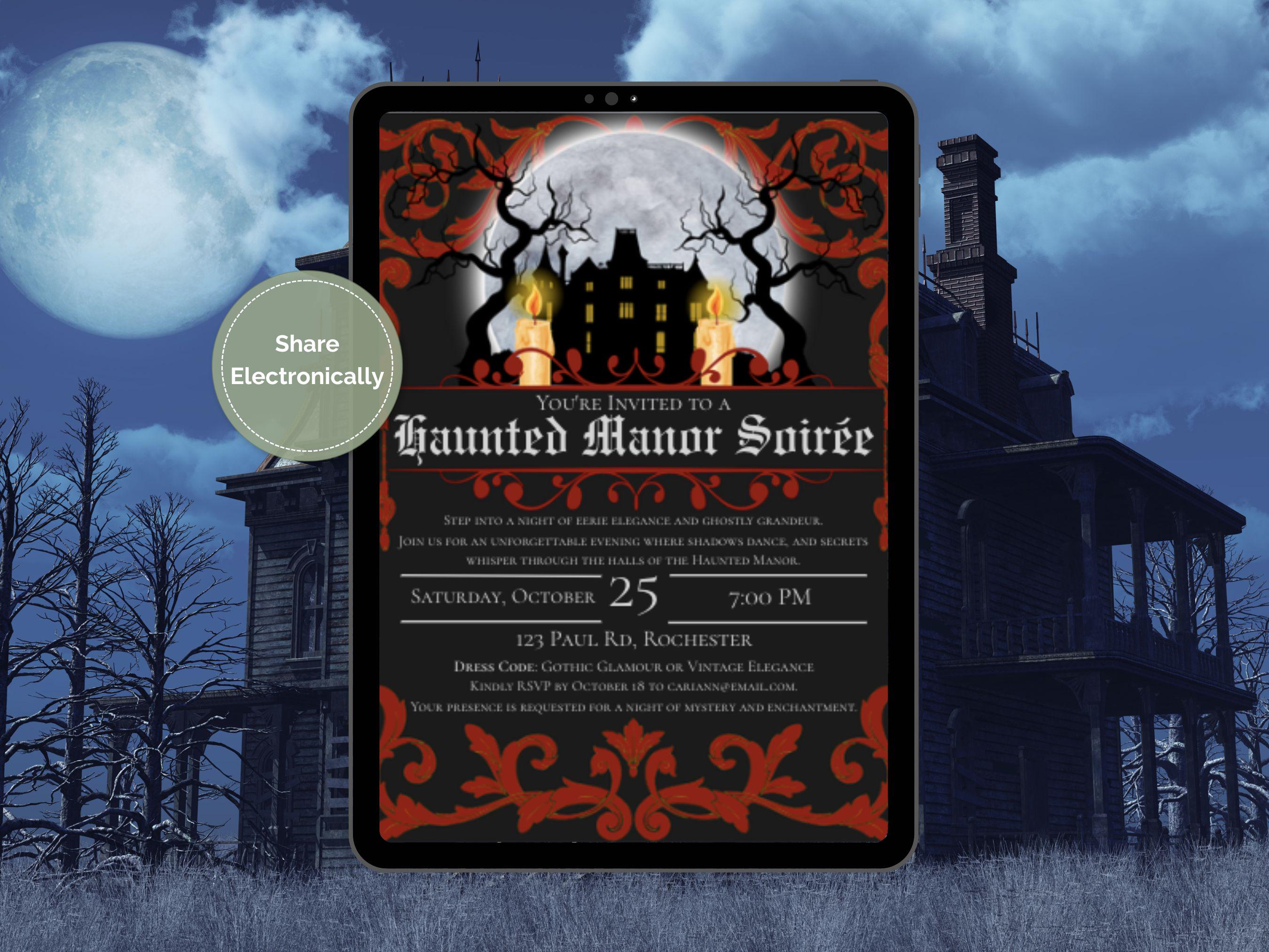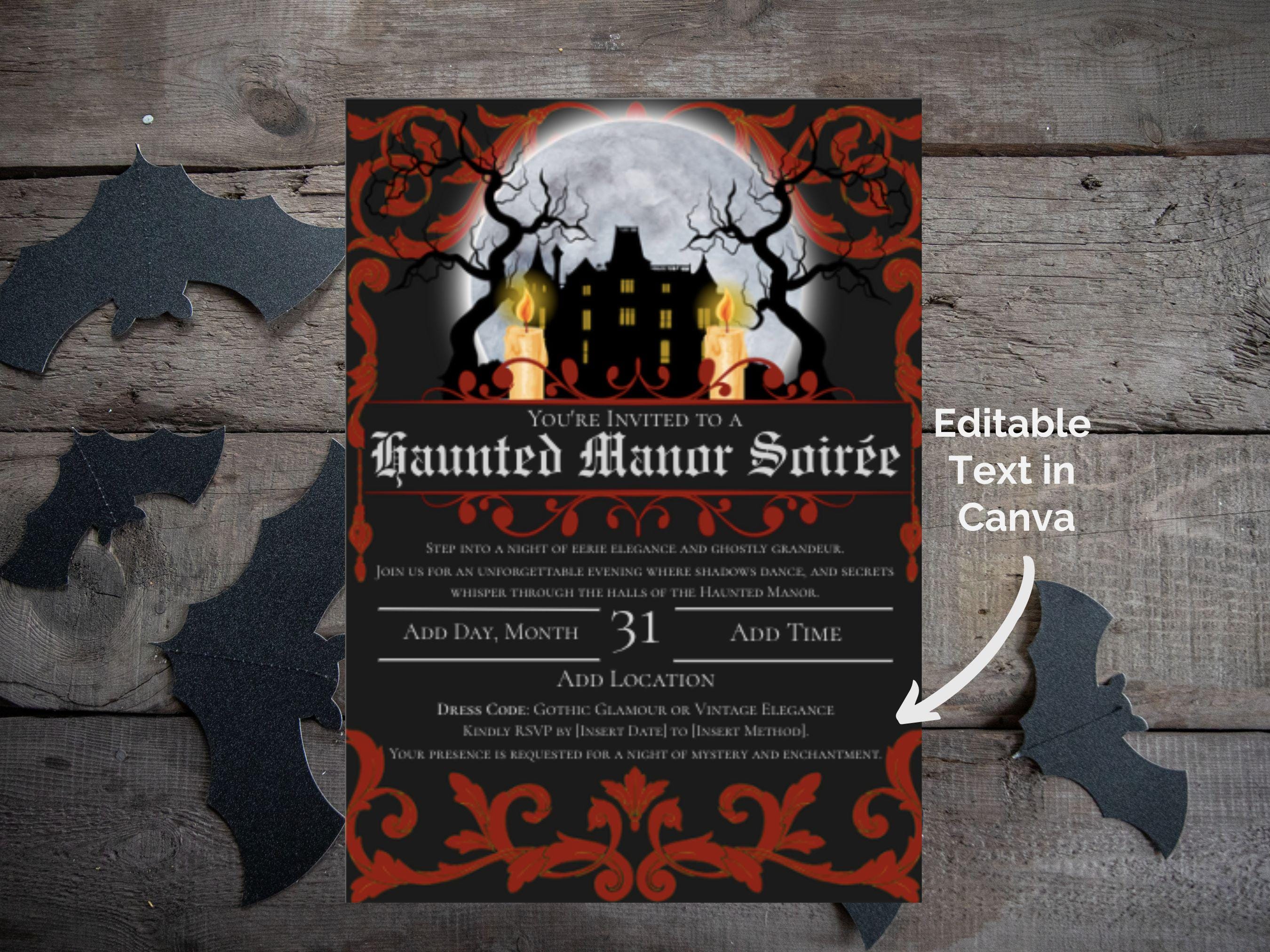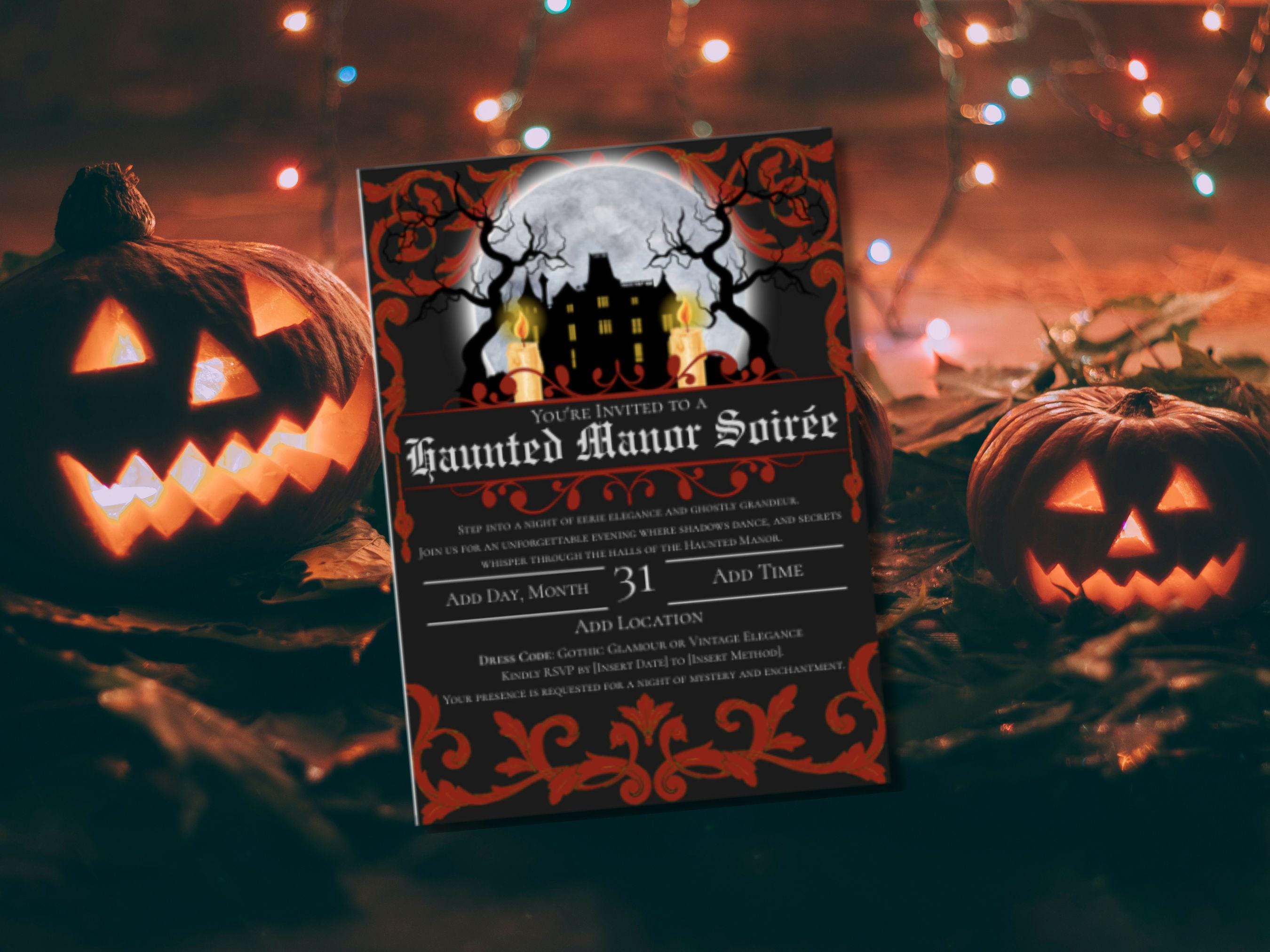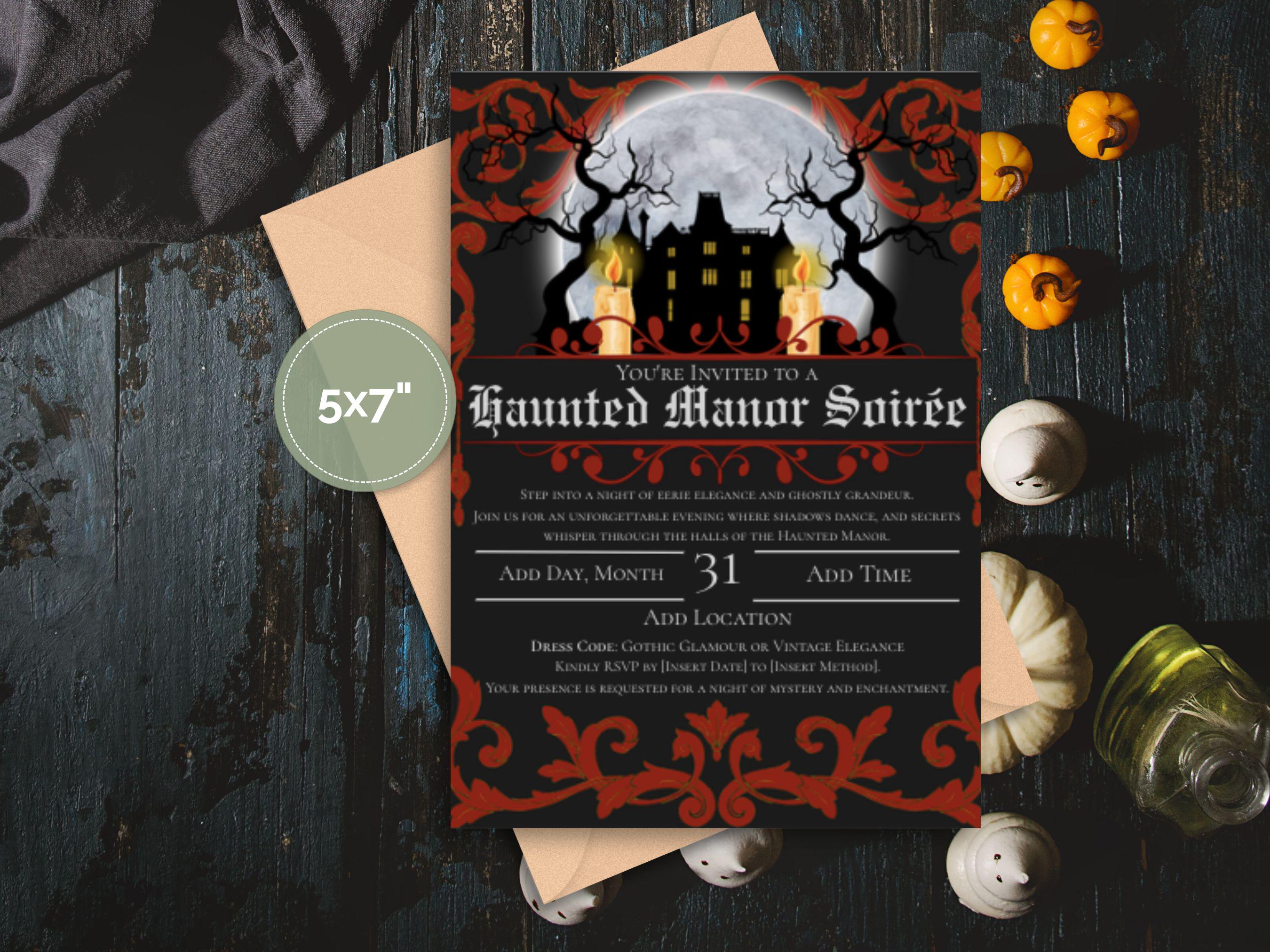 Make It a Night to Remember with This Editable Halloween Invitation Template Set the scene for an unforgettable Halloween gathering with this Editable Haunted Manor Soirée Invitation Template! Perfect for those who appreciate gothic glamour and eerie elegance, this invitation captures the spirit of mystery and sophistication, ensuring your event feels as captivating as the night itself.