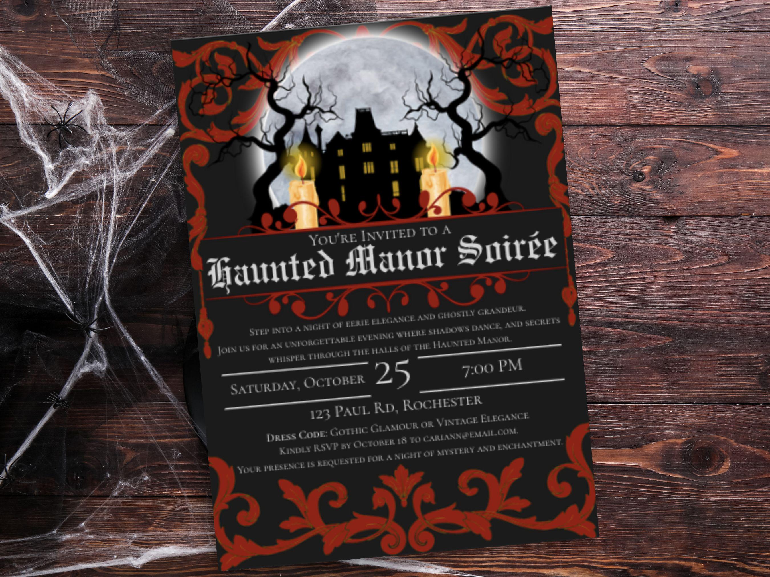 Create an invitation that not only informs but dazzles! Elevate your gothic party with this Halloween invitation and make your Haunted Manor soirée truly unforgettable.