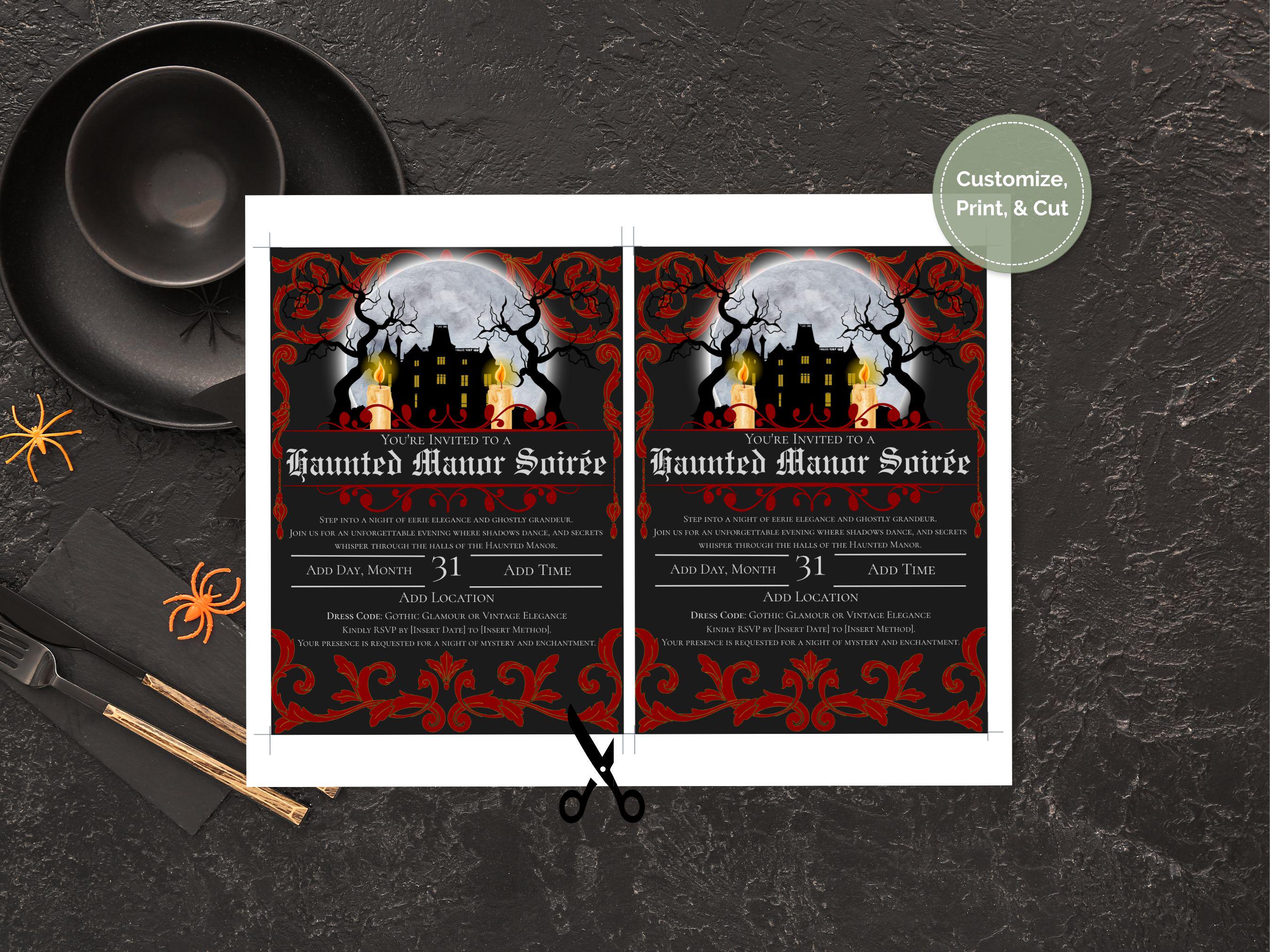 Why You’ll Love This Template: Editable and Customizable in Canva Personalize every detail with ease—edit the text for your event’s date, time, location, and more, all directly in Canva. No design experience needed—just point, click, and update the invitation to match your vision for the evening. Instant Download No waiting required! After purchase, you’ll receive an instant download and access to the Canva template so you can start customizing your invitations right away. Exquisite Design Details Featuring a haunted manor silhouette against the glow of a full moon, framed by twisted tree branches, ornate red floral scrollwork, and glowing lanterns, this template radiates gothic elegance. Its formal, vintage-inspired font completes the look, perfectly setting the tone for your soirée.