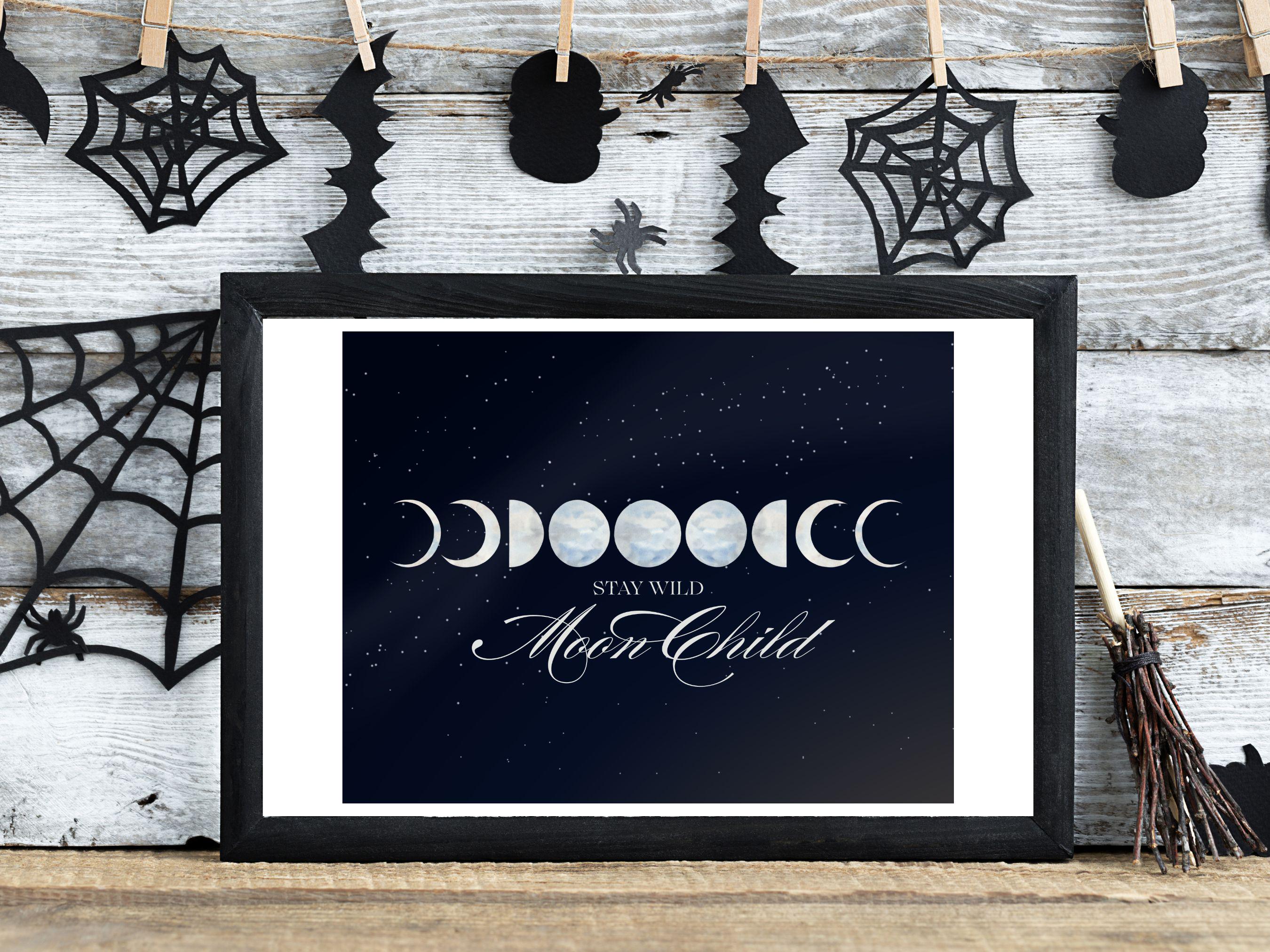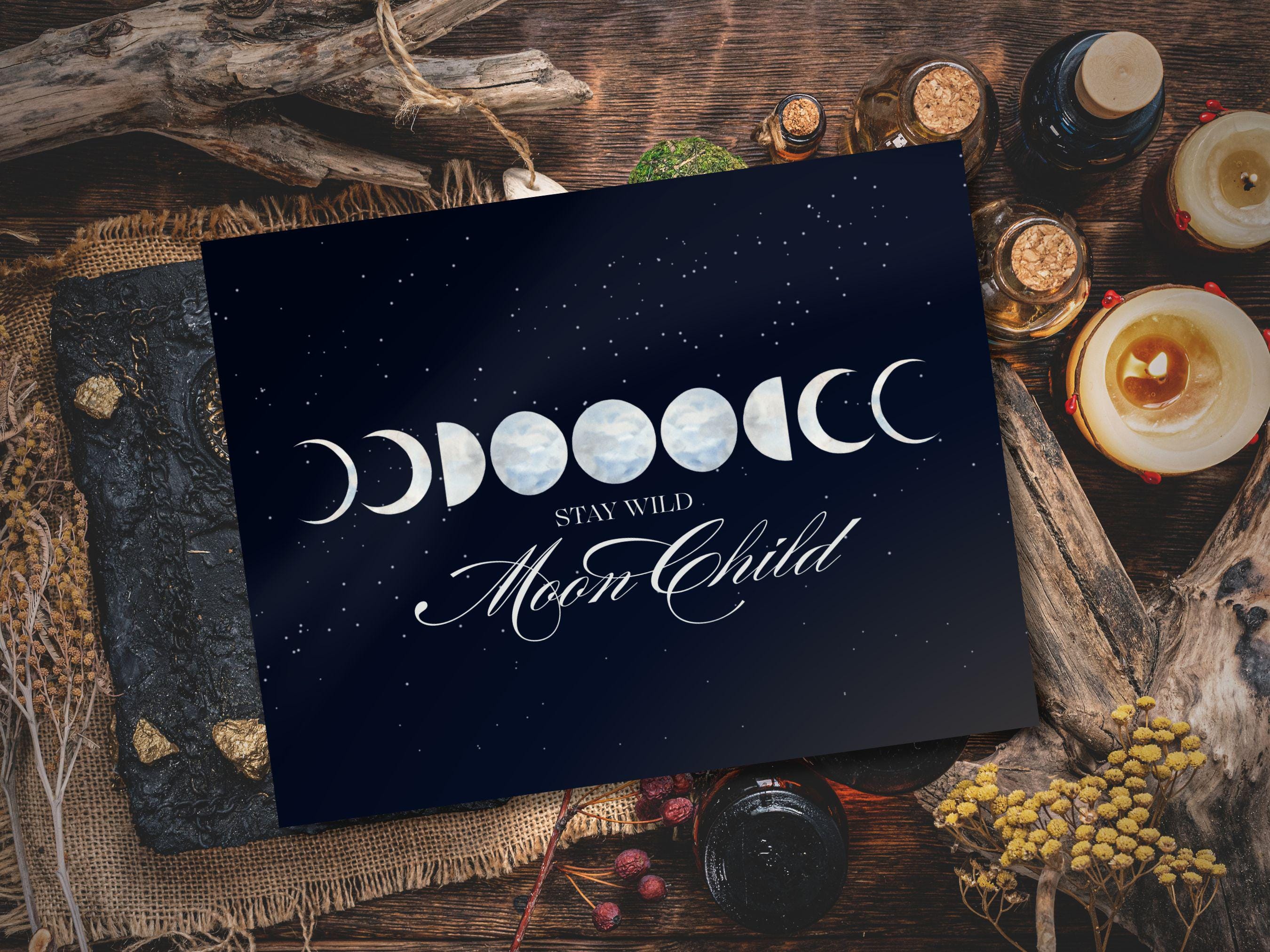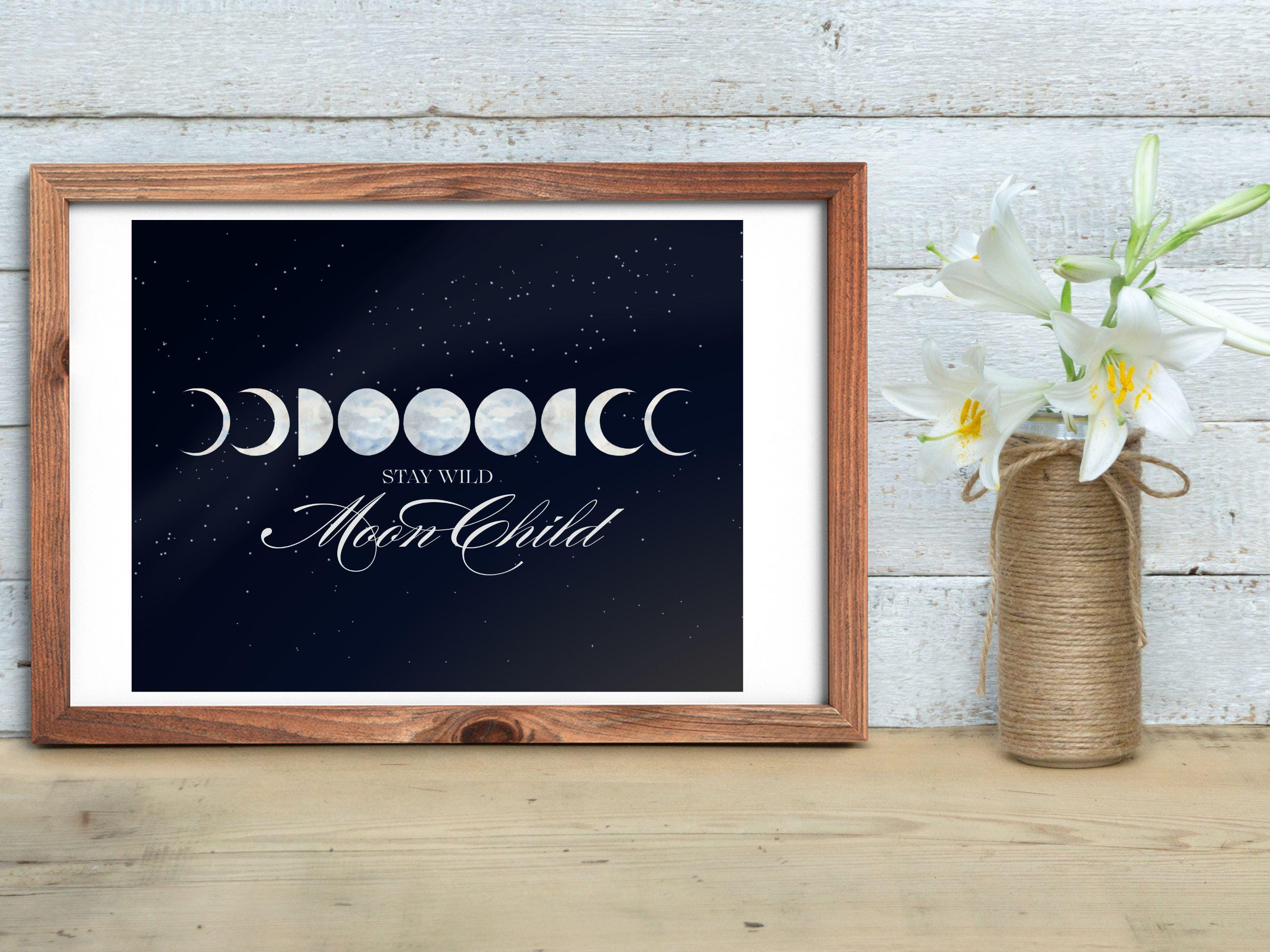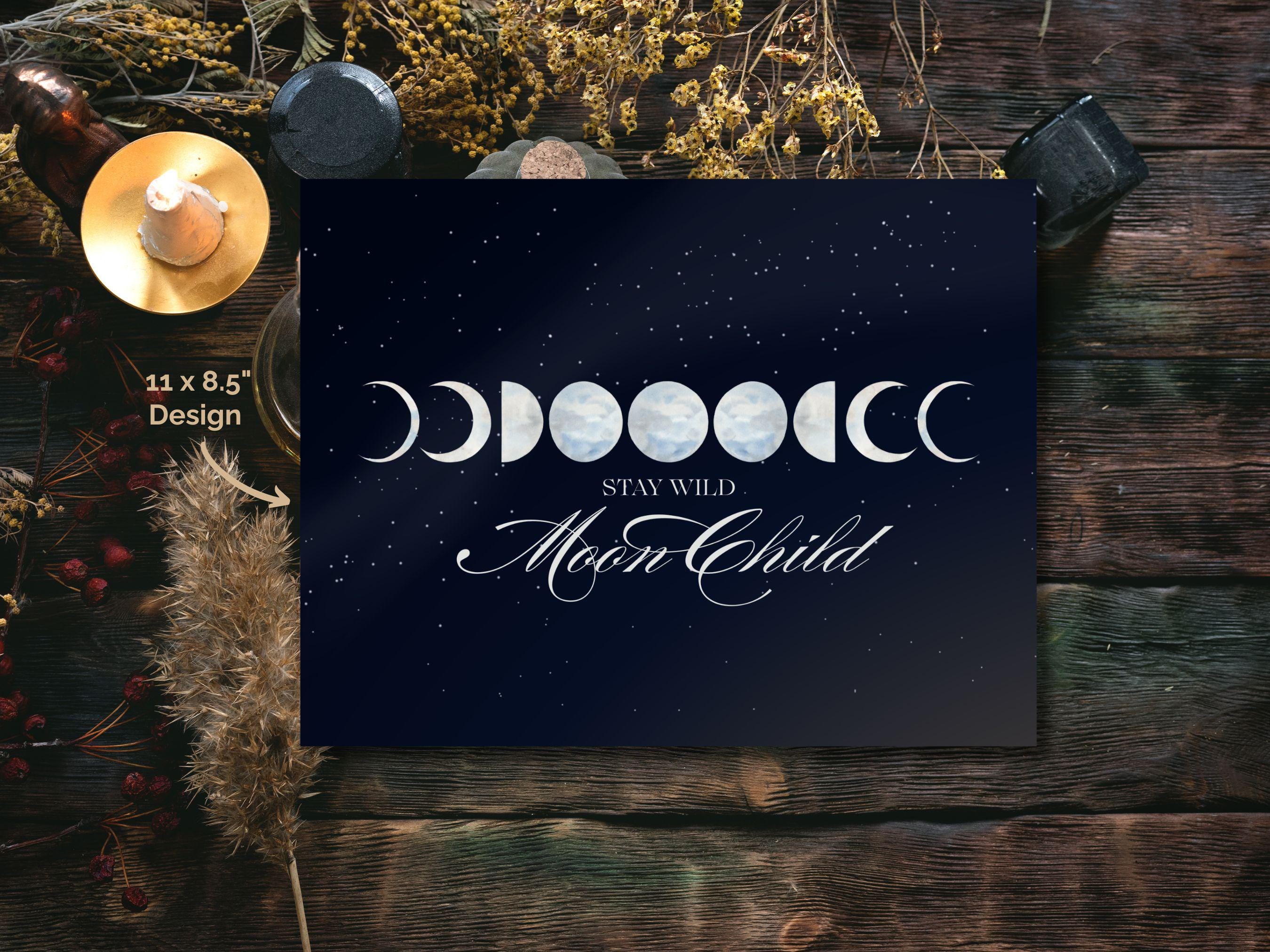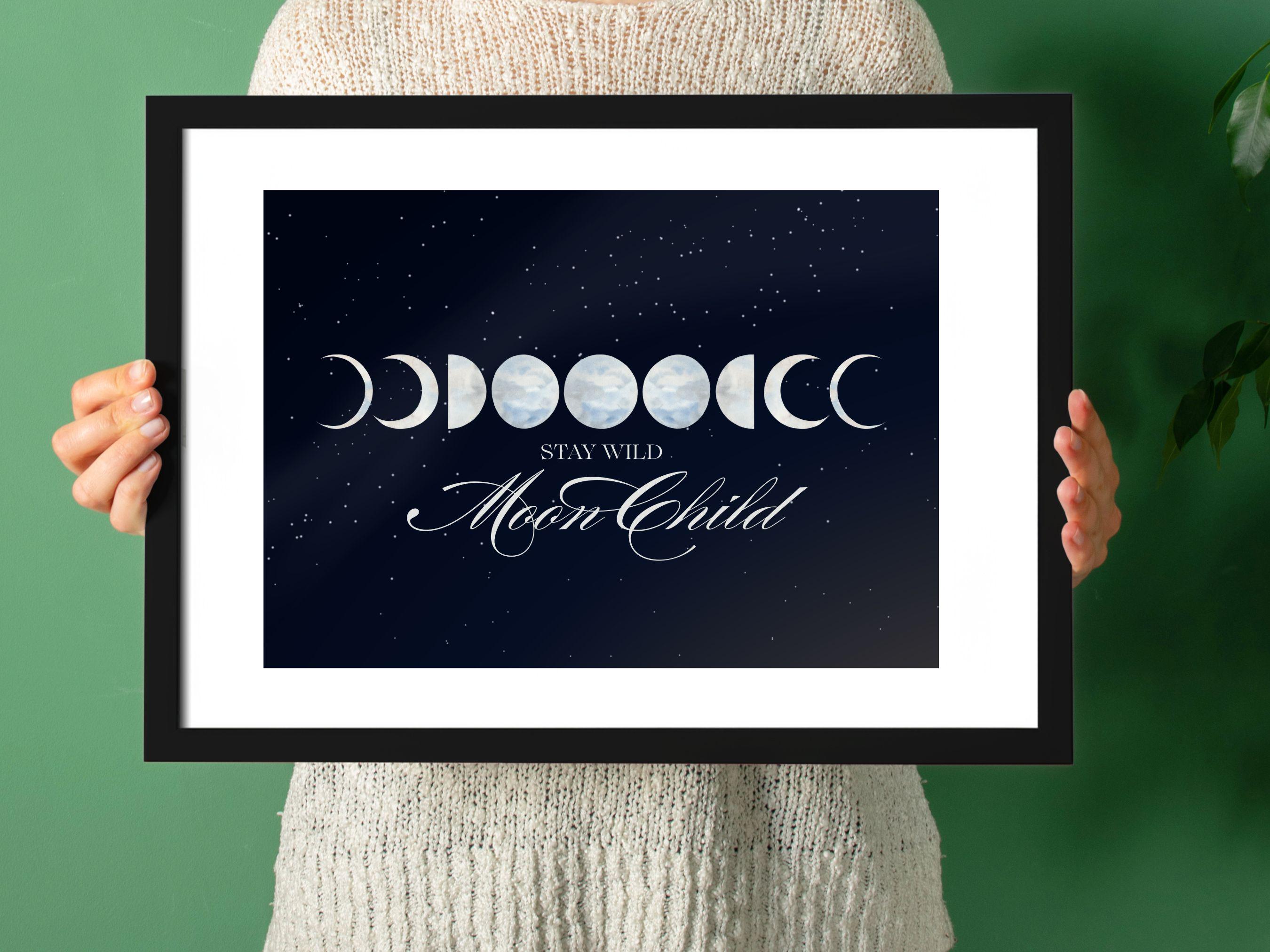 Key Features Celestial Design: Showcasing the phases of the moon in a captivating horizontal layout, this artwork pays homage to the magic of the night sky. Inspirational Text: Featuring the uplifting phrases "STAY WILD" and "Moon Child," it’s a daily reminder to stay true to your spirited and adventurous nature. Starry Night Backdrop: The deep navy and black gradient sprinkled with shimmering stars creates a serene and mystical ambiance. Premium Quality: Crafted with meticulous attention to detail and textured watercolor-like elements for an artistic and otherworldly vibe.