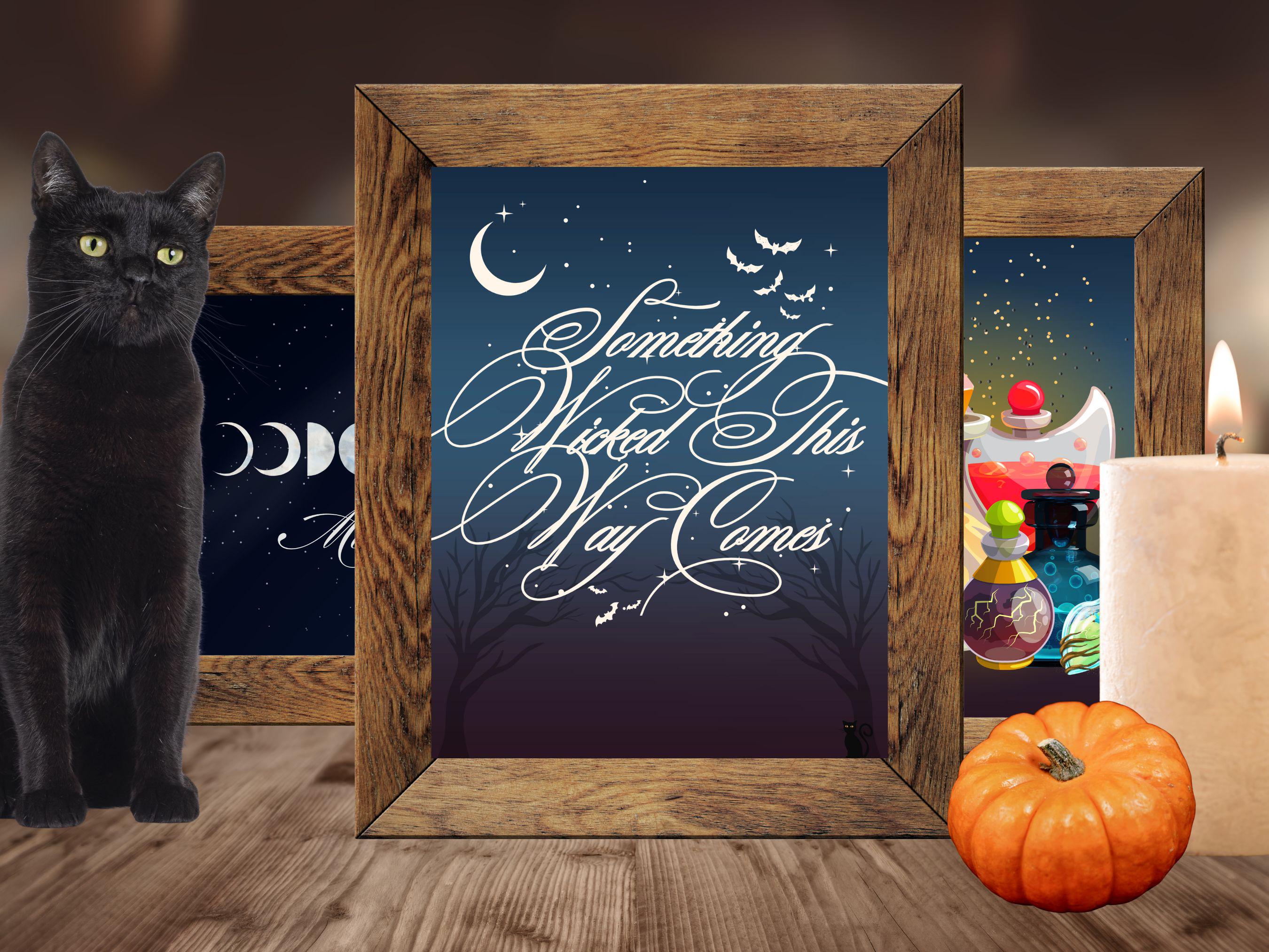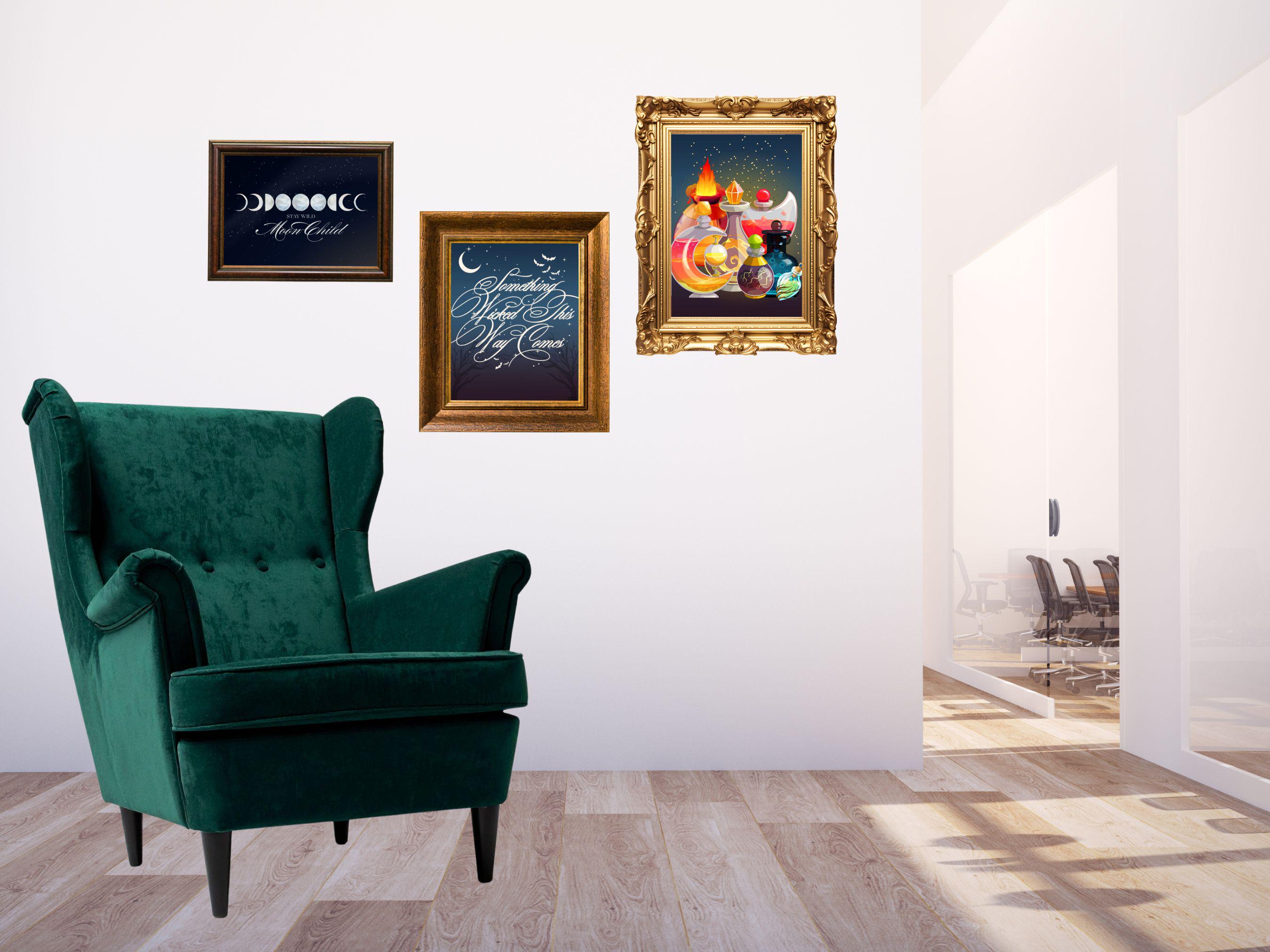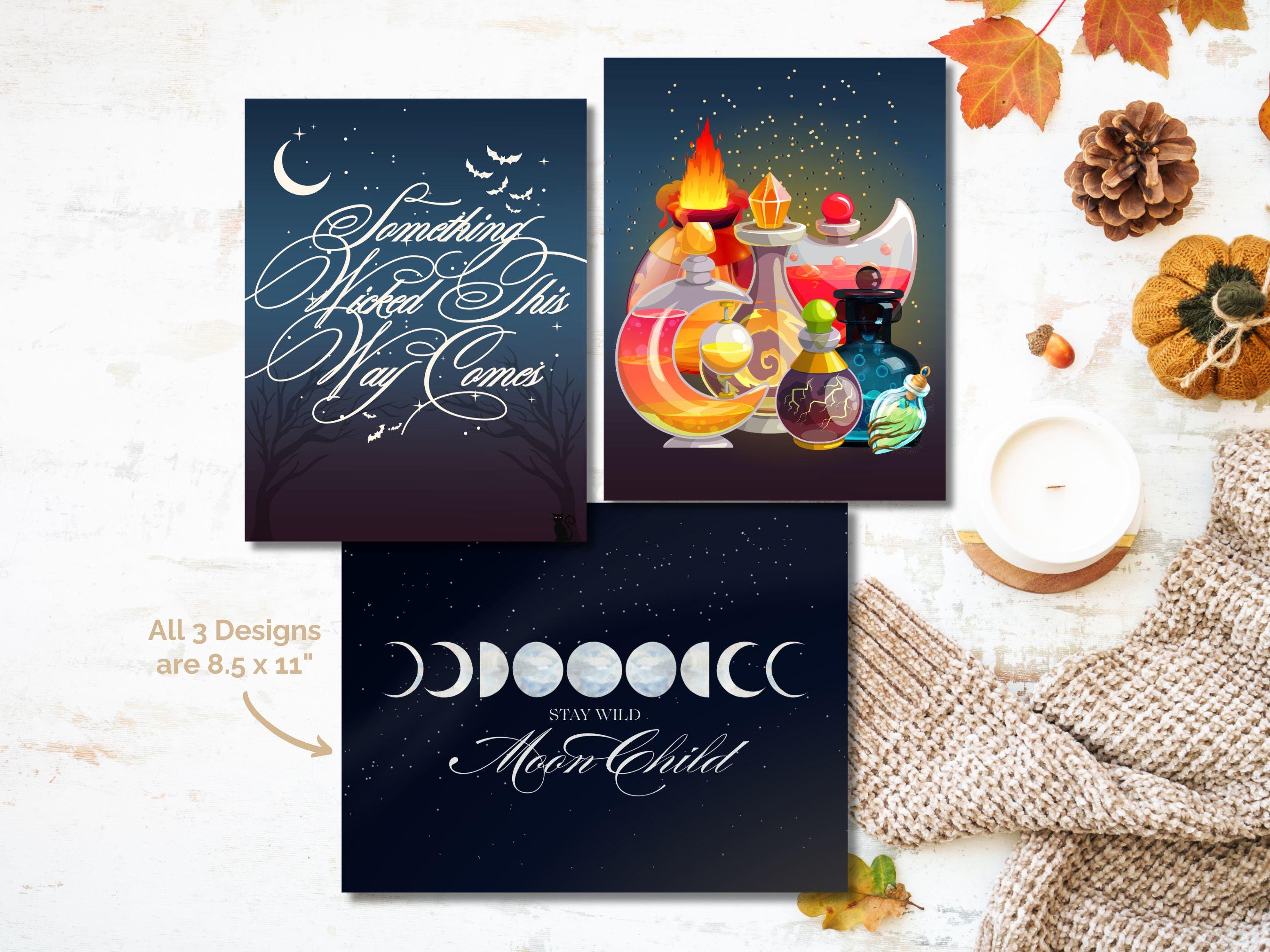 What's Included: 1. "Something Wicked This Way Comes" Set against a twilight sky, this spellbinding piece sets the perfect eerie tone with its ominous phrase. Featuring a crescent moon, a flurry of bats, and a mischievous black cat perched beneath barren trees, this design is perfect for setting a spooky, supernatural atmosphere. 2. Potion Bottles with Glowing Liquids Unleash your inner alchemist with this magical illustration of six uniquely designed potion bottles! Each bottle tells its own story, with glowing, colorful liquids, dynamic flames, and intricate details that evoke a mystical apothecary. It'll add a pop of fantastical color wherever you choose to display it. 3. "Stay Wild, Moon Child" A celestial masterpiece celebrating the connection between the moon and nature. This piece features an elegant display of moon phases paired with inspiring text in stylish typography. Its rich navy background and starry accents create a peaceful yet mystical ambiance, making it a calming and thoughtful addition to any room.