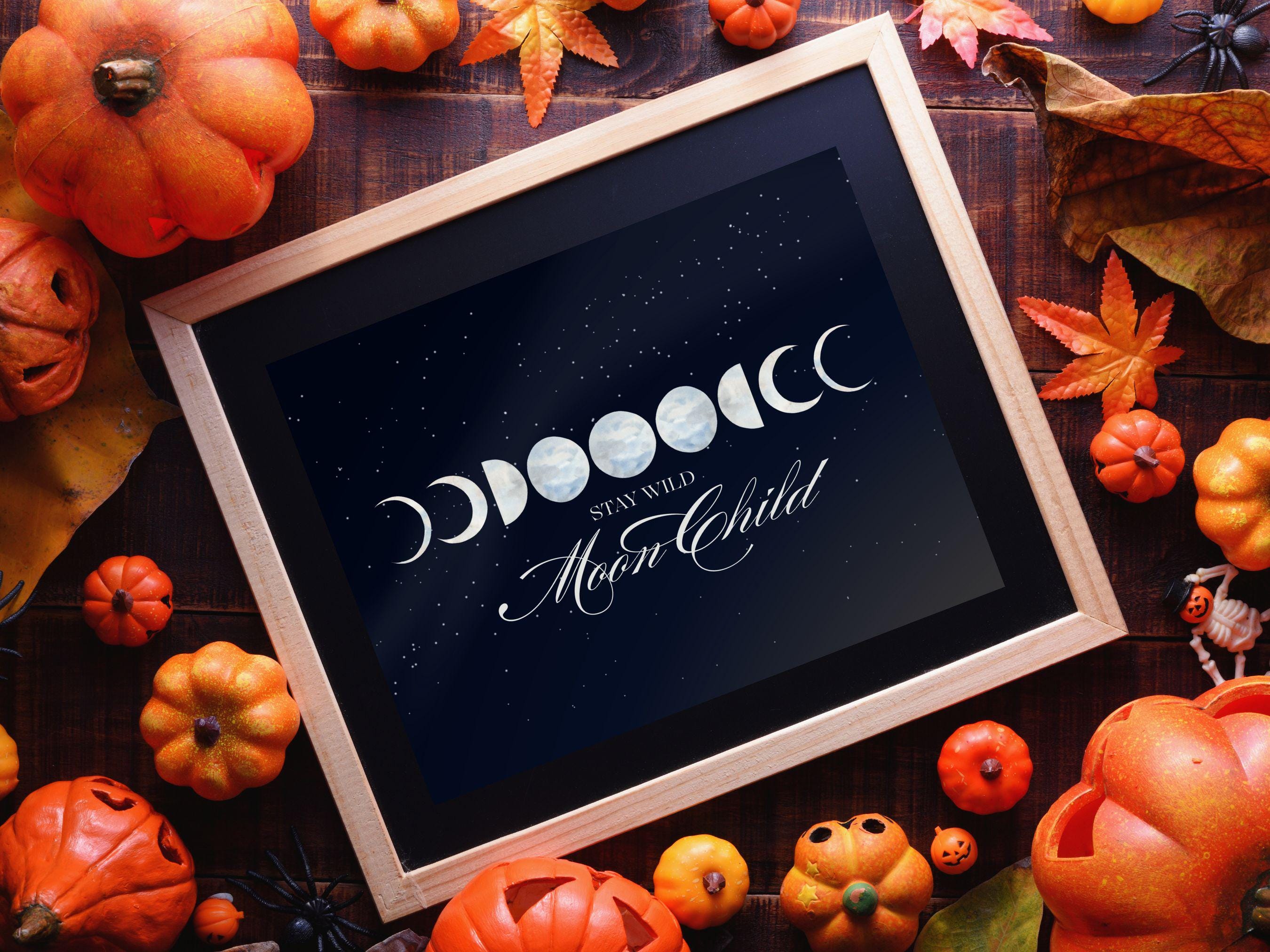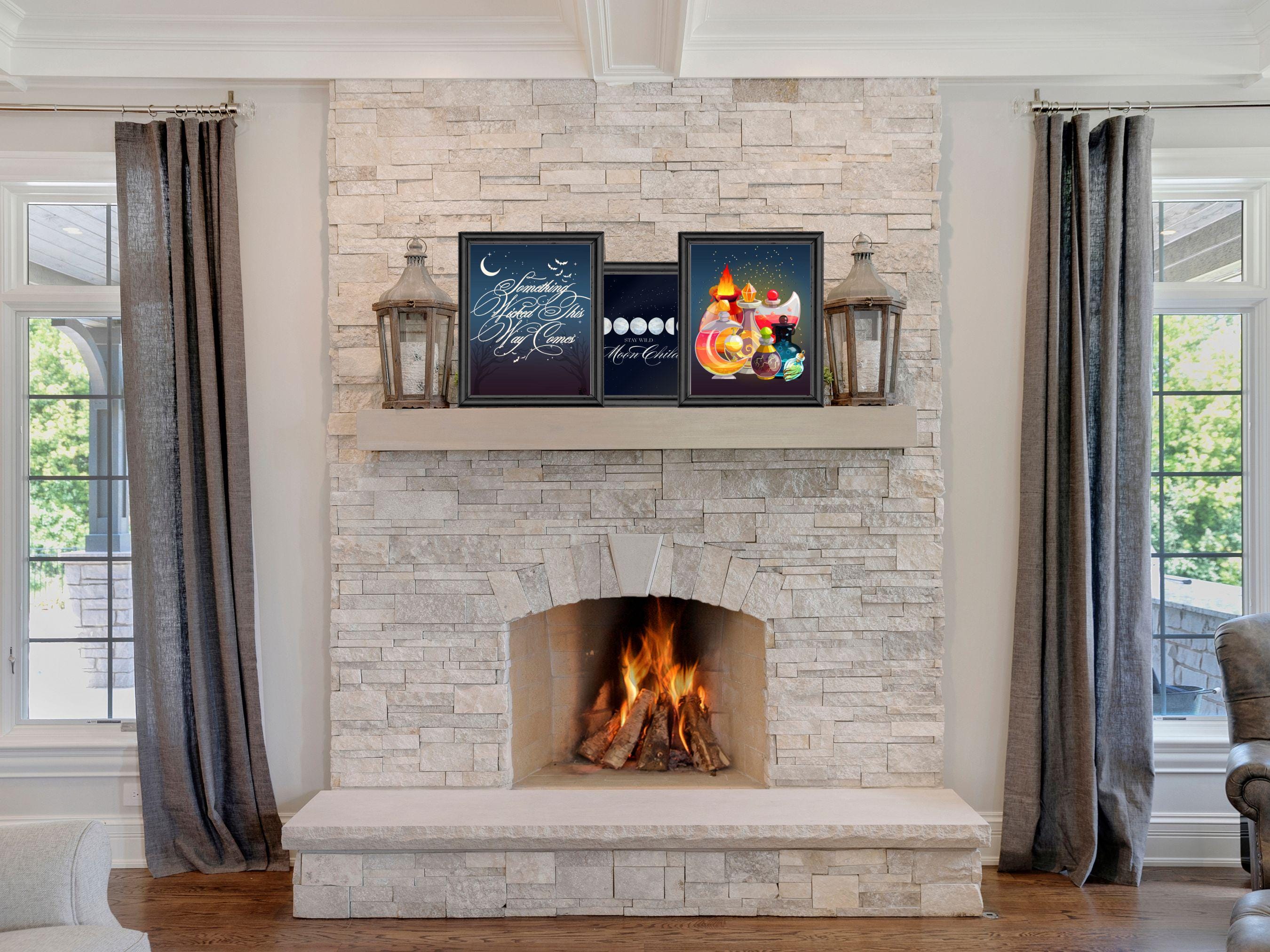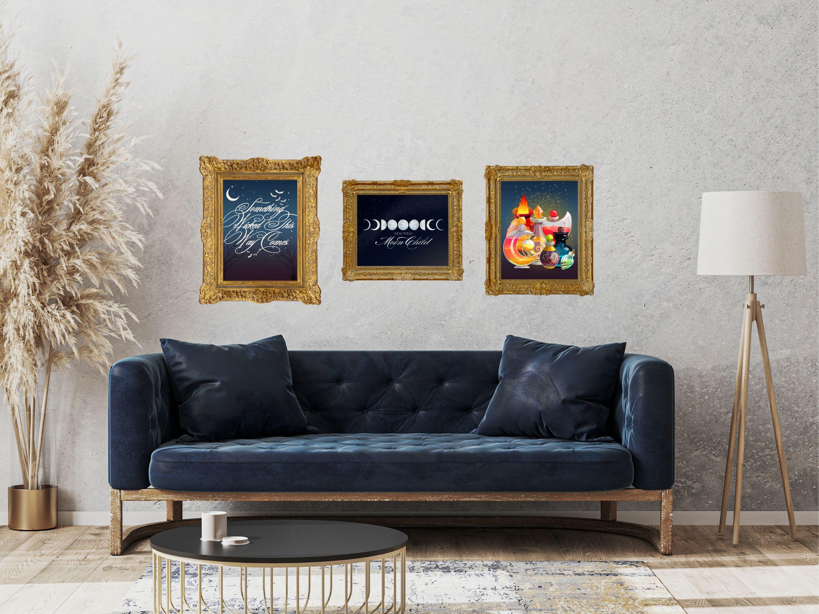 What's Included: 1. "Something Wicked This Way Comes" Set against a twilight sky, this spellbinding piece sets the perfect eerie tone with its ominous phrase. Featuring a crescent moon, a flurry of bats, and a mischievous black cat perched beneath barren trees, this design is perfect for setting a spooky, supernatural atmosphere. 2. Potion Bottles with Glowing Liquids Unleash your inner alchemist with this magical illustration of six uniquely designed potion bottles! Each bottle tells its own story, with glowing, colorful liquids, dynamic flames, and intricate details that evoke a mystical apothecary. It'll add a pop of fantastical color wherever you choose to display it. 3. "Stay Wild, Moon Child" A celestial masterpiece celebrating the connection between the moon and nature. This piece features an elegant display of moon phases paired with inspiring text in stylish typography. Its rich navy background and starry accents create a peaceful yet mystical ambiance, making it a calming and thoughtful addition to any room.