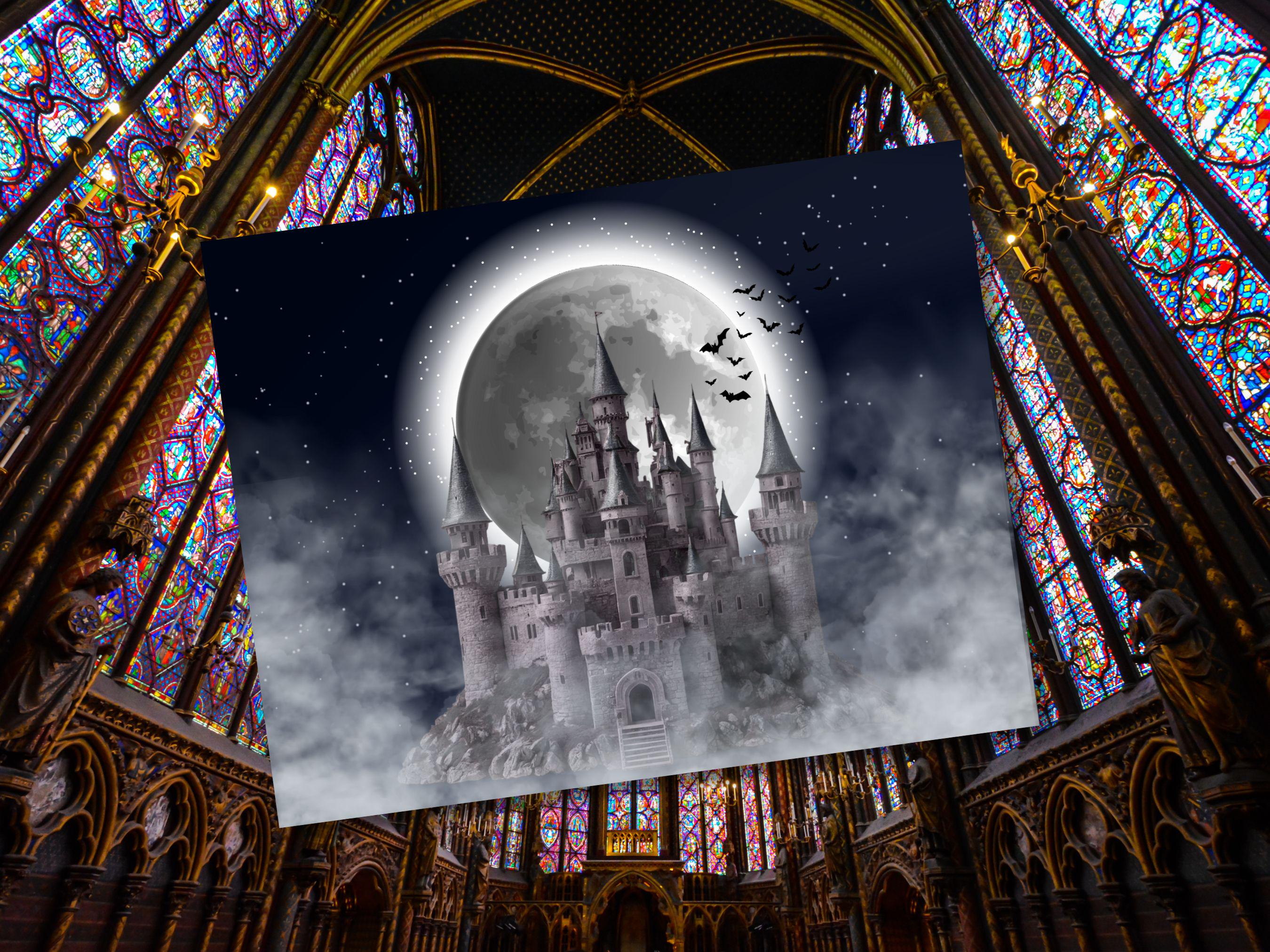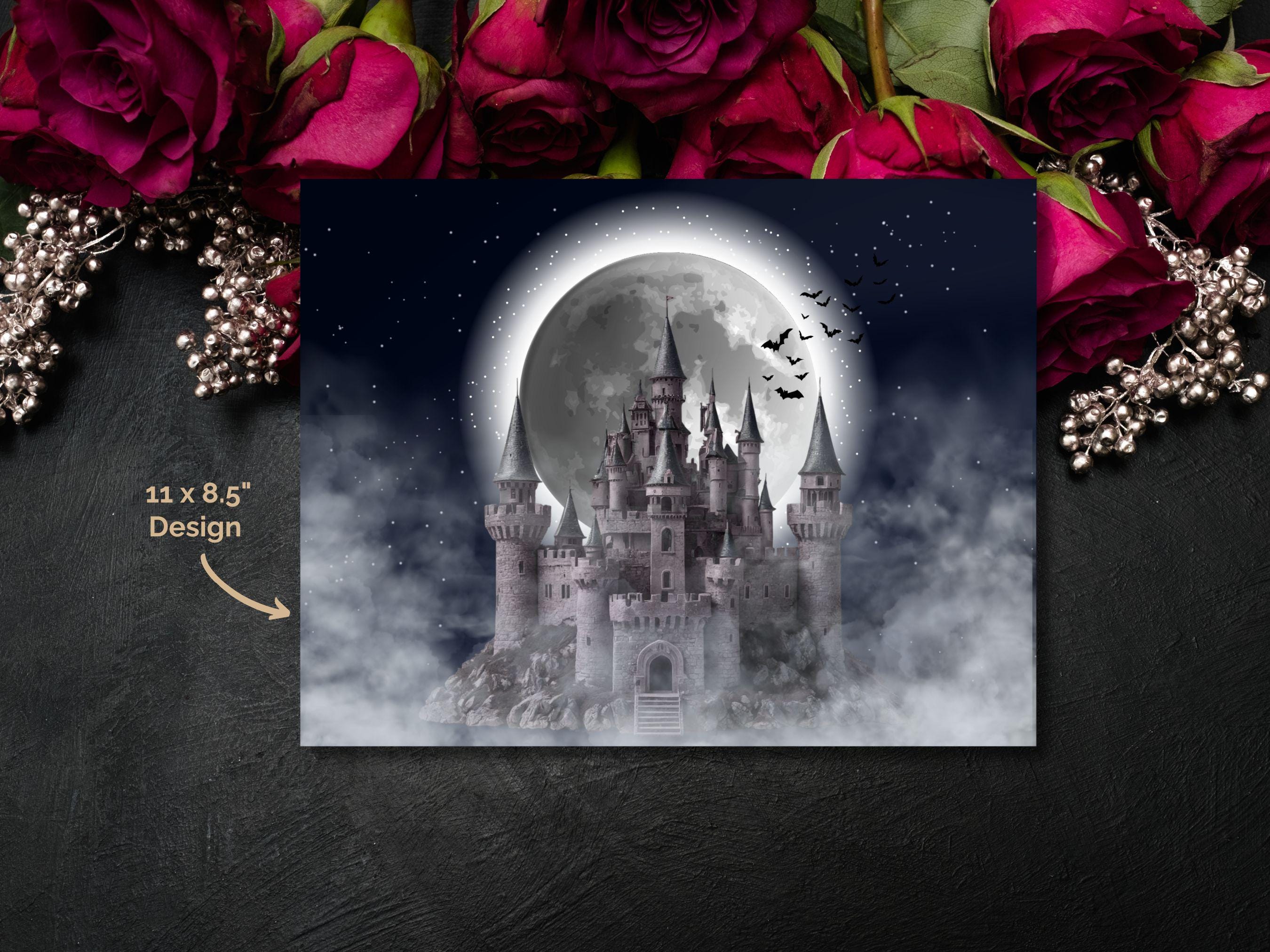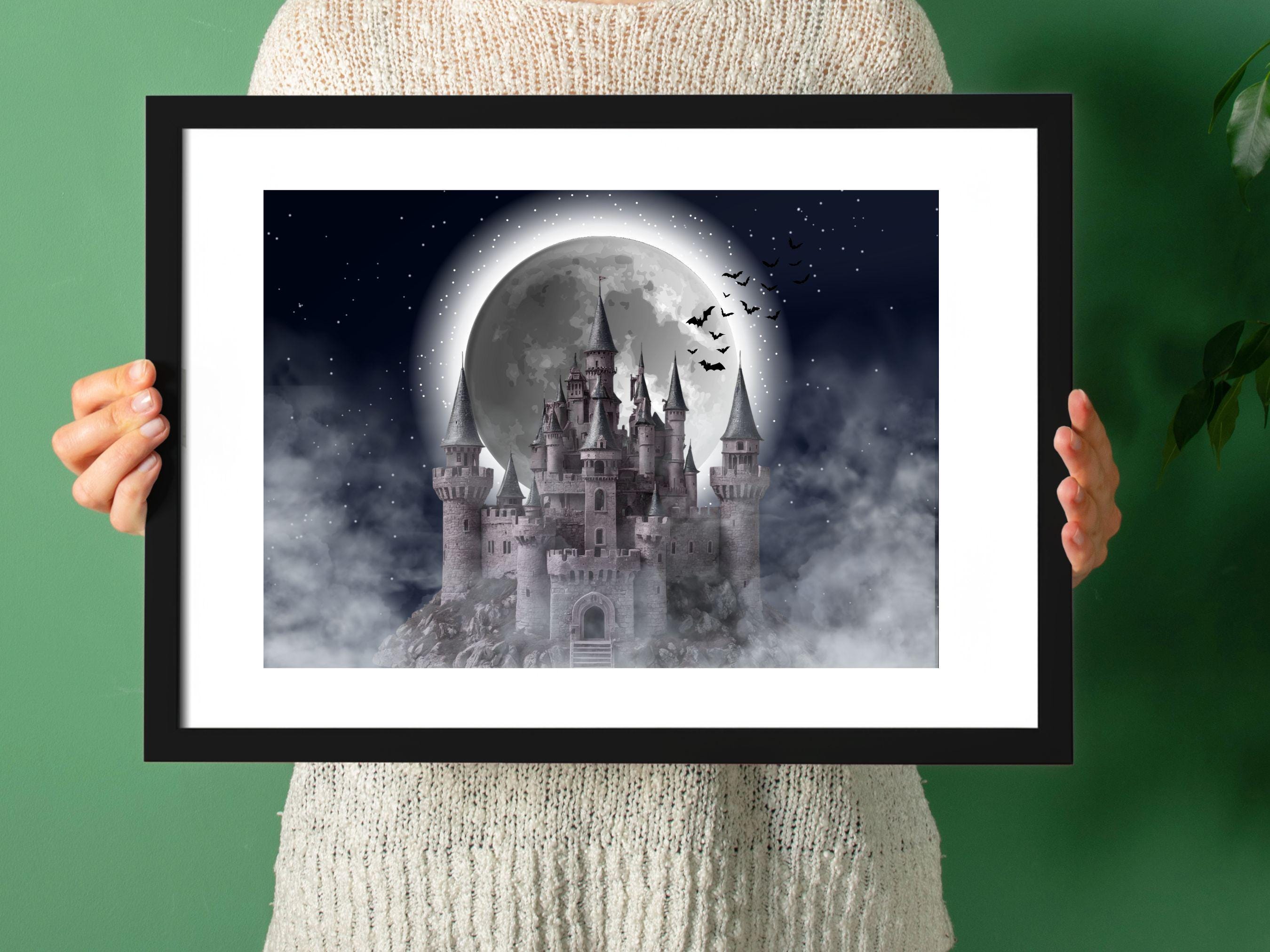 Gothic Castle Printable Wall Art – Mystical Moonlit Decor Transform your space with the haunting beauty of this printable gothic castle wall art, a perfect blend of fantasy, mystery, and romantic allure. This striking artwork captures a legendary castle framed by a luminous full moon, surrounded by mysterious fog, enchanting stars, and a flock of bats in flight.