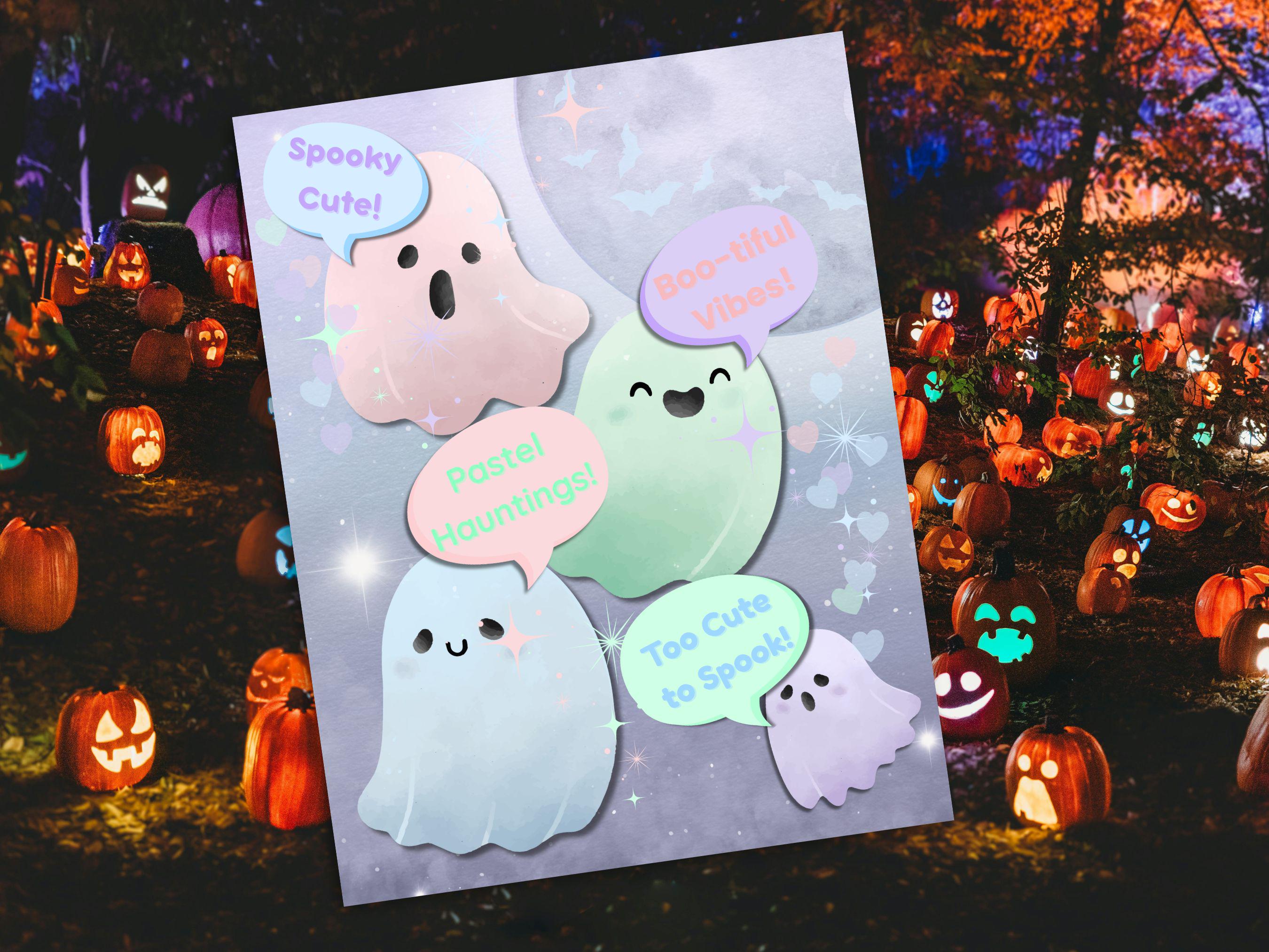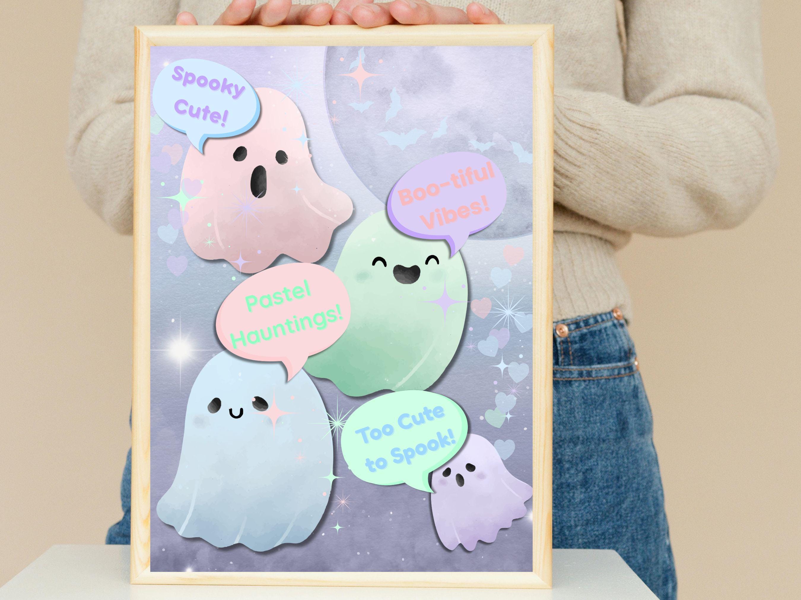 Pastel Kawaii Ghosts Halloween Printable Wall Art - 8.5x11 Digital Download Transform your space with this enchanting pastel Halloween-themed printable wall art! Featuring adorable, pastel-colored ghost characters and playful phrases like “Spooky Cute!” and “Too Cute to Spook!”, this artwork will add a touch of charm to your Halloween decor. Set against a dreamy pastel sky with stars, hearts, and a glowing moon, it’s the perfect mix of whimsy and fun.