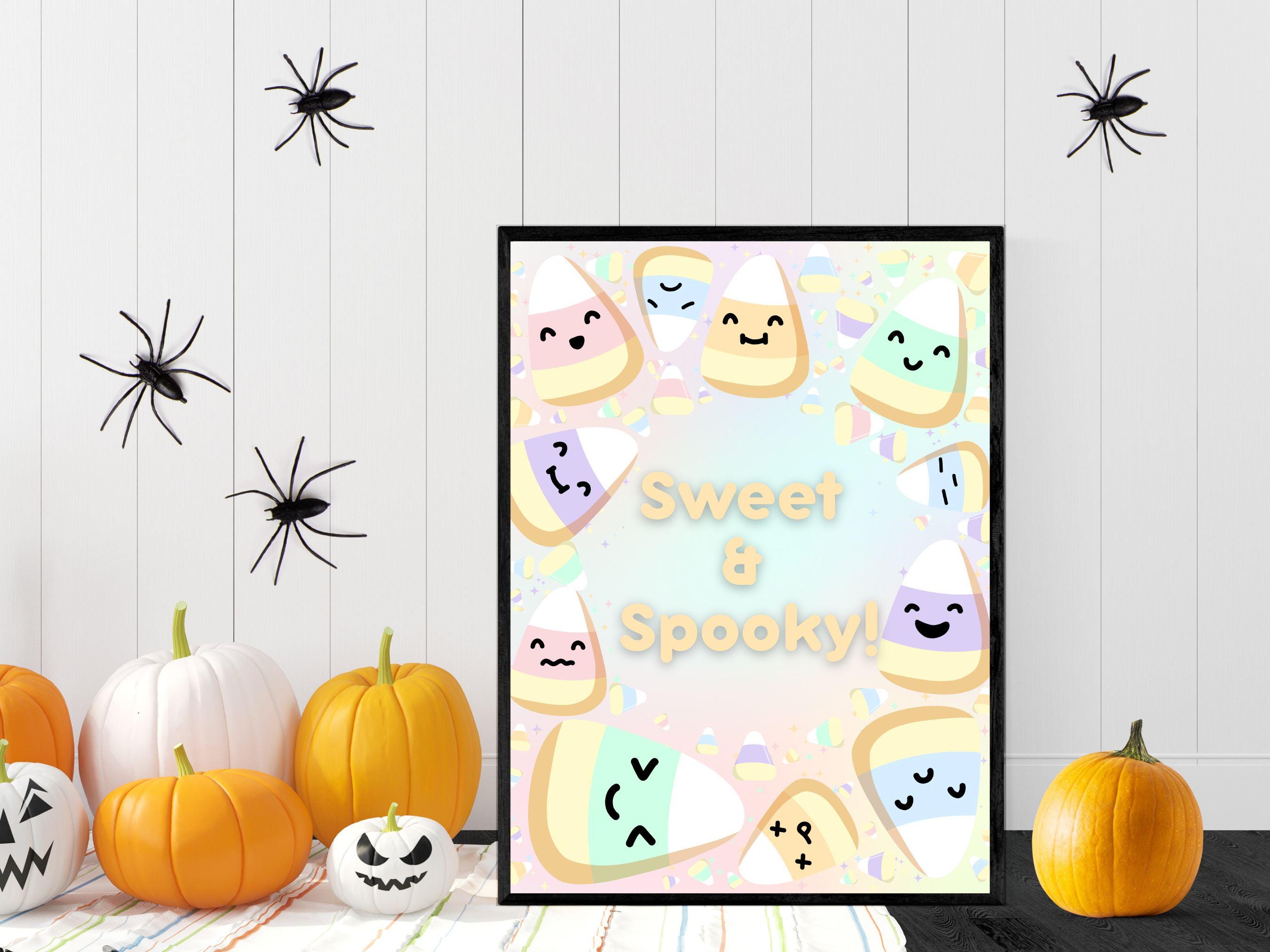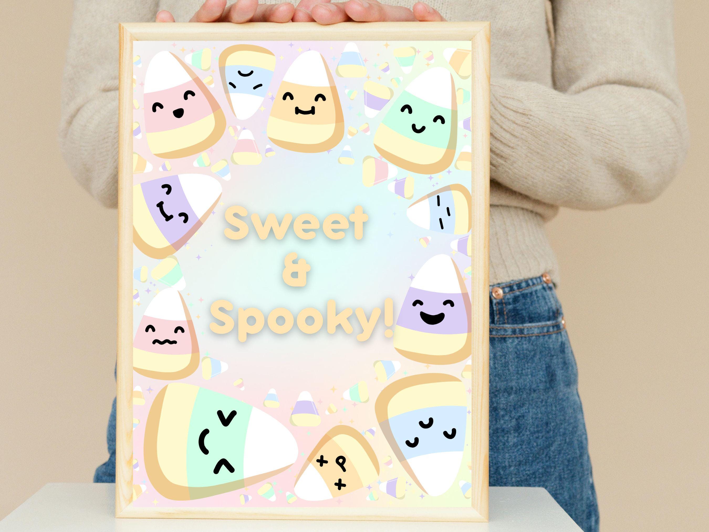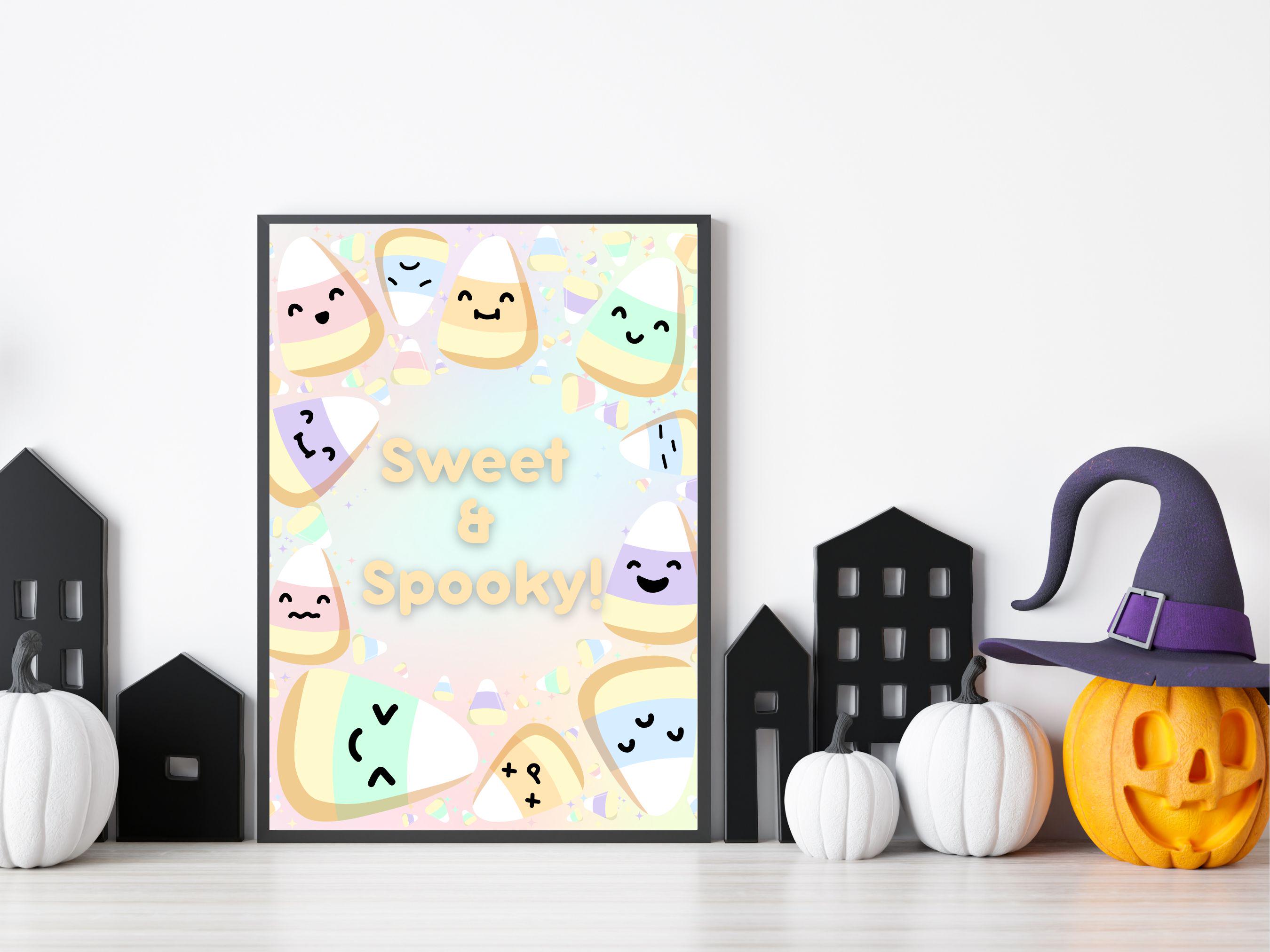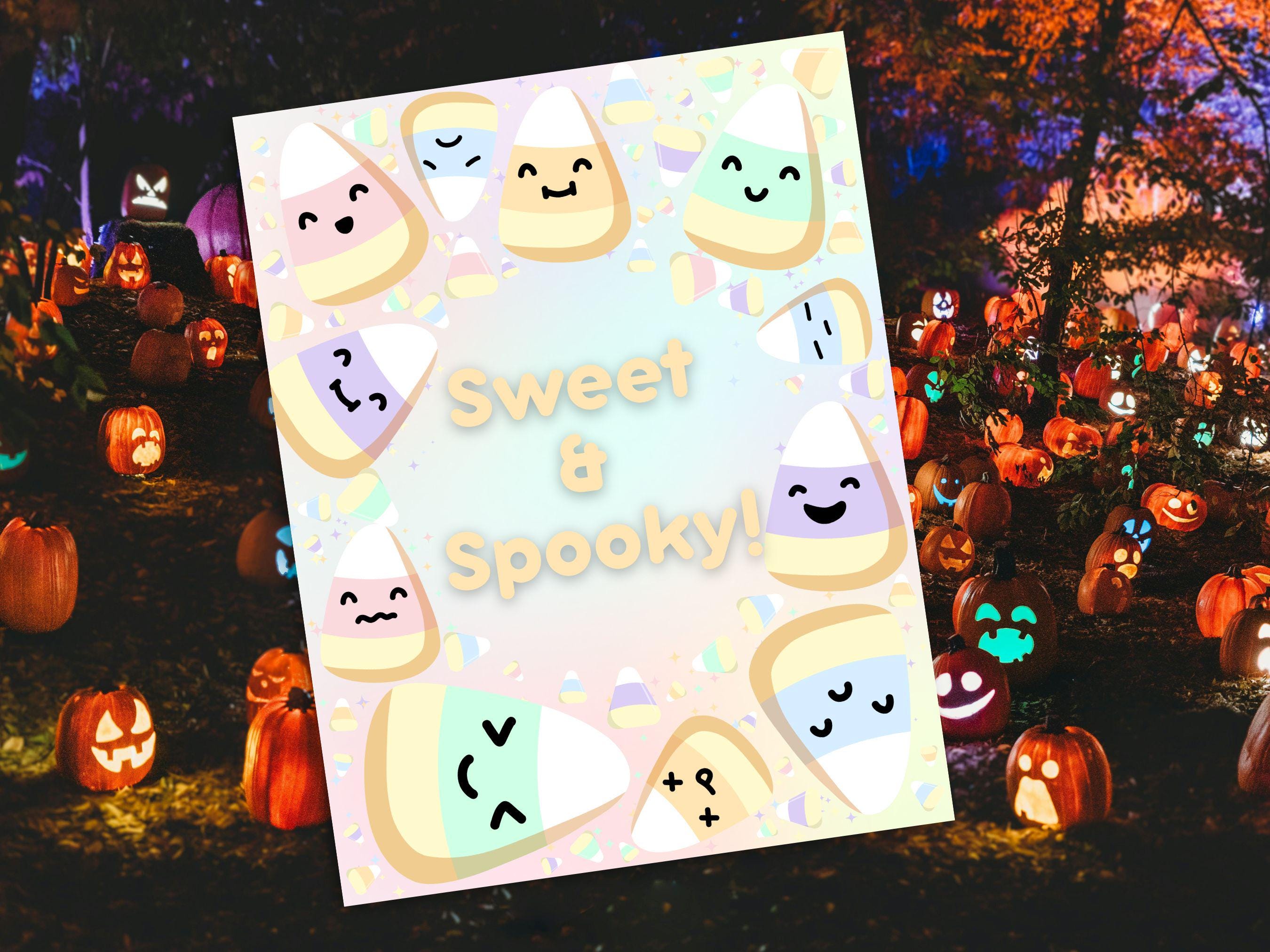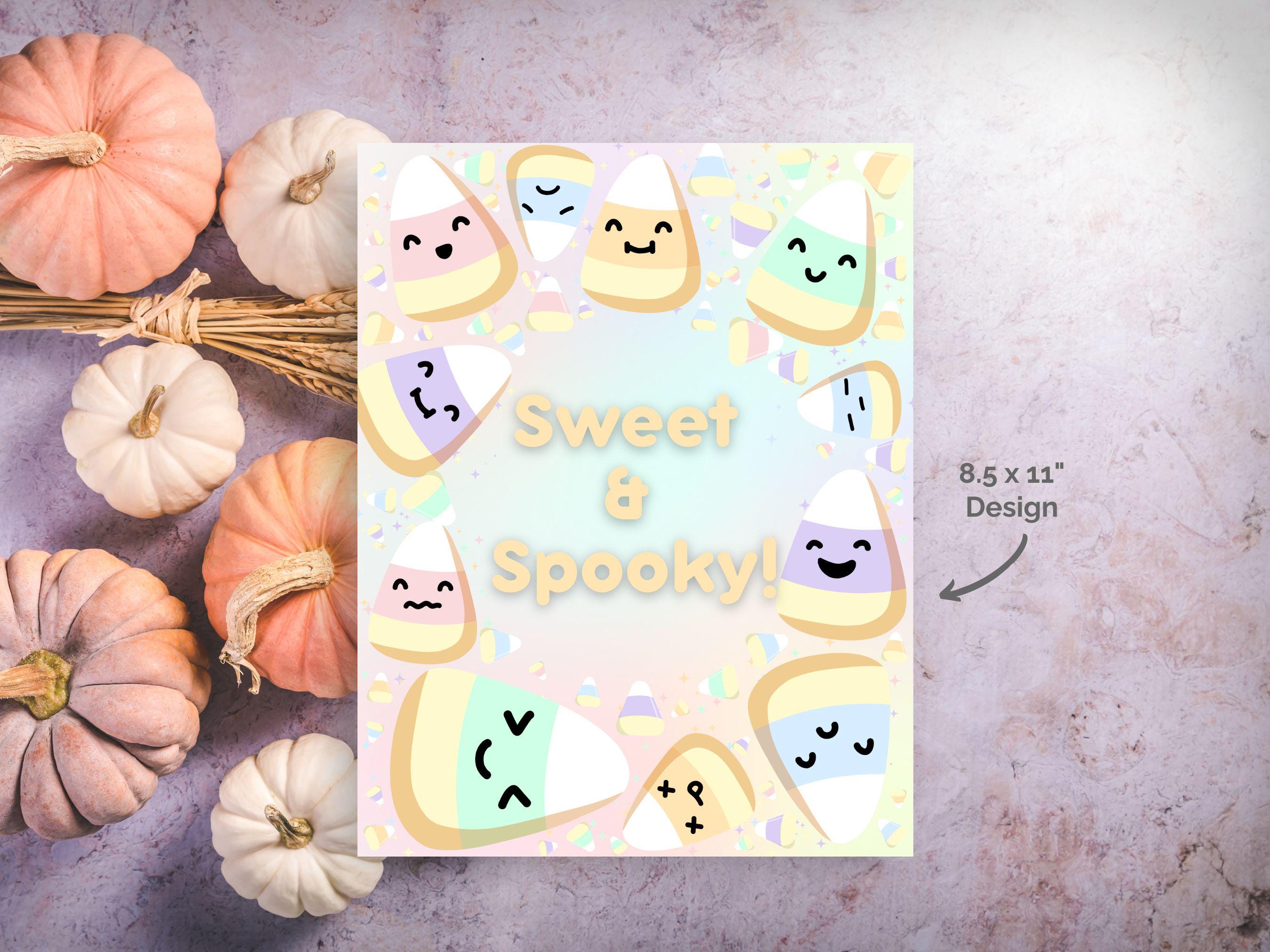A Whimsical Halloween Touch This 8.5x11-inch digital artwork features anthropomorphized candy corn characters with playful expressions, framed by a dreamy pastel color palette. The bold and friendly words, "Sweet & Spooky!" are centered in a fun, festive font that perfectly complements the lighthearted theme.