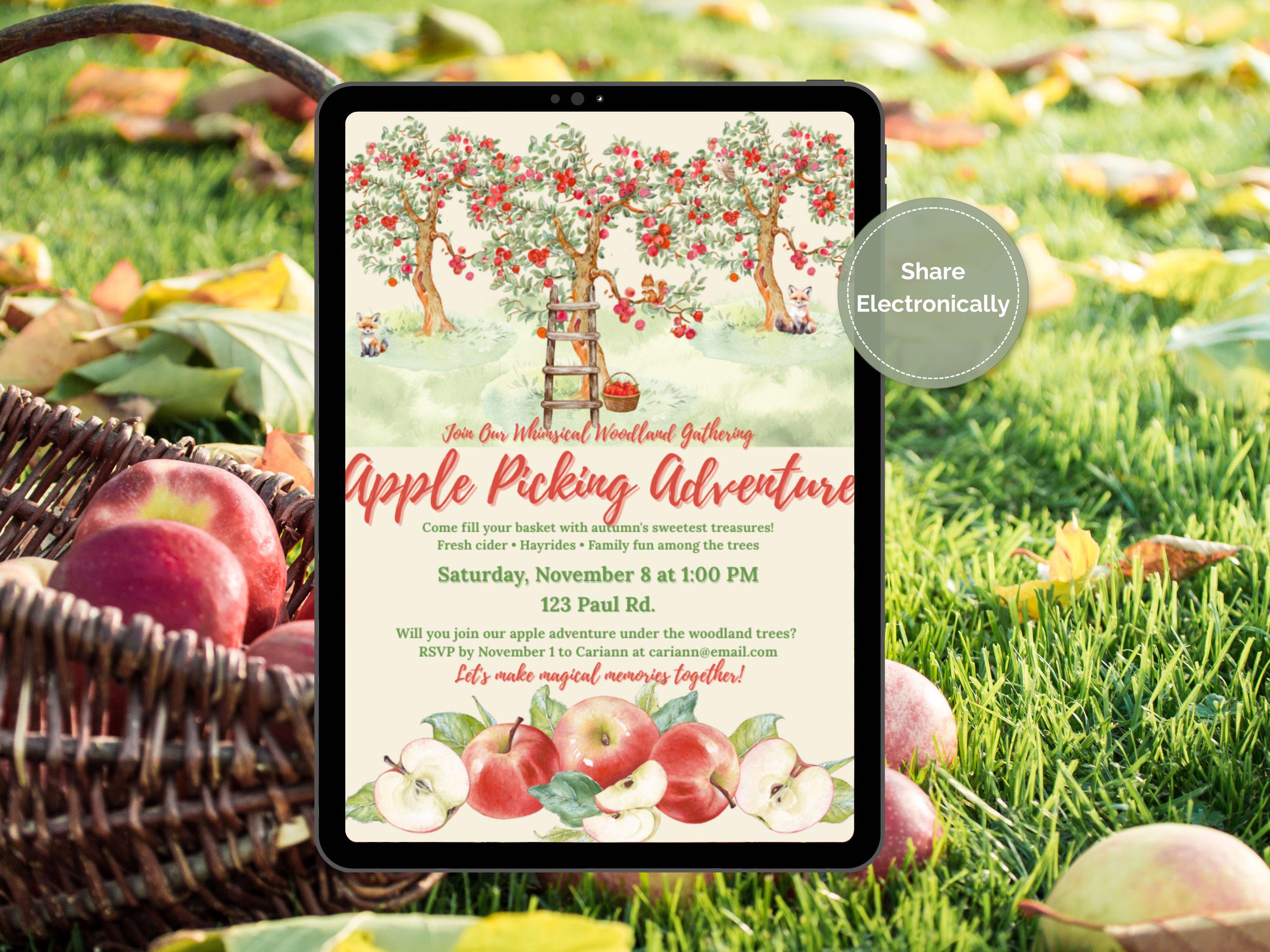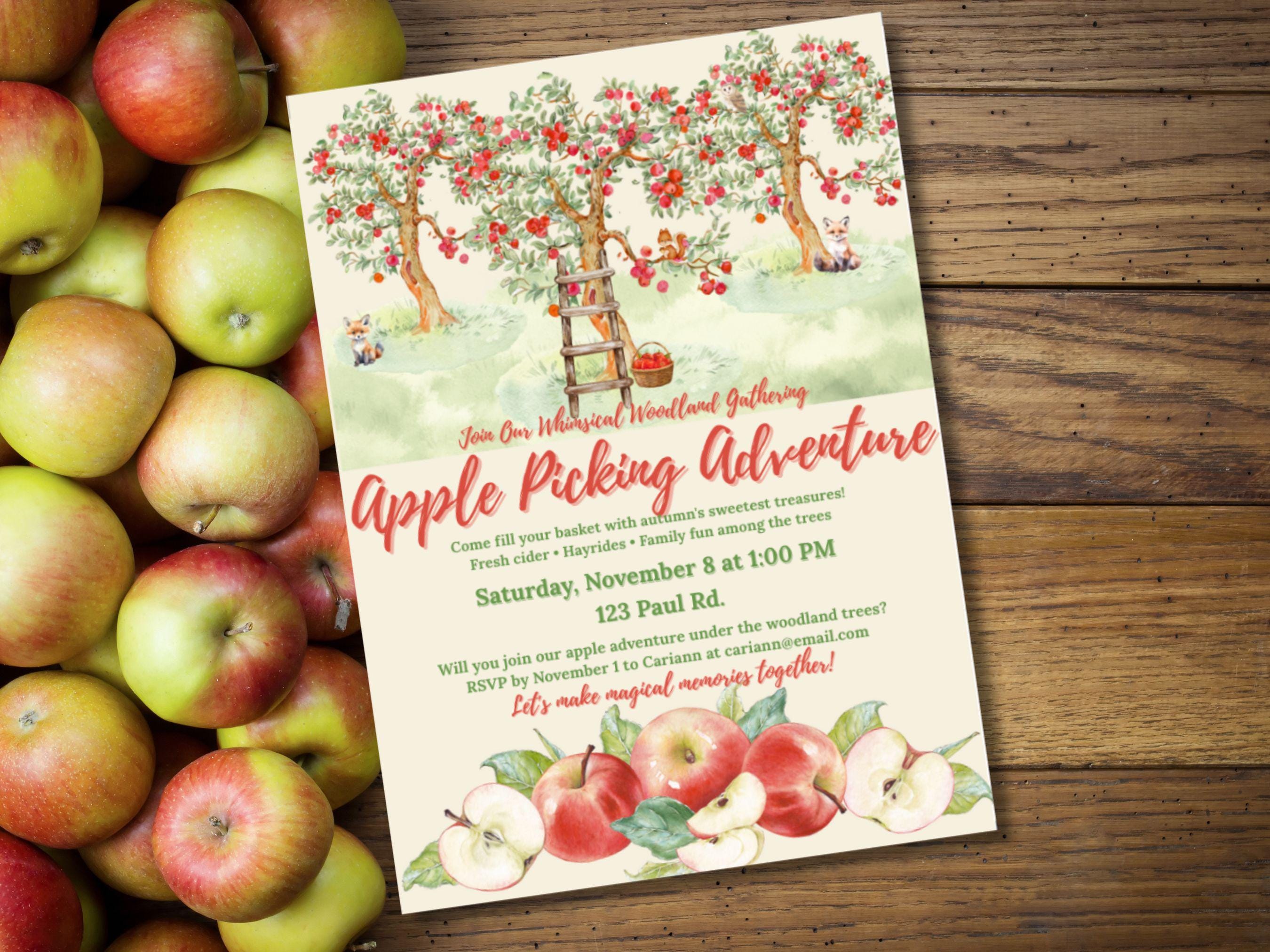 Create unforgettable memories with invitations as special as your autumn celebration. This whimsical design captures the magic of the season and sets the perfect tone for your woodland gathering. Ready to start your apple picking adventure? Download now and let the autumn magic begin!