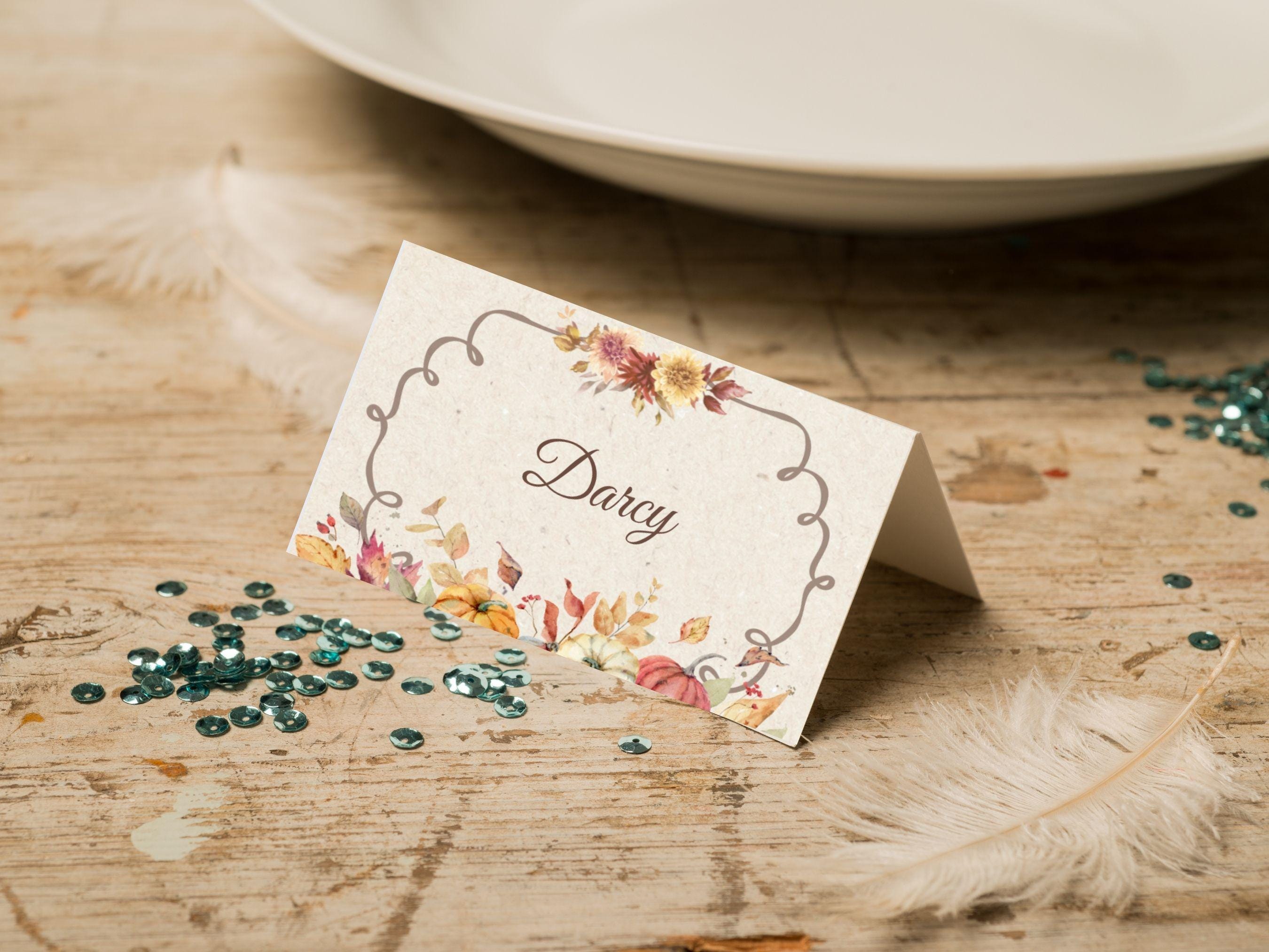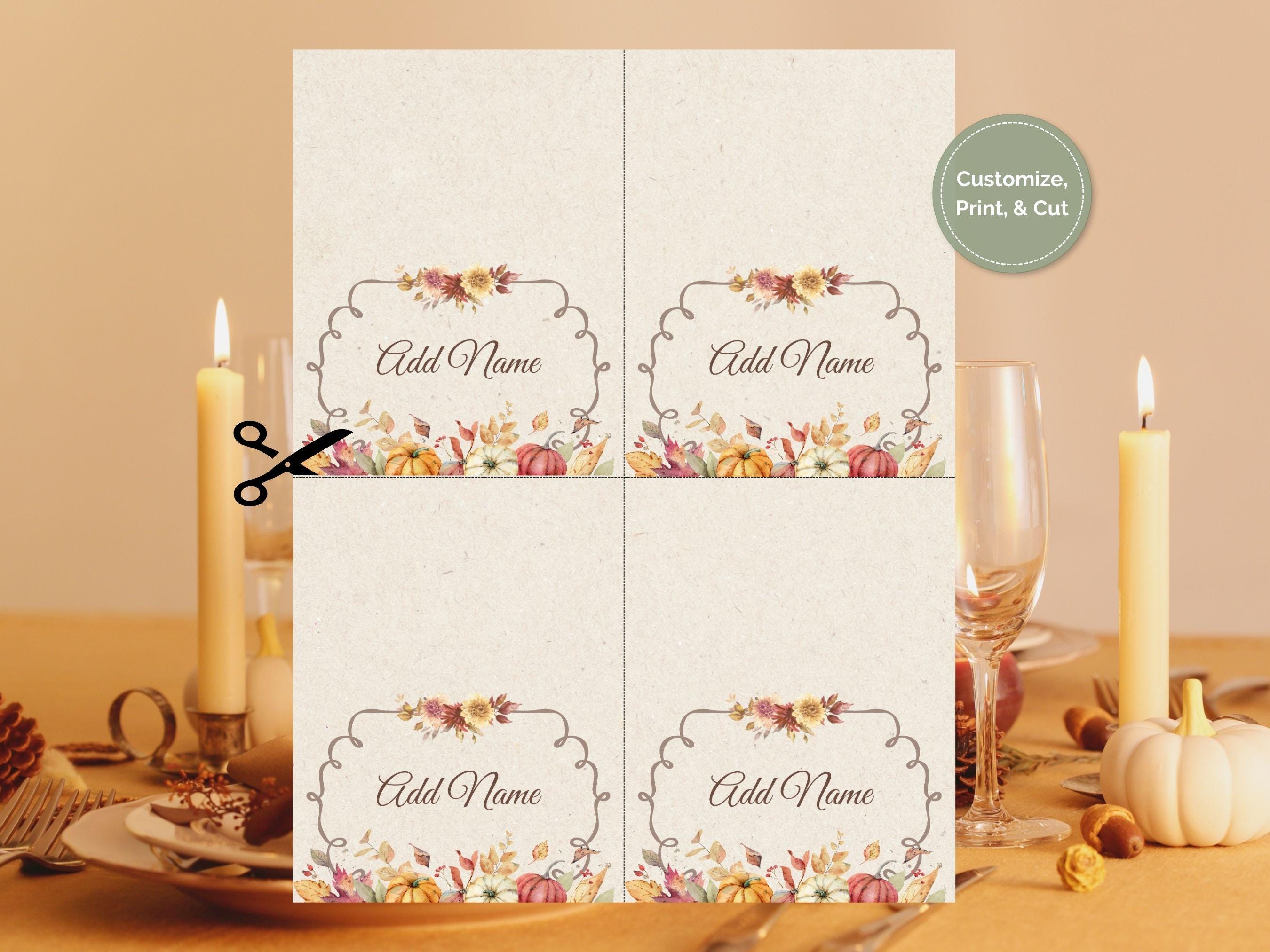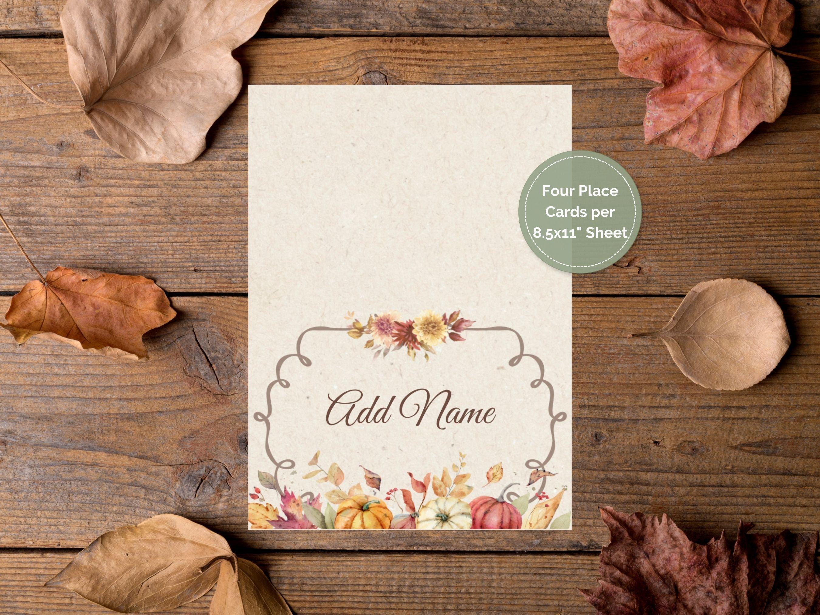 What You'll Get Four stunning place cards thoughtfully arranged on a convenient 8.5x11" sheet for effortless home printing. Each card features: Elegant autumn florals including vibrant sunflowers that capture the season's warmth Charming fall elements with pumpkins and colorful leaves in rich oranges, reds, and yellows Decorative border details that frame each name beautifully Premium textured background for an upscale, professional appearance
