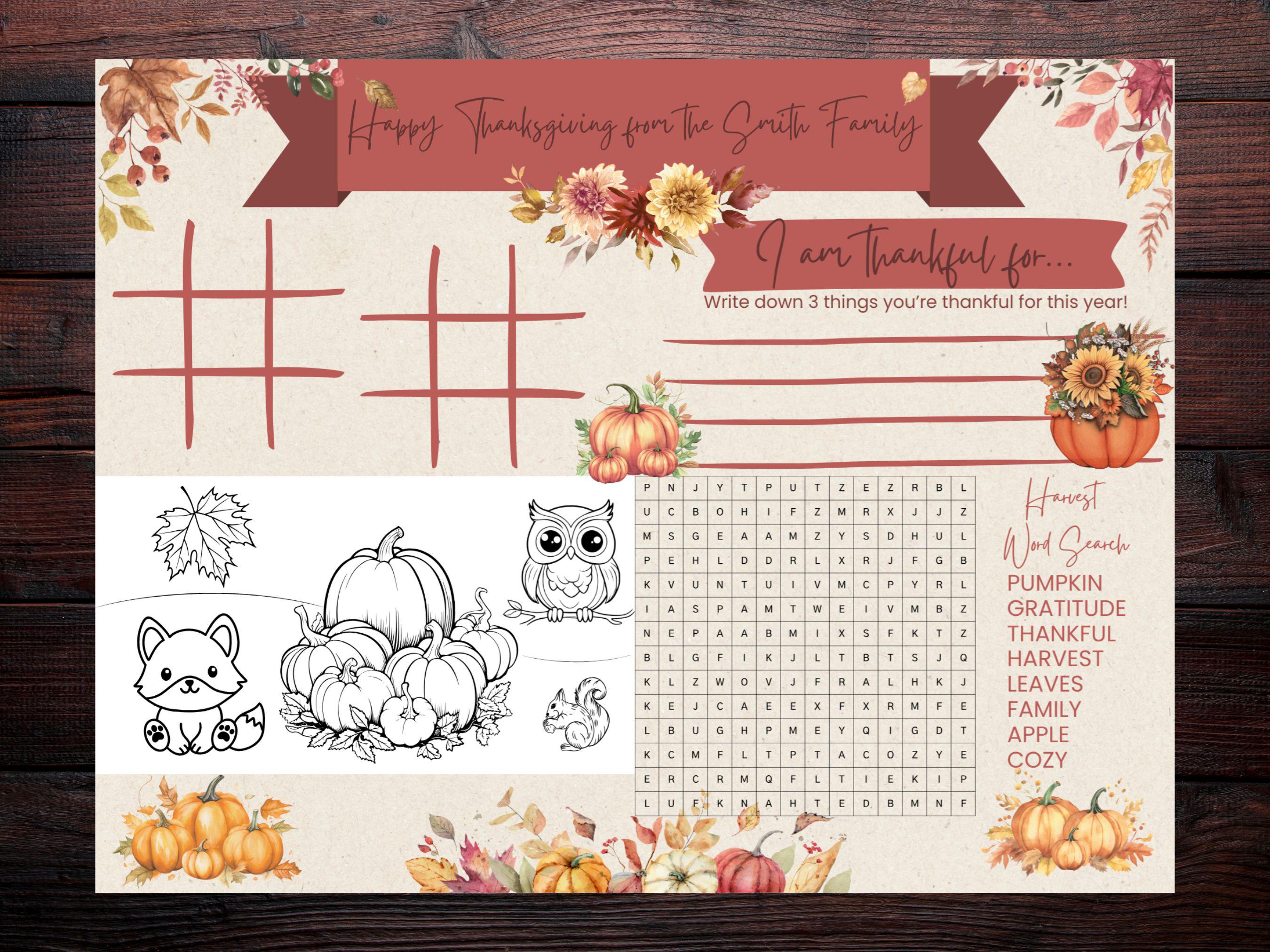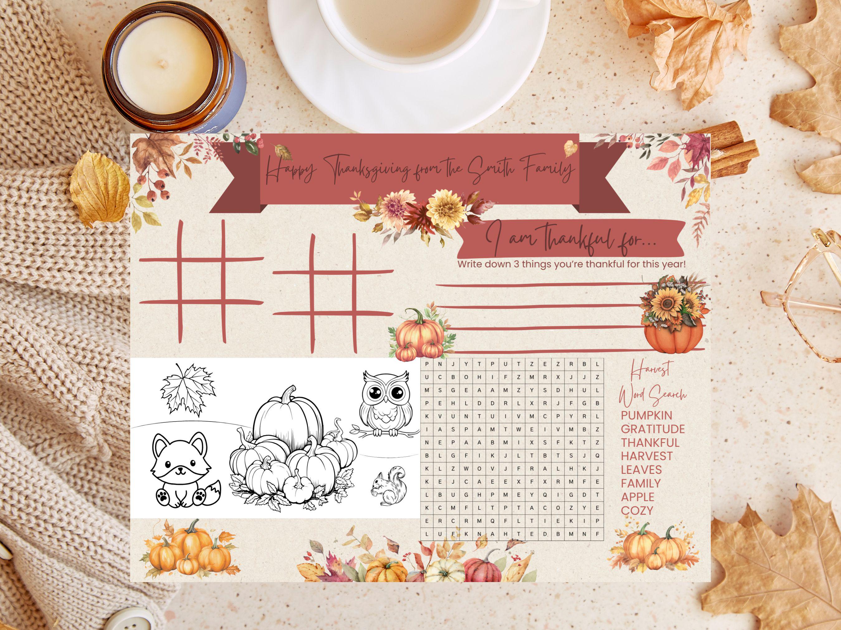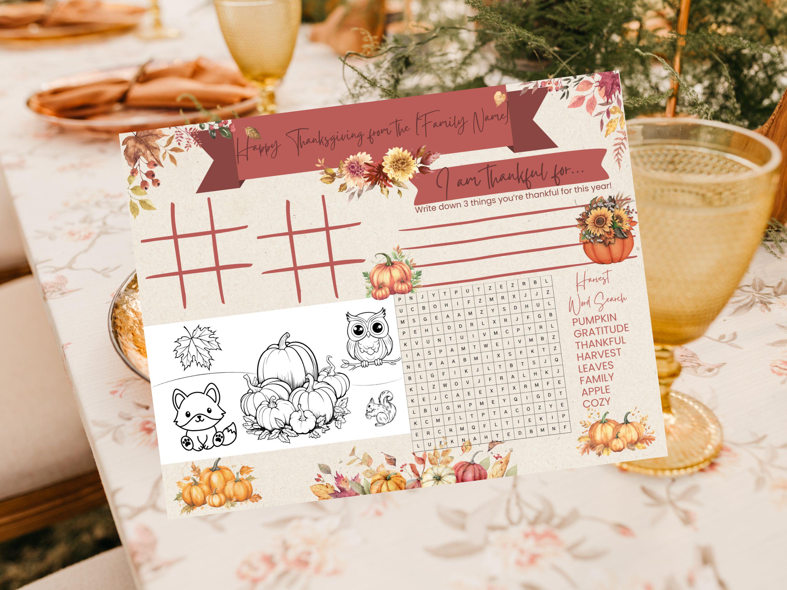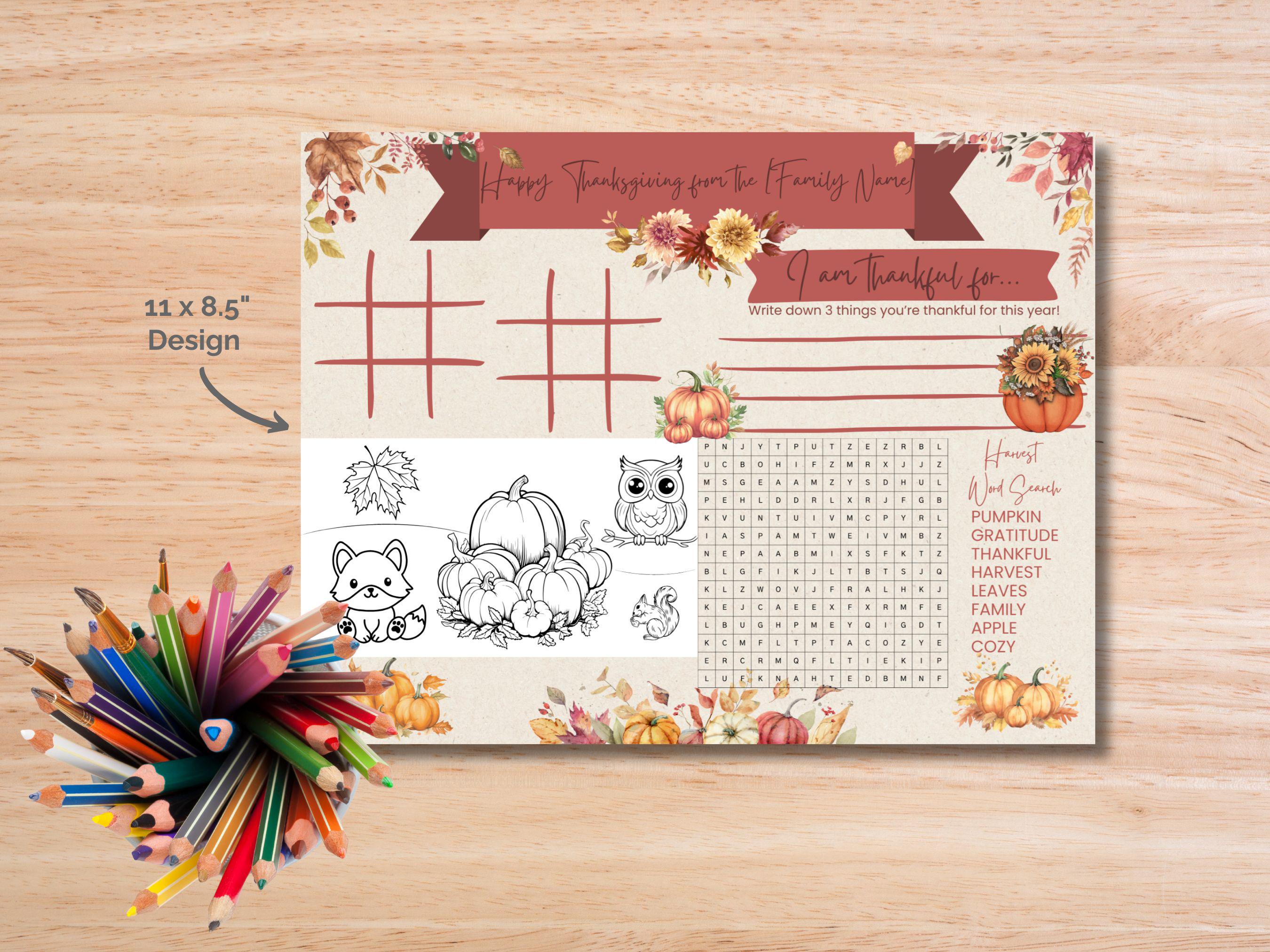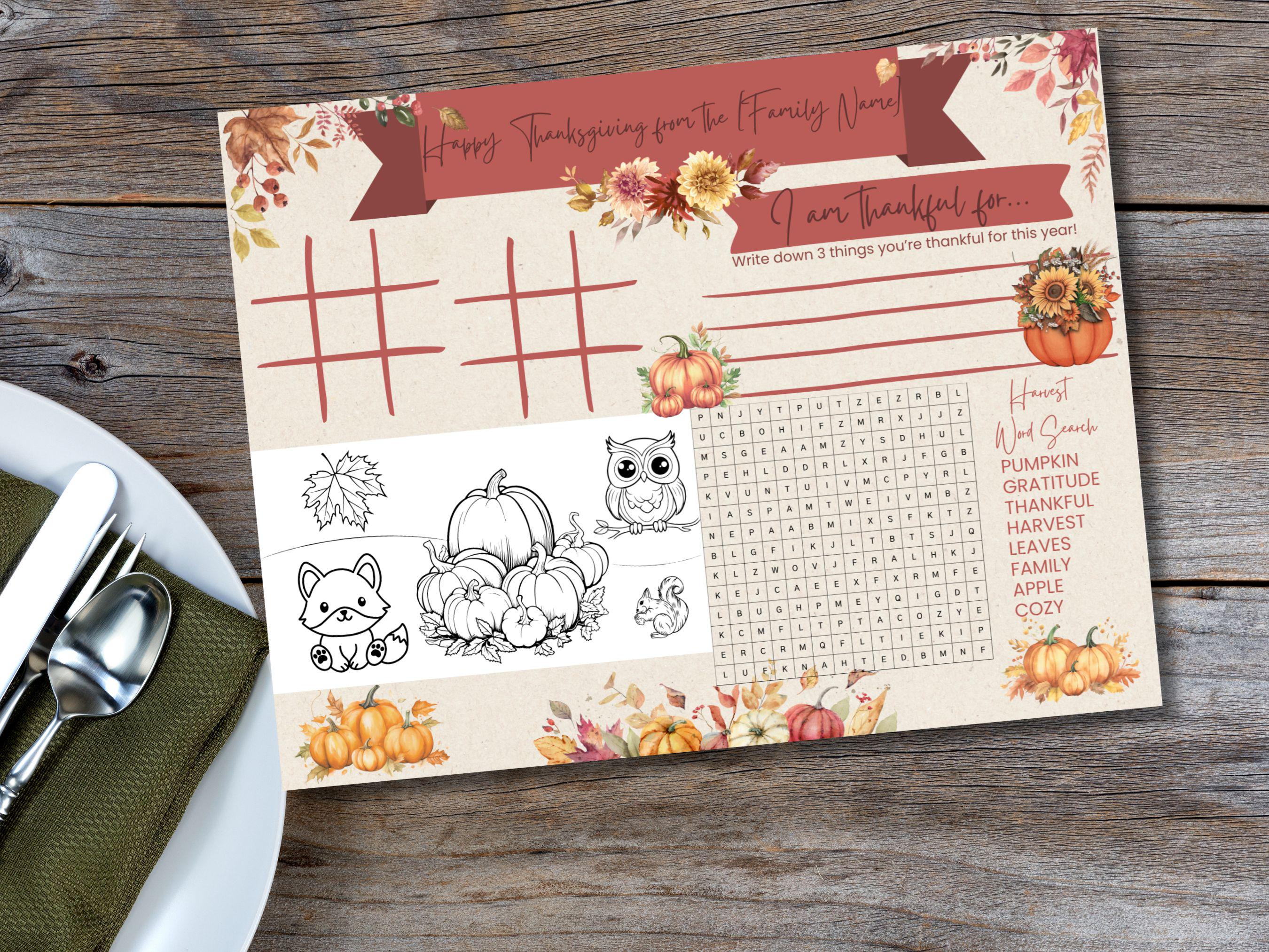Transform Your Thanksgiving Table into a Kids' Activity Haven Make this Thanksgiving unforgettable with our customizable kids' activity placemat that turns mealtime into playtime! This festive harvest-themed design keeps little ones happily engaged while adults enjoy their holiday conversations.