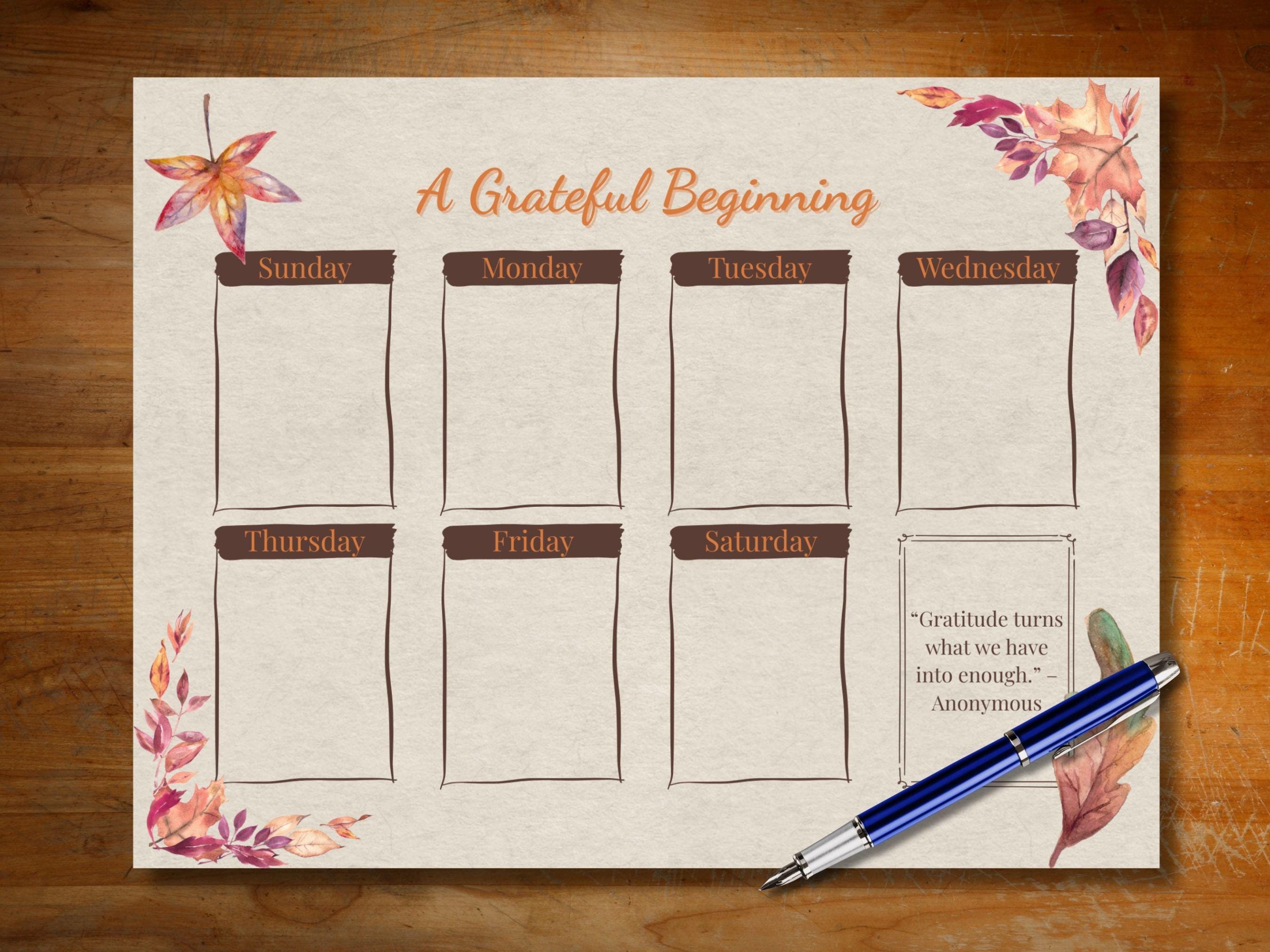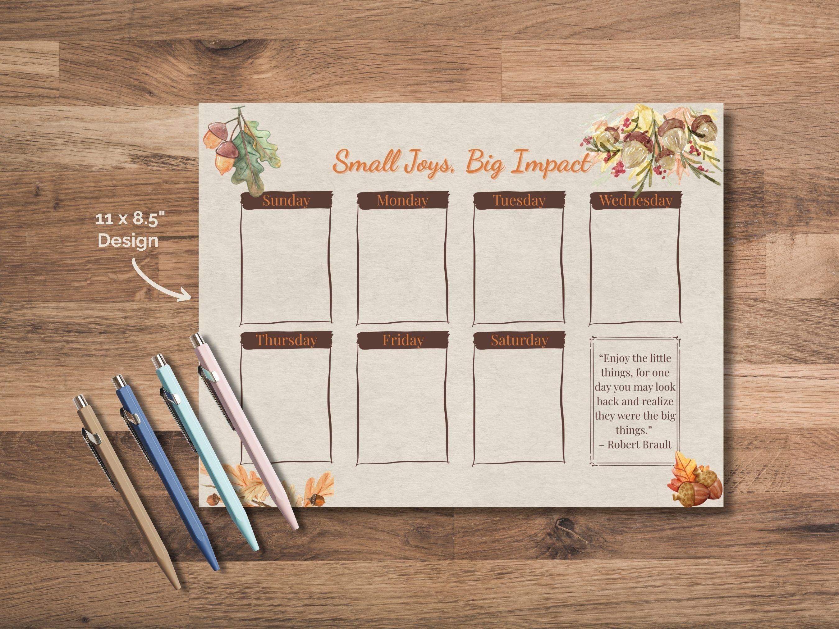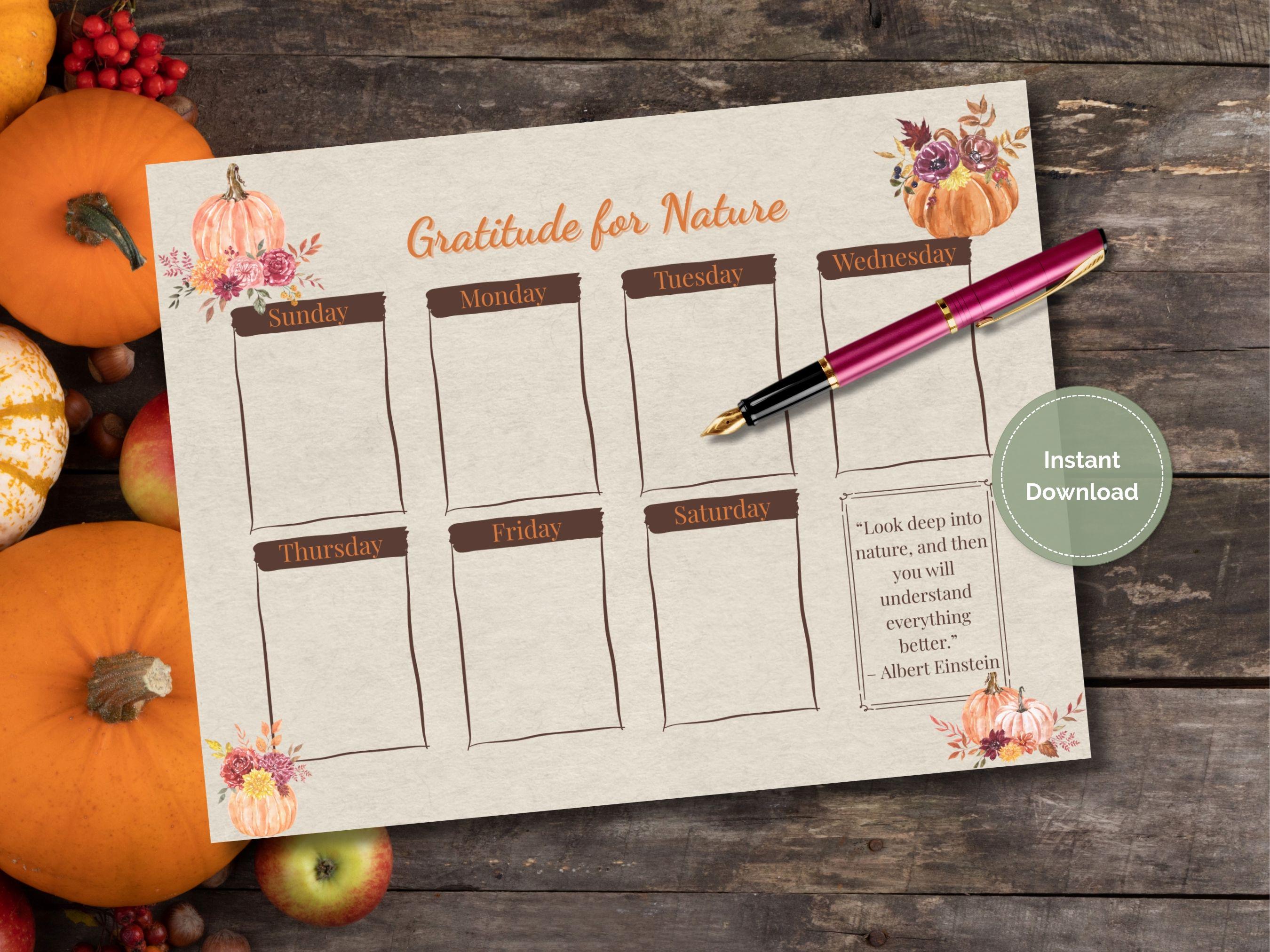 What You'll Receive 12 Unique Weekly Layouts featuring: Stunning autumn-themed designs with watercolor leaves, pumpkins, and seasonal florals Inspirational quotes from renowned thinkers to spark daily reflection Spacious daily boxes for your gratitude entries Nature-inspired color palettes in warm oranges, browns, and earth tones Thoughtful prompts to guide your mindfulness practice