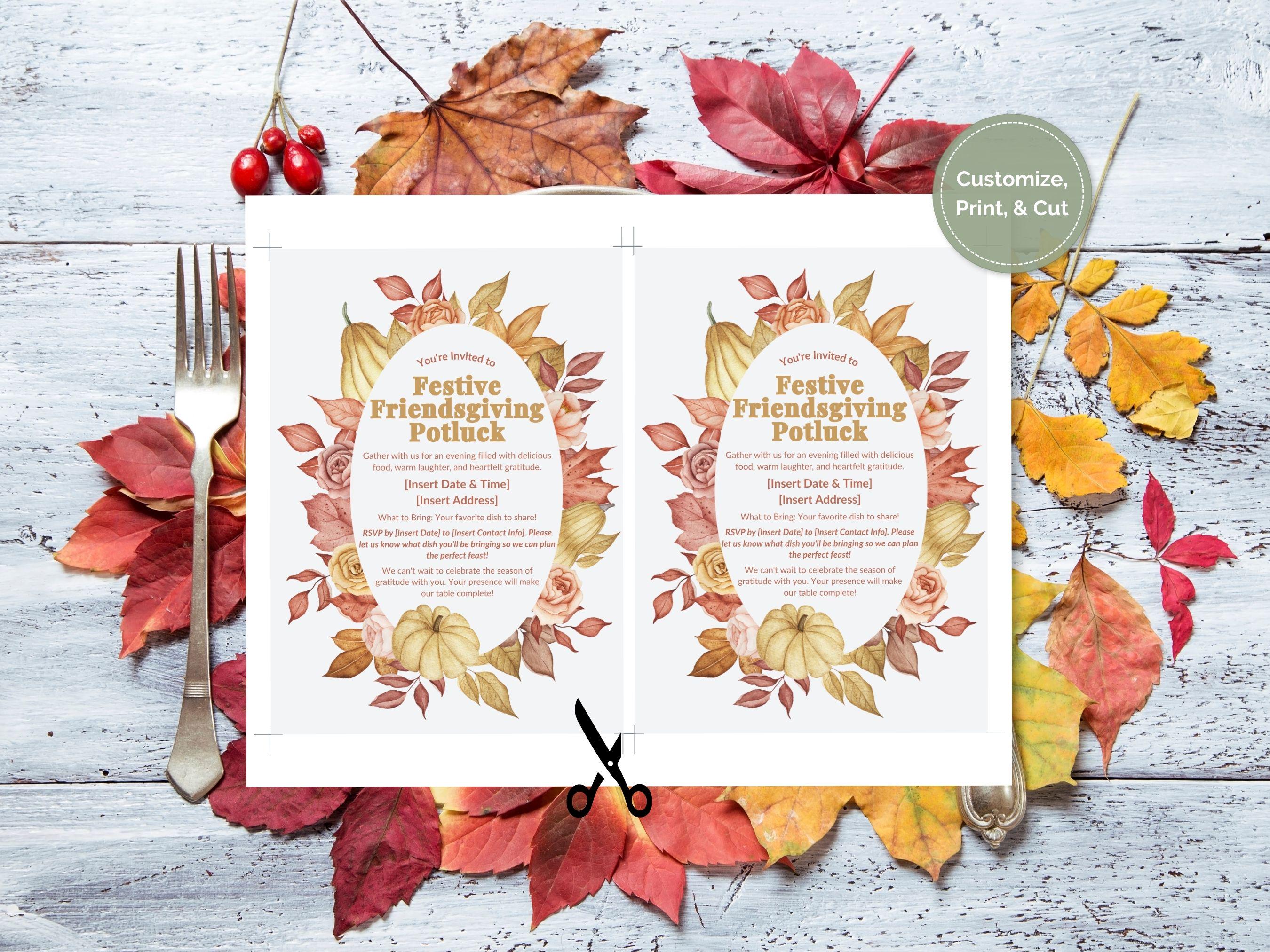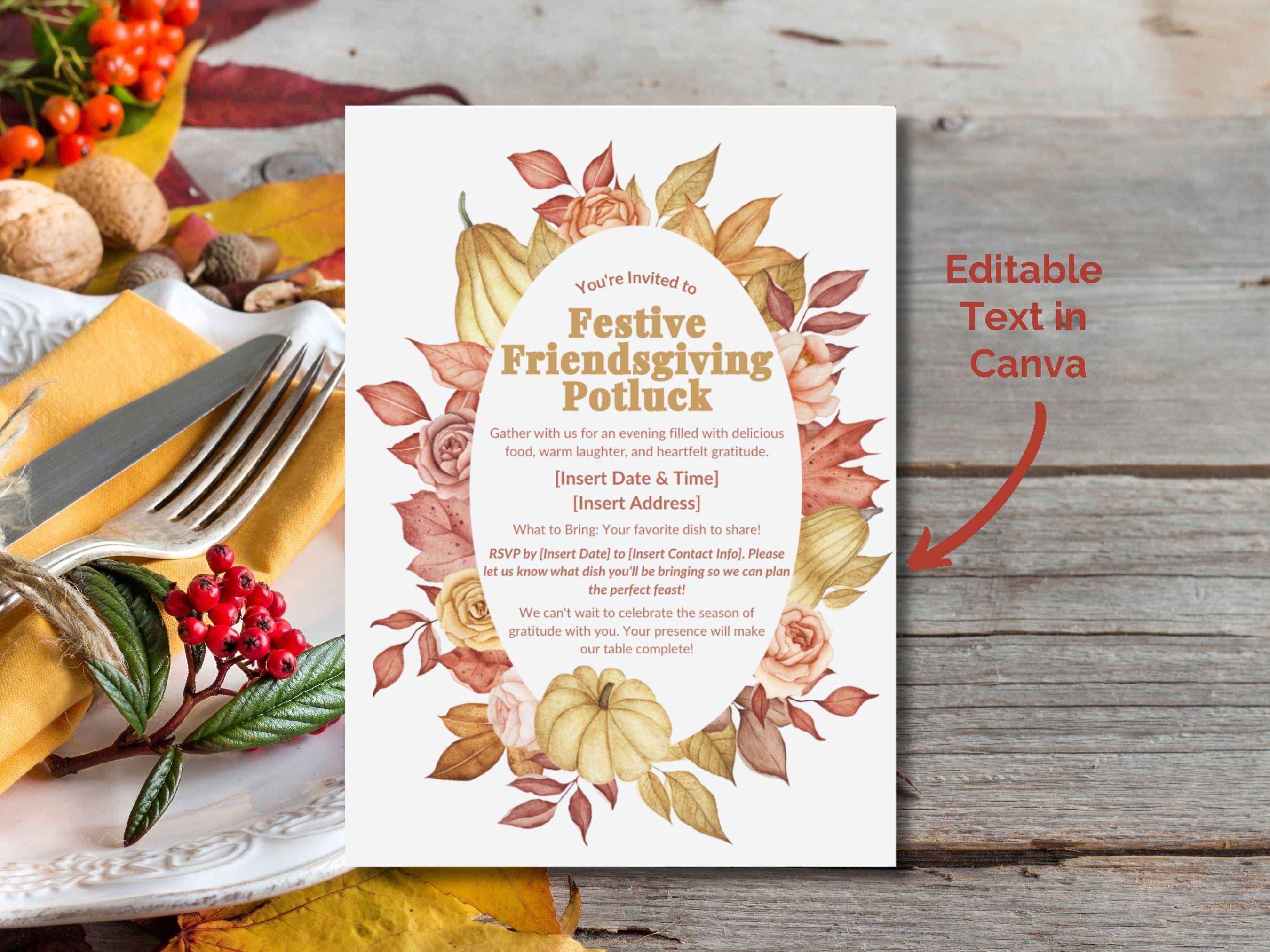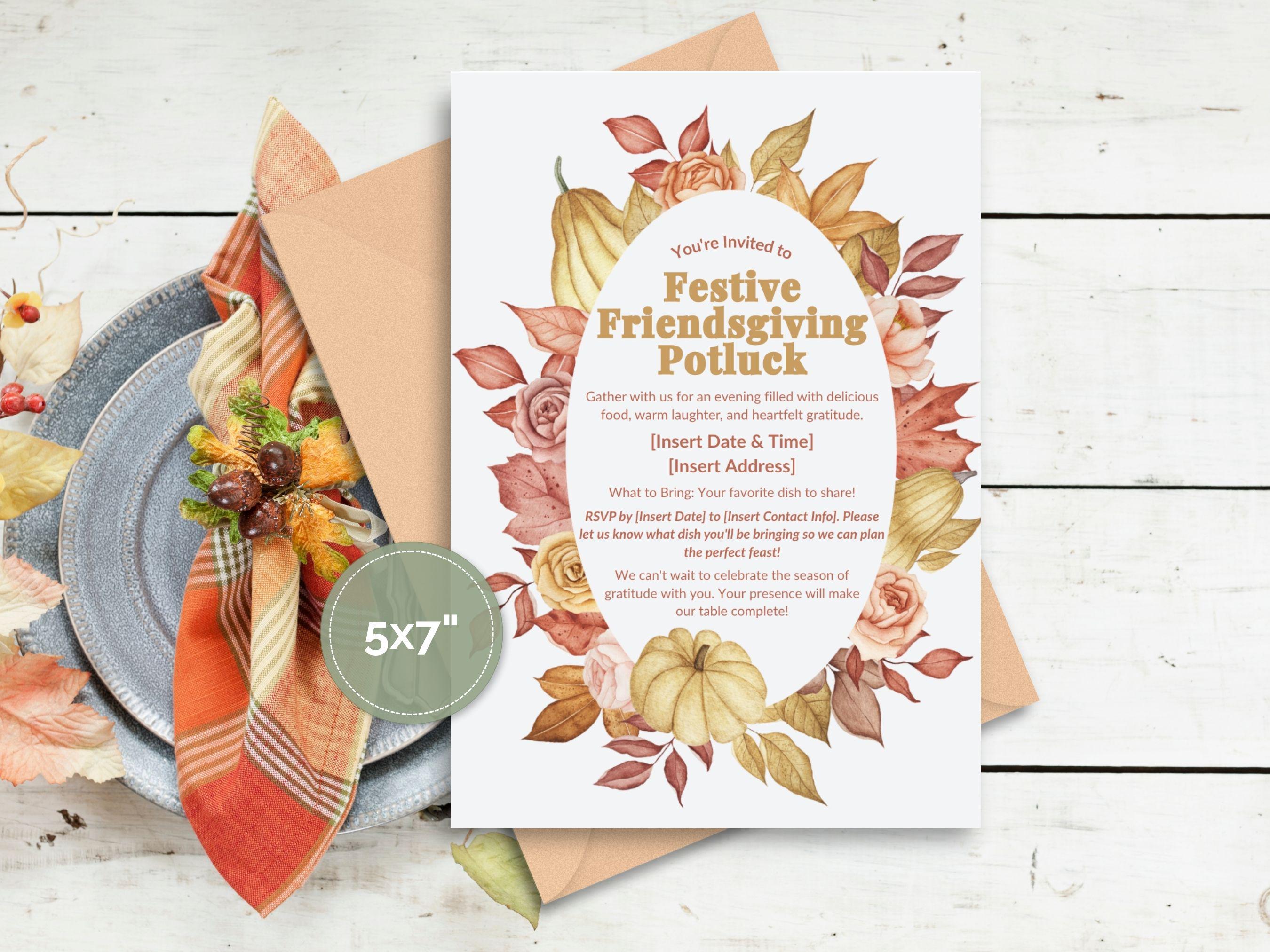 What Makes These Invitations Special Two 5x7 invitations per 8.5x11 sheet - Perfect for printing at home or your local print shop Fully customizable text fields - Easy to edit in Canva for your specific event details Elegant autumn design - Features beautiful floral elements that embody the harvest season Warm, welcoming message - Sets the perfect tone for your gratitude-filled gathering
