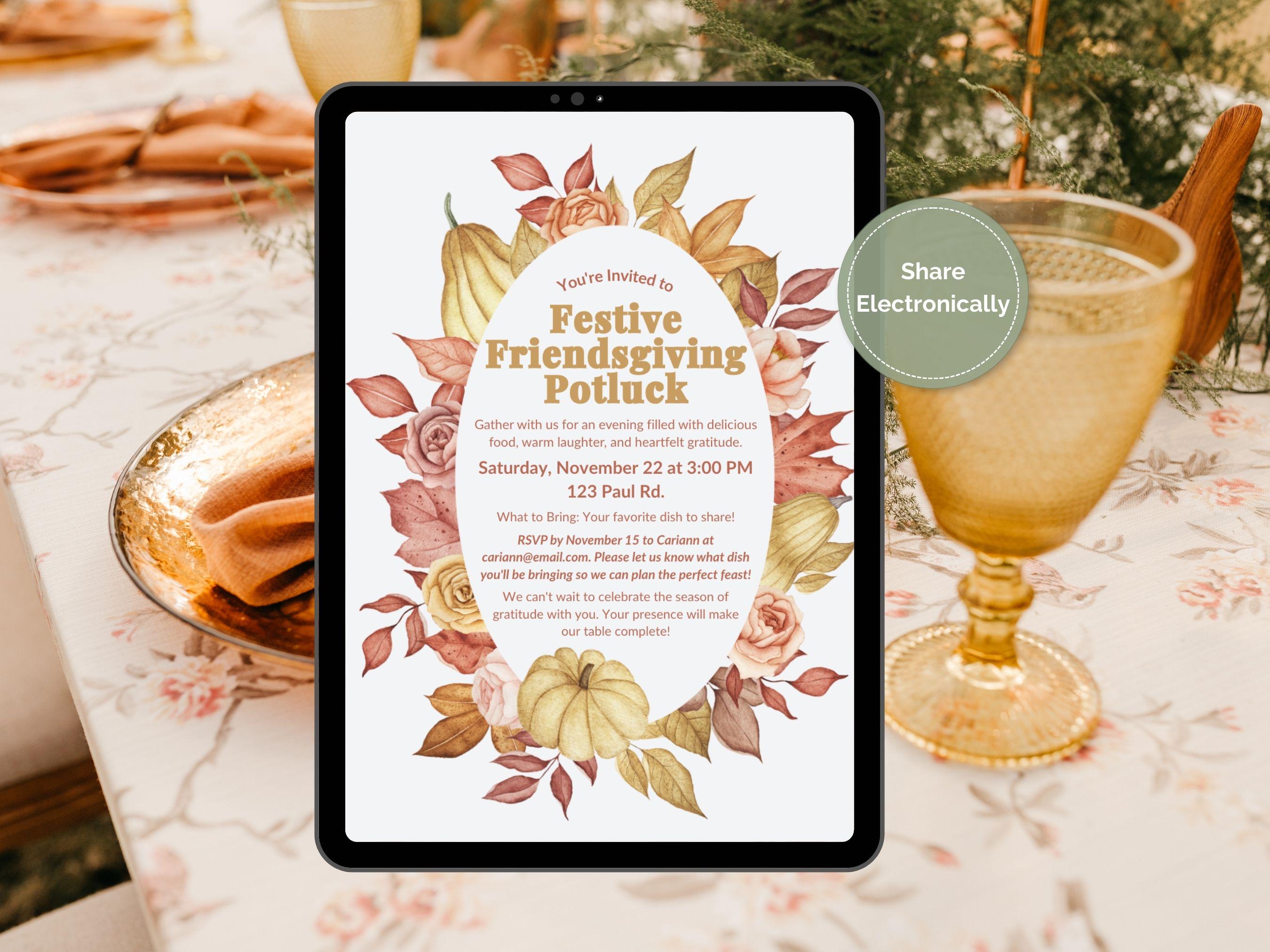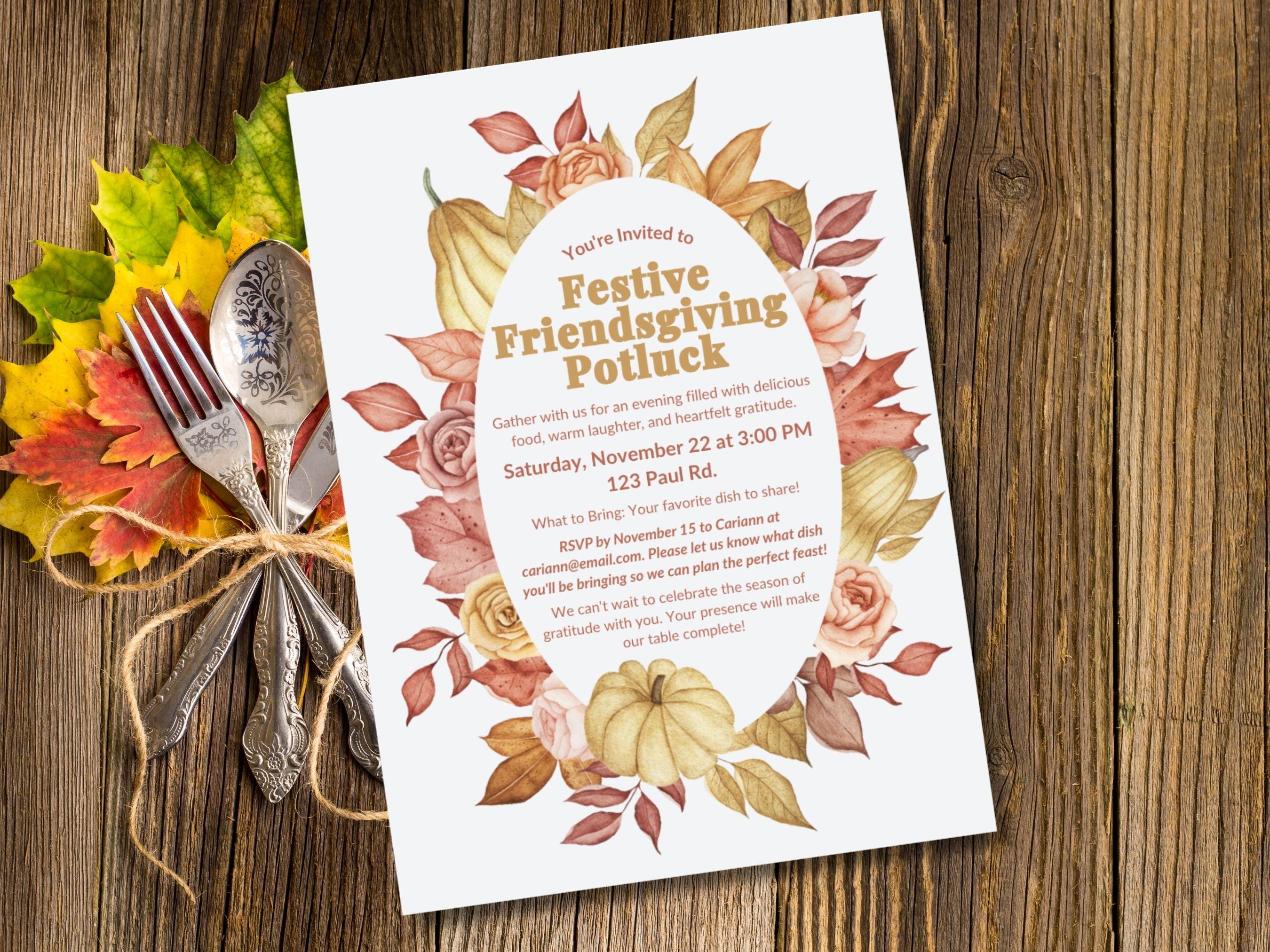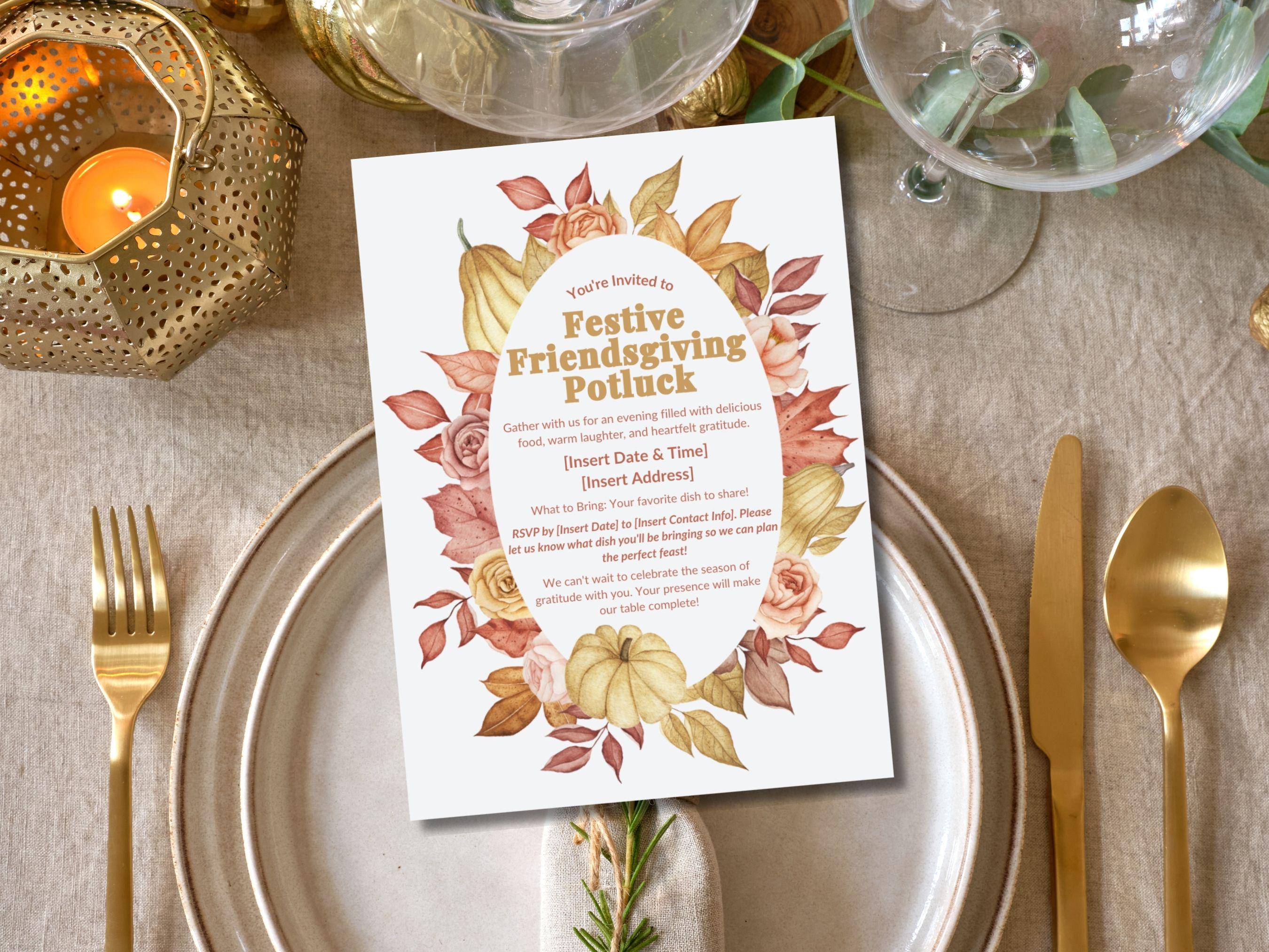 What Makes These Invitations Special Two 5x7 invitations per 8.5x11 sheet - Perfect for printing at home or your local print shop Fully customizable text fields - Easy to edit in Canva for your specific event details Elegant autumn design - Features beautiful floral elements that embody the harvest season Warm, welcoming message - Sets the perfect tone for your gratitude-filled gathering