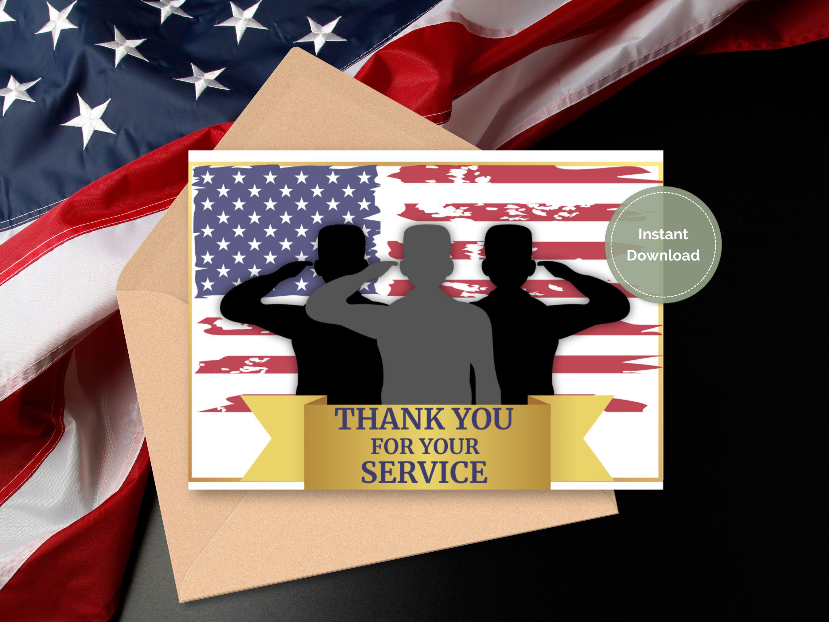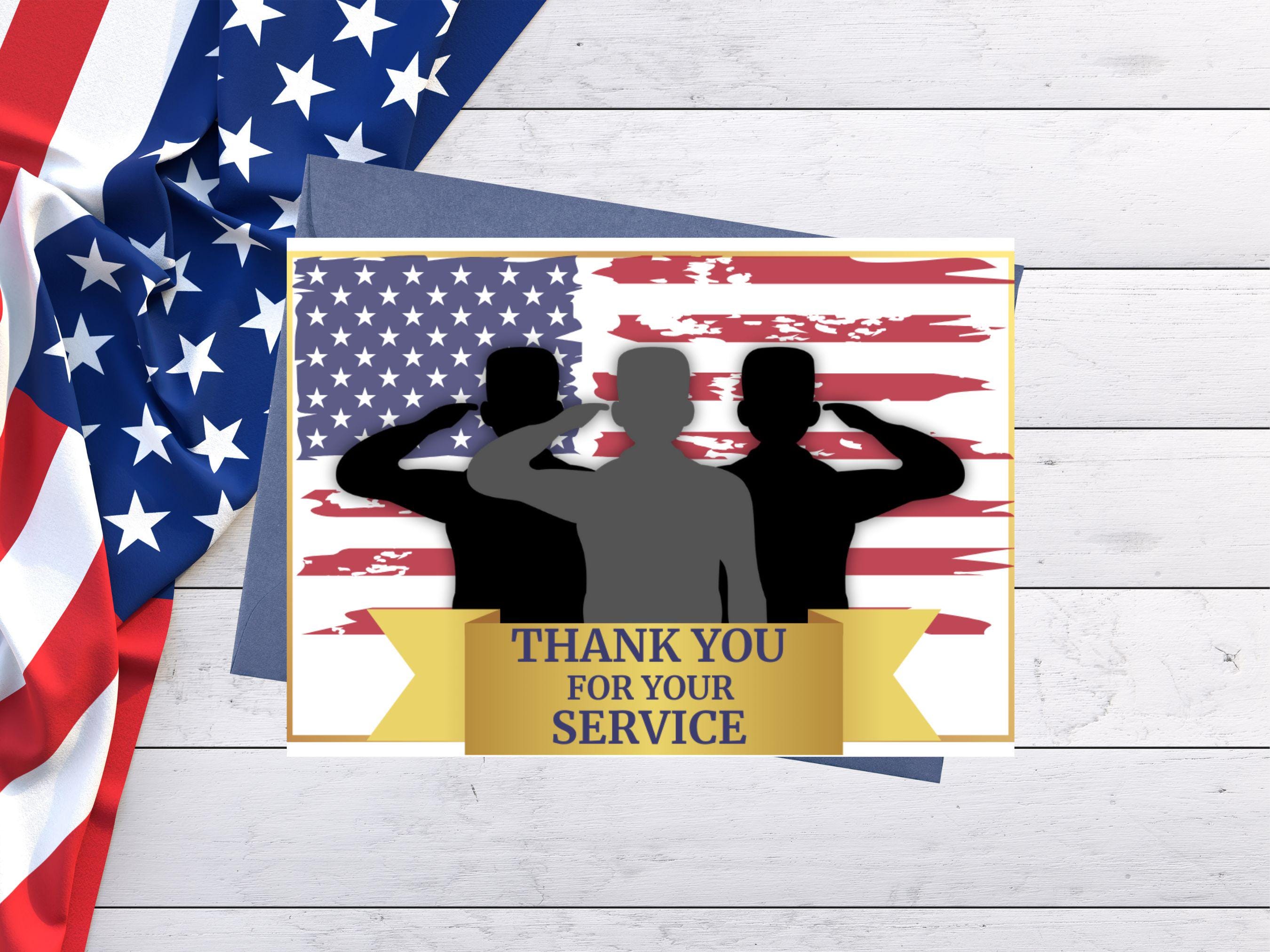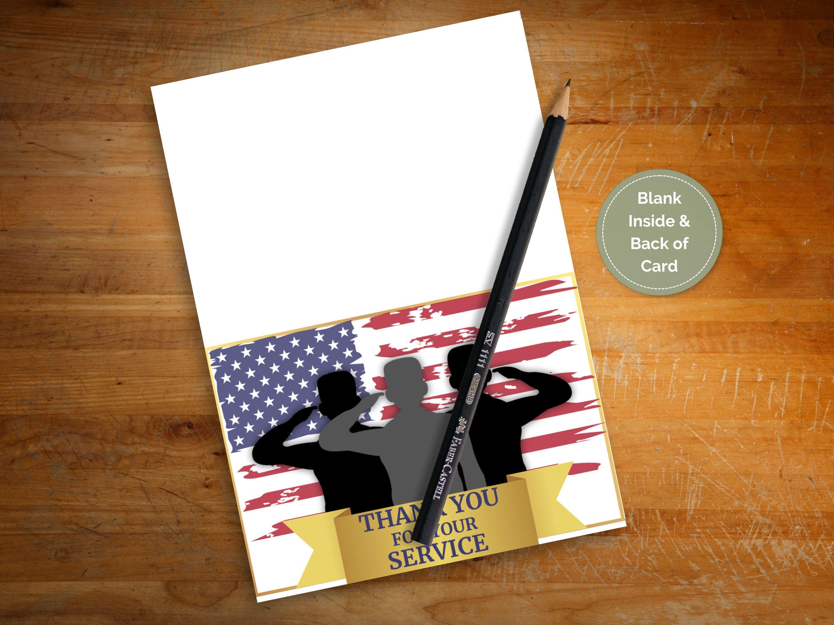 Design Features This touching tribute card showcases: Striking American flag background with authentic distressed texture Three saluting soldiers in silhouette representing all branches of military service Elegant gold ribbon banner with bold "THANK YOU FOR YOUR SERVICE" message Blank interior for your personalized message of gratitude Professional print quality optimized for home or commercial printing