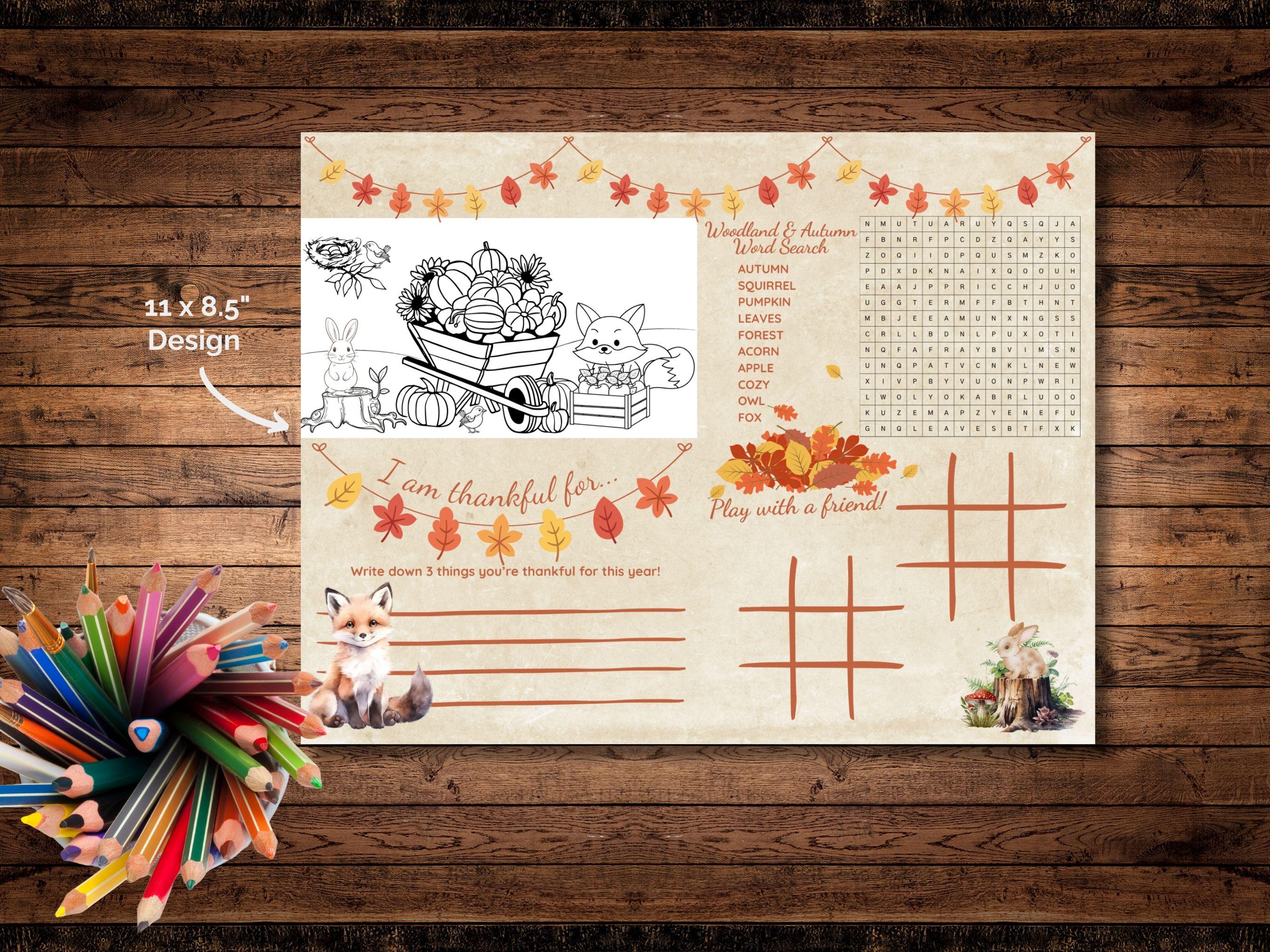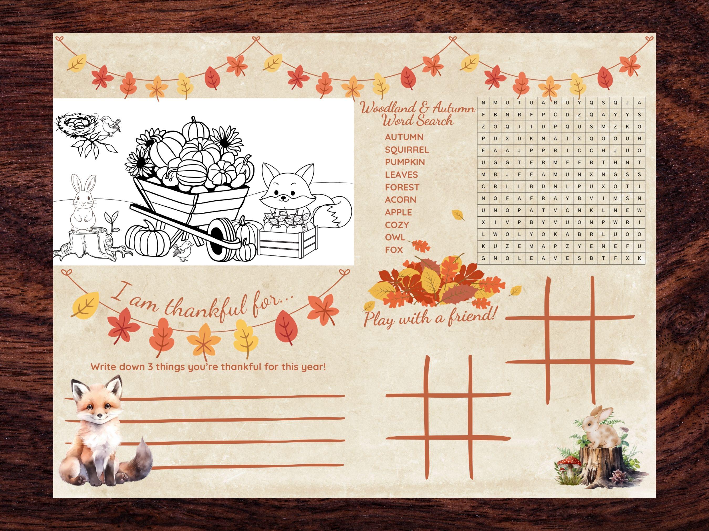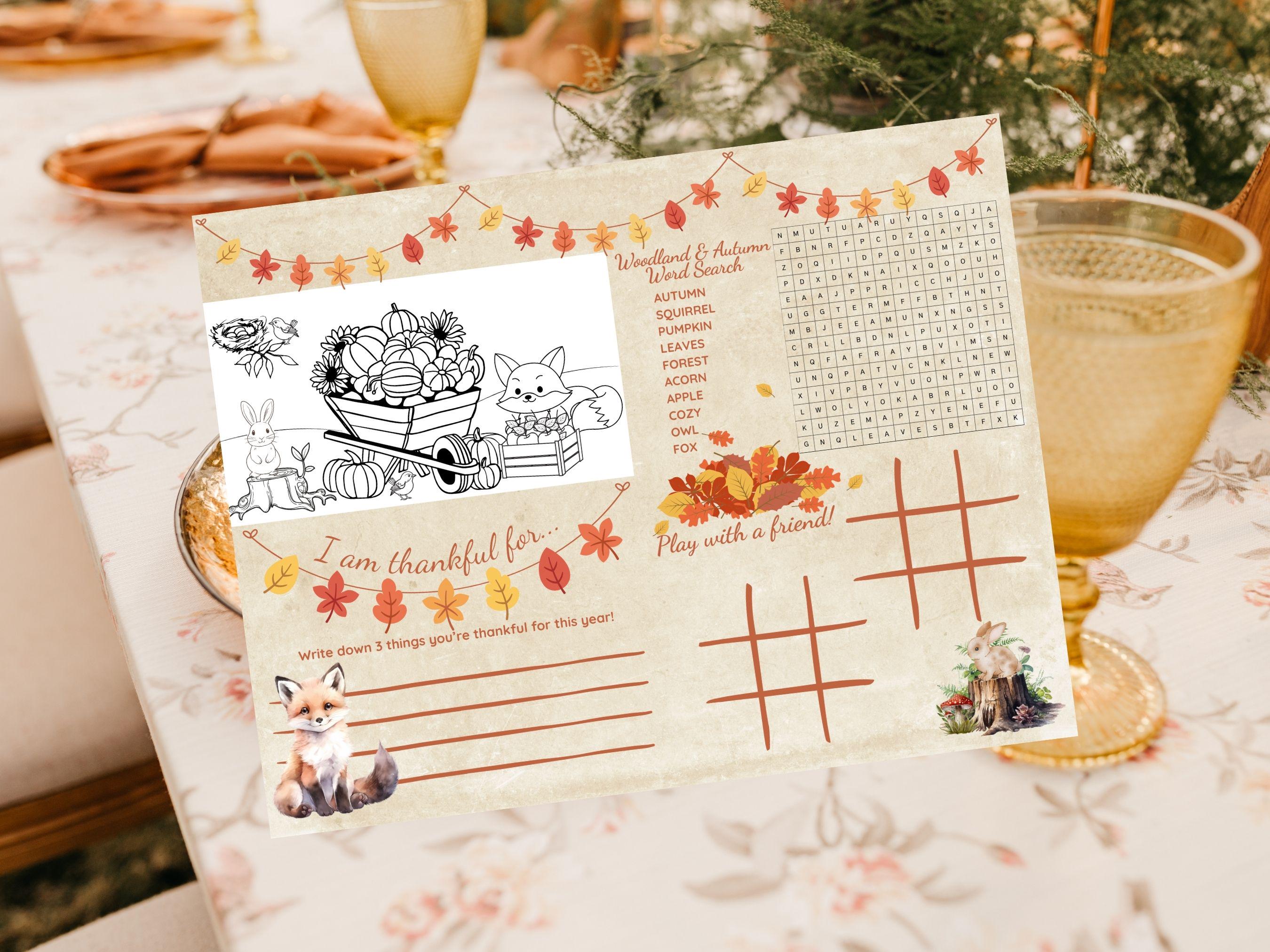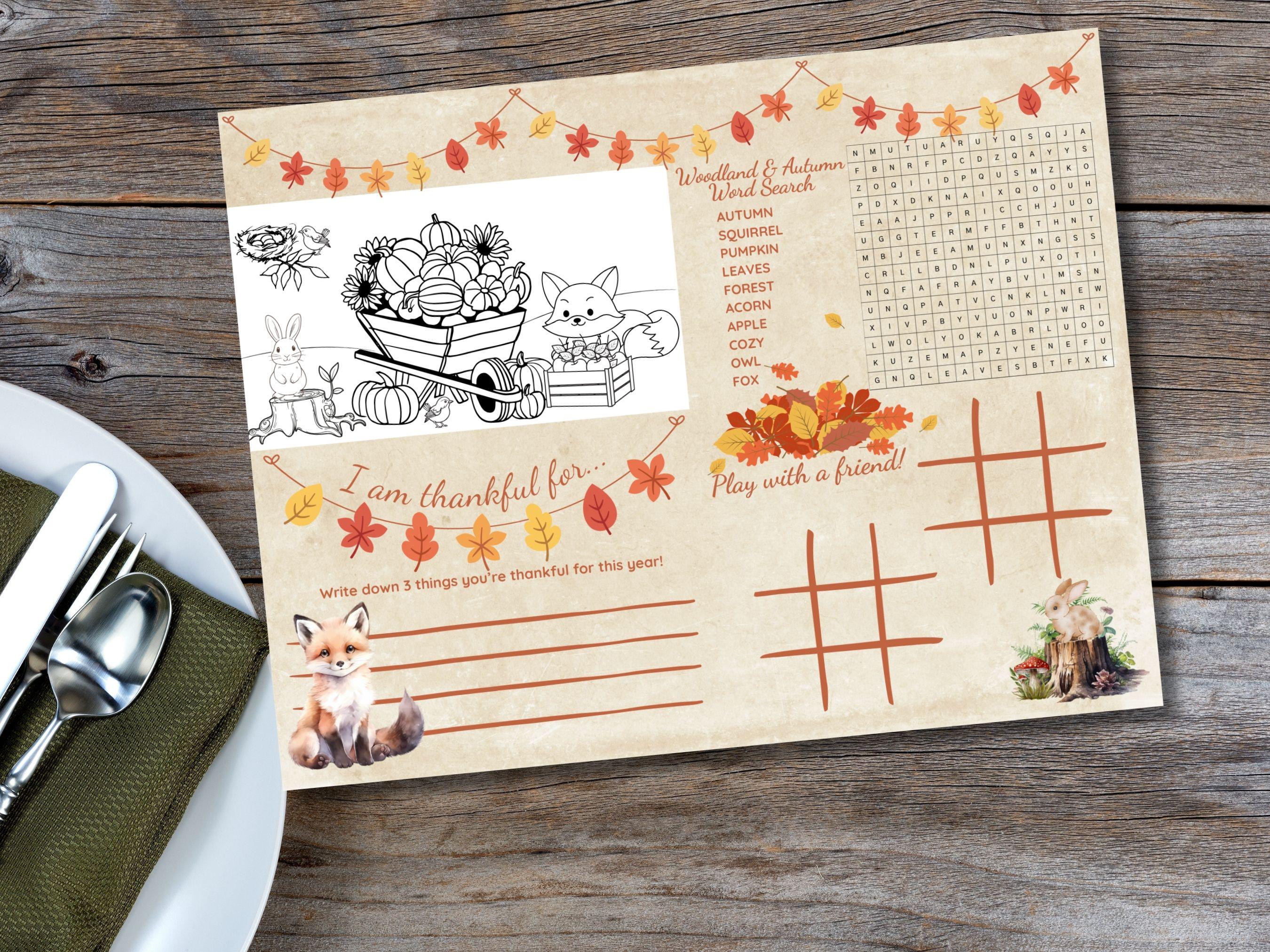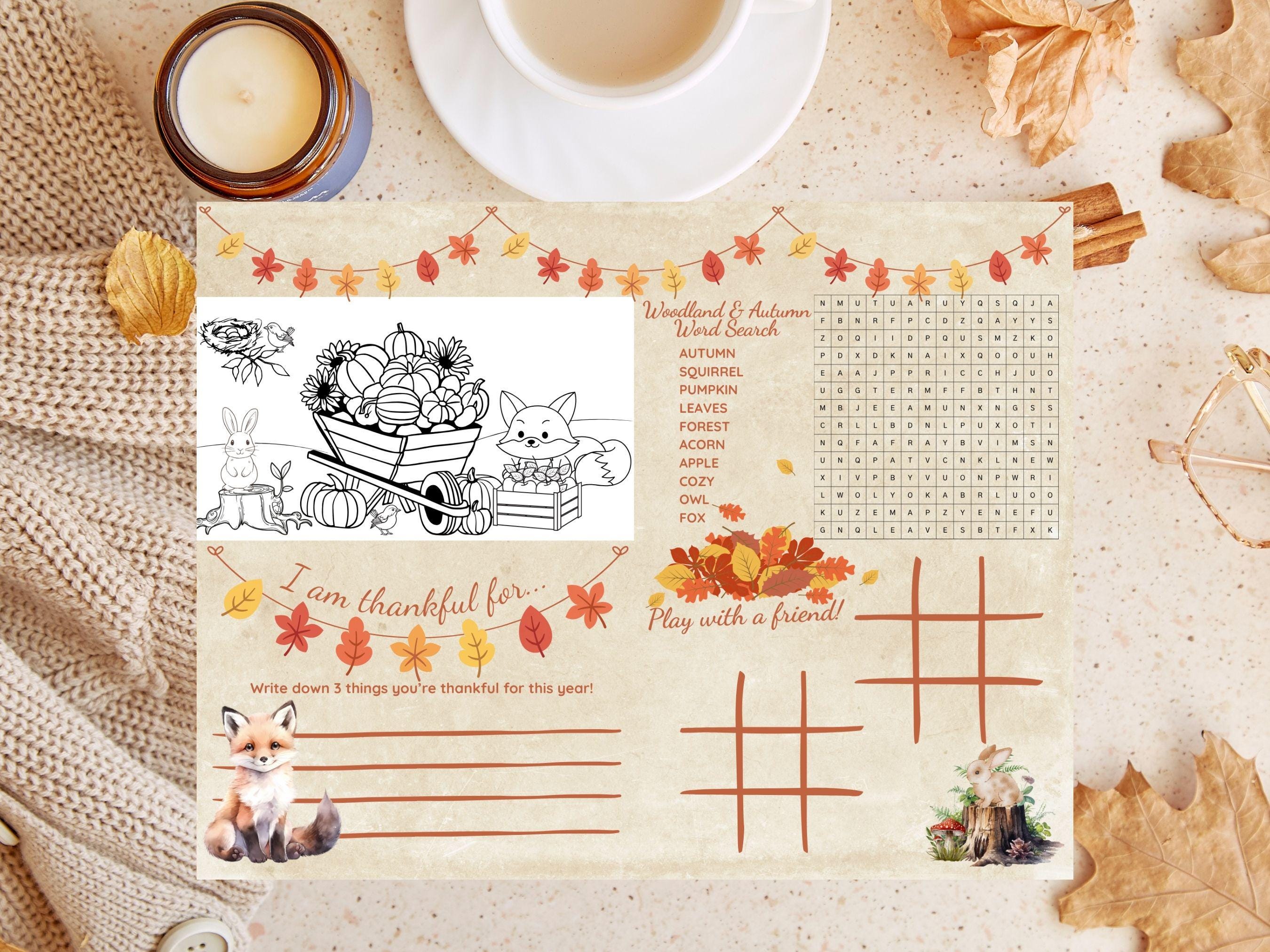Whimsical Woodland Kids' Activity Placemat - Instant Download Make your family gatherings and fall celebrations extra special with this Whimsical Woodland Kids' Activity Placemat! Packed with fun and charming details, this placemat is designed to keep little ones entertained while adding a bit of seasonal magic to your table.