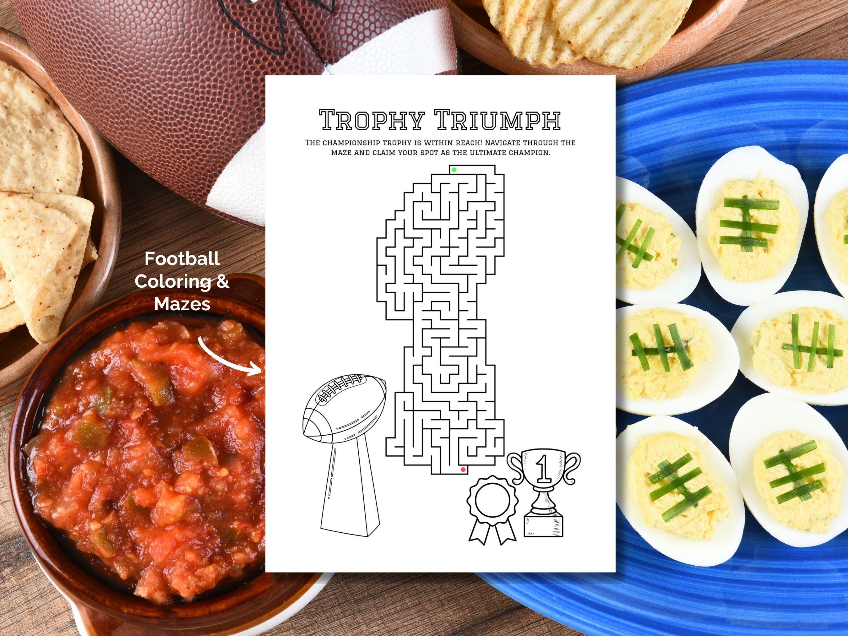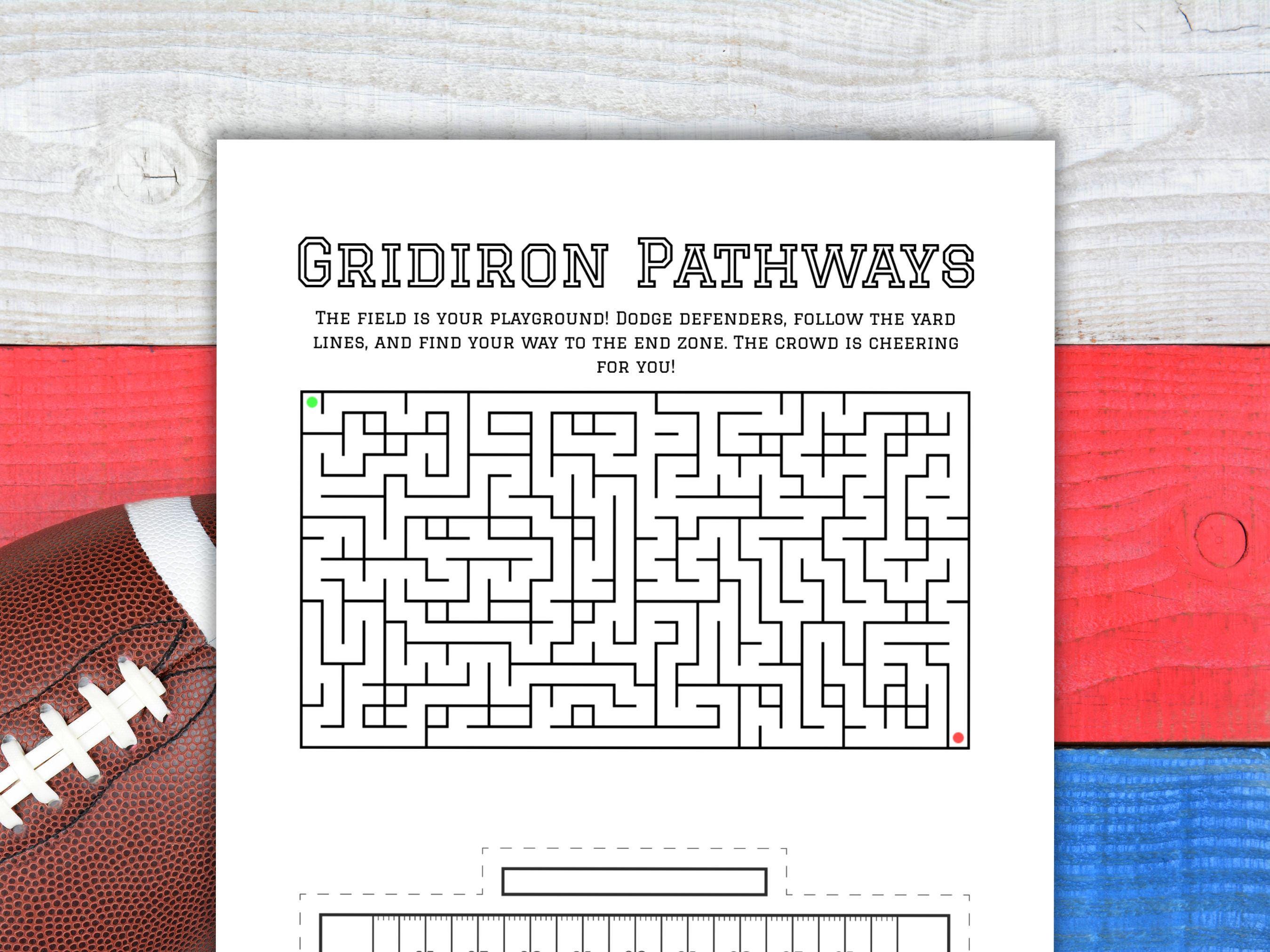 What’s Inside? 13 Football-Themed Mazes: Including "Kickoff Chaos," "Through the Uprights," "Helmet Havoc," and more! Creative Designs: Mazes shaped like footballs, goalposts, jerseys, and even a quarterback! Interactive Fun: Perfect for game day activities, birthday parties, or just keeping kids entertained. Bonus Coloring Fun: Black-and-white designs make these pages great for coloring, too!