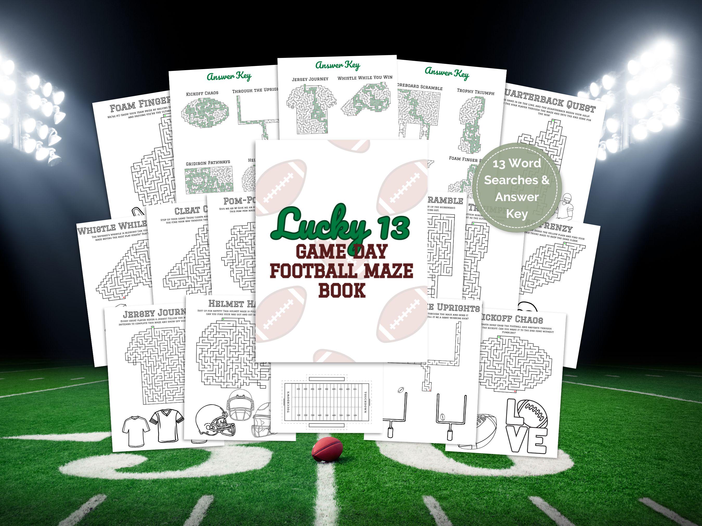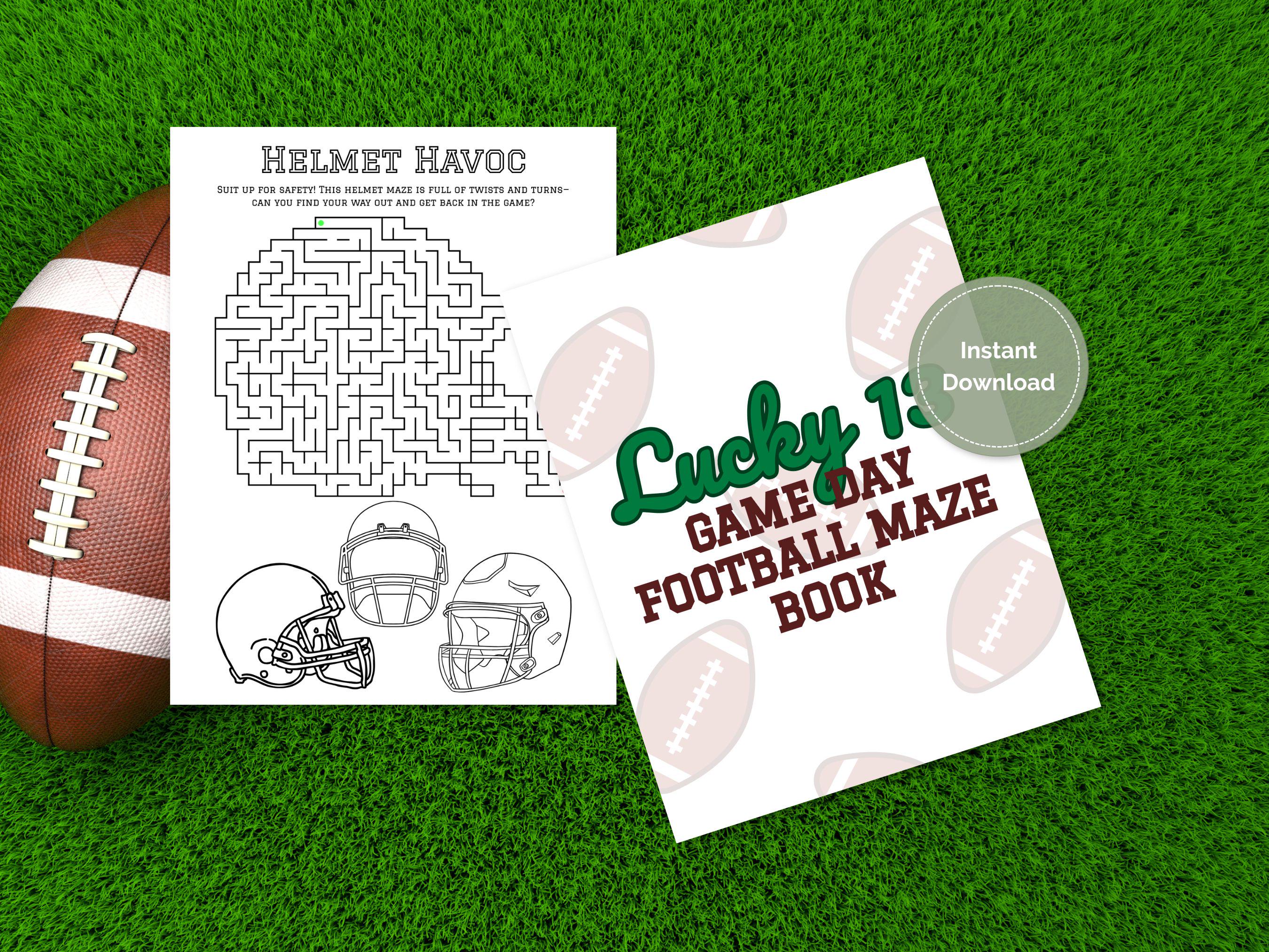 🏈 Lucky 13 Football Maze Book – A Touchdown of Fun! 🏈 Get ready to score big with this football-themed maze book! Perfect for kids, sports fans, and anyone who loves a good challenge, this printable activity book features 13 unique mazes inspired by all things football. From navigating the chaos of a kickoff to leading the quarterback to victory, each page is packed with fun and excitement!