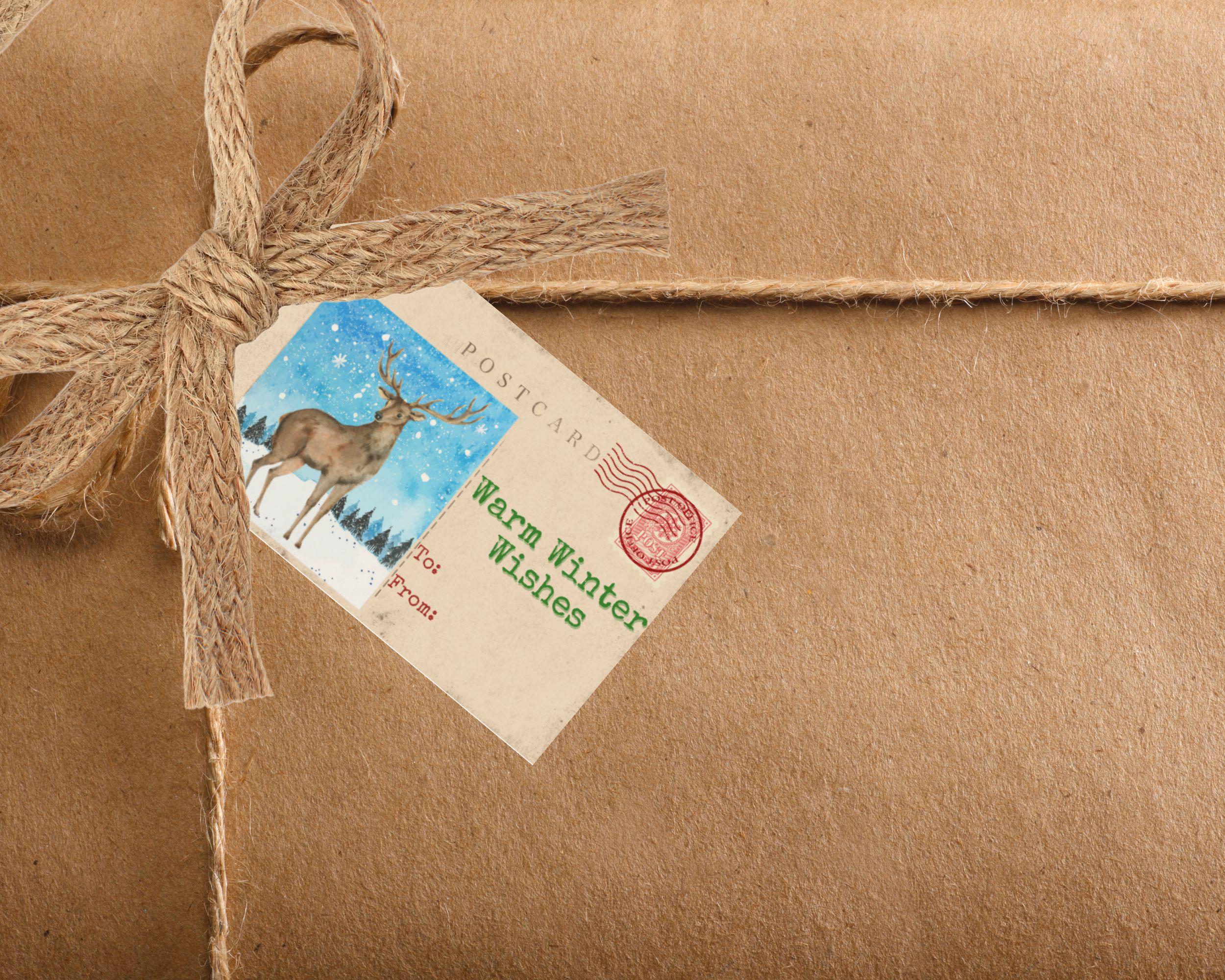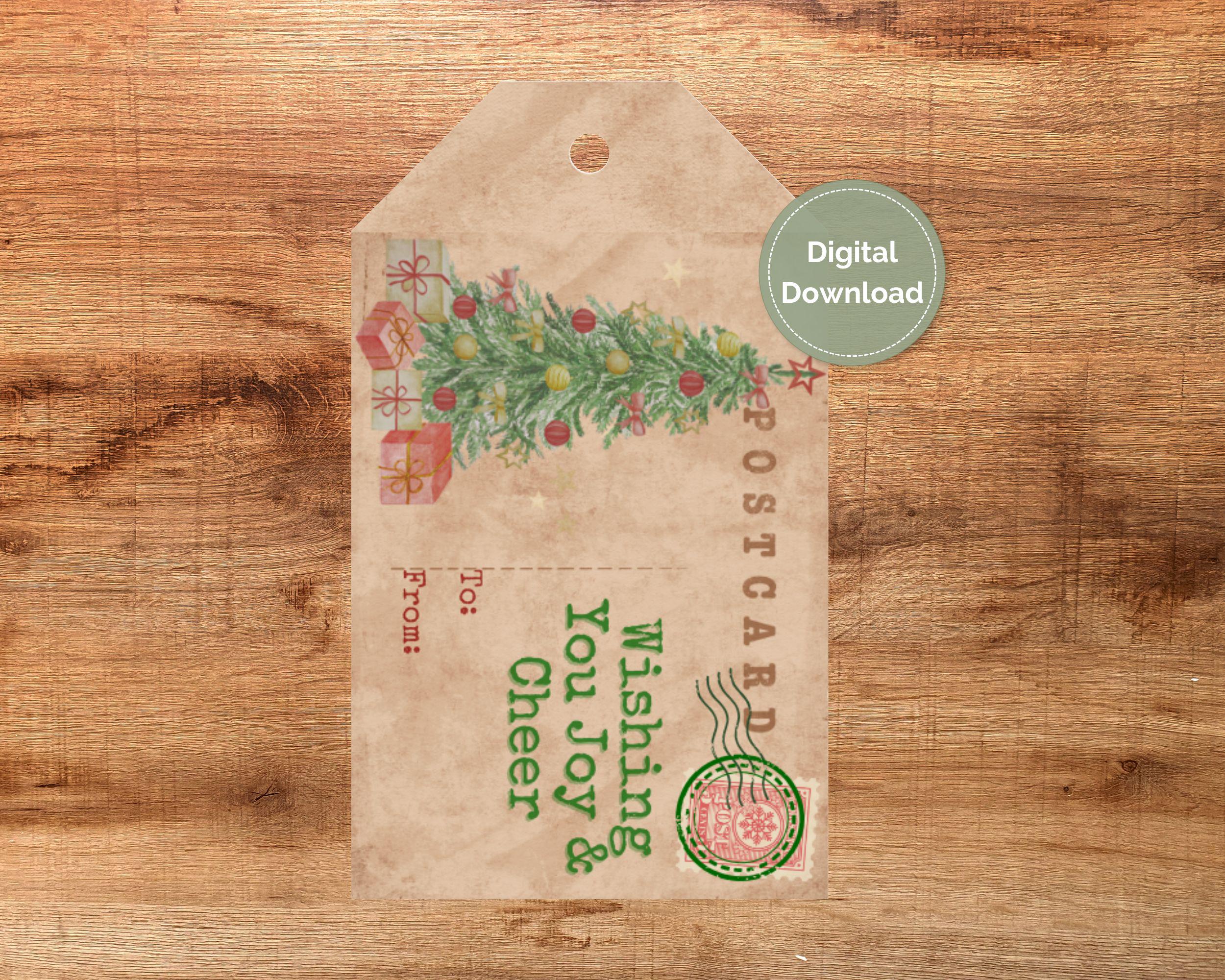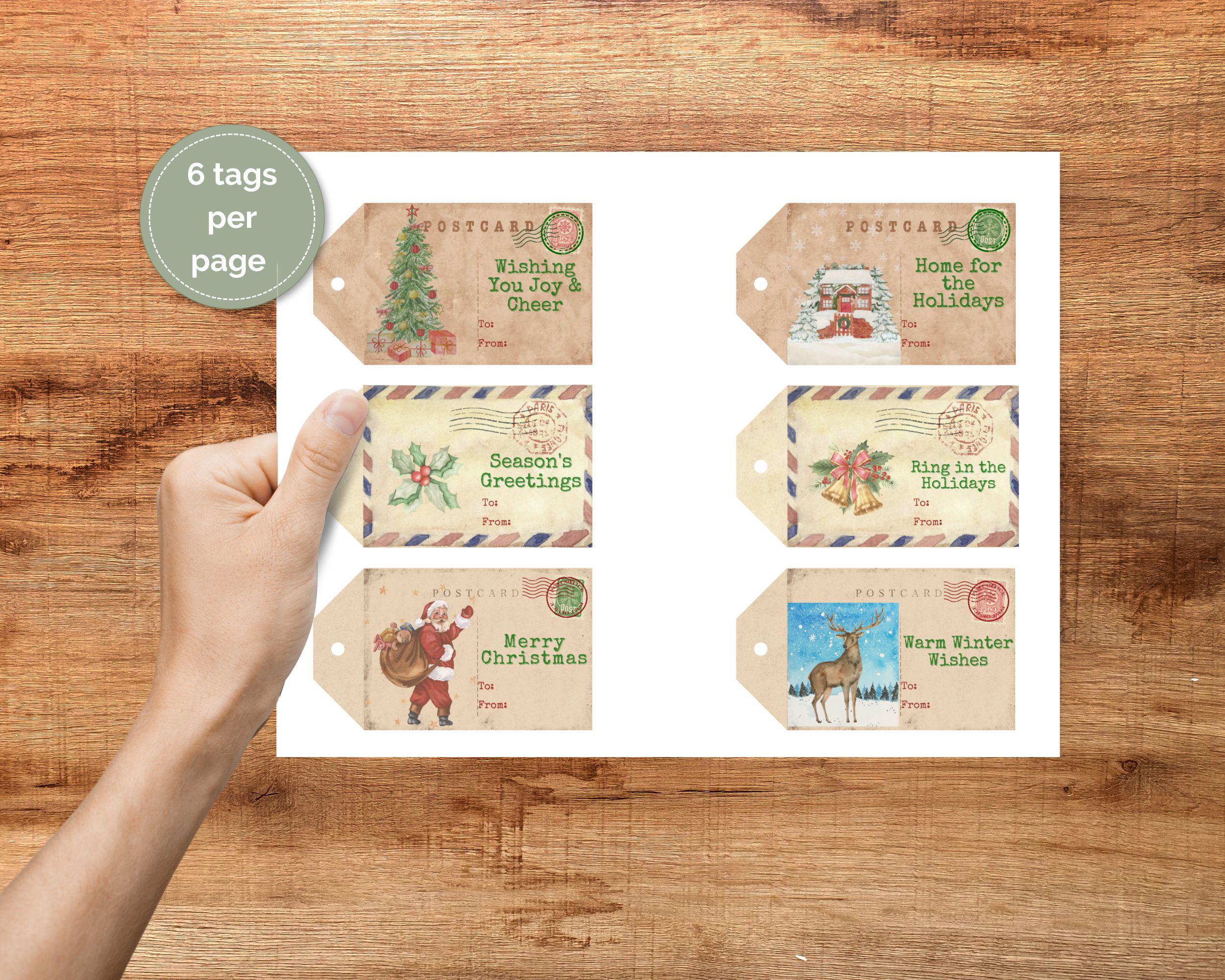 Features: Designs: Includes six unique vintage-inspired illustrations, featuring a Christmas tree, Santa Claus, snowy house, holly and berries, golden bells, and a majestic deer. Postcard Aesthetic: Each tag is designed with a distressed paper texture, "POSTCARD" header, festive greetings, and decorative postmarks for an authentic antique look. Printable Format: Delivered as a high-resolution 8.5x11-inch PDF file, ready to print on your home printer or at a local print shop. Easy to Use: Simply print, cut along the guidelines, and add your personal touch with the "To" and "From" fields.