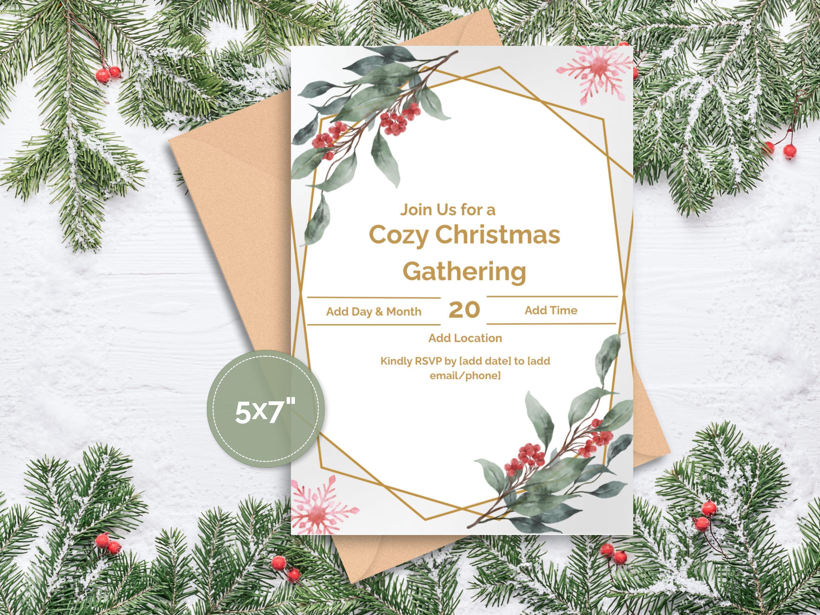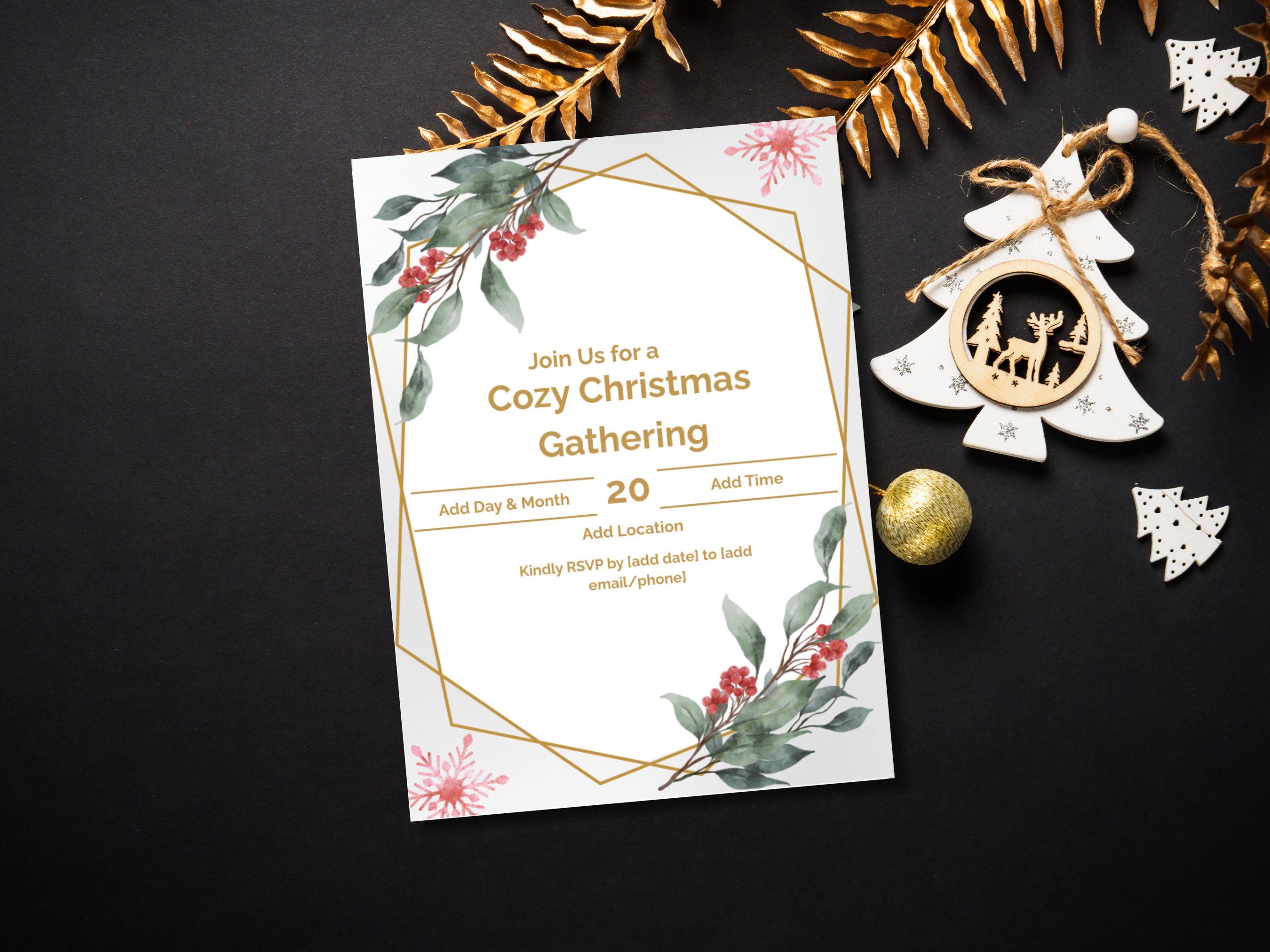 What You'll Receive This listing is for an editable template that allows you to create a stunning, personalized Christmas invitation right from your home. No more waiting for shipping or struggling with complicated software. Instantly Editable in Canva: Easily customize your invitation using the free and user-friendly Canva platform. Change text, fonts, and colors to perfectly match your event. Elegant Minimalist Design: Features a stylish gold geometric frame, delicate watercolor holly and berries, and subtle snowflake accents for a truly unique look. Fully Customizable Details: Personalize all the important information for your guests, including the date, time, location, and RSVP details. Printable & Digital: Print your invitations at home, at a local print shop, or send them digitally via email or social media.