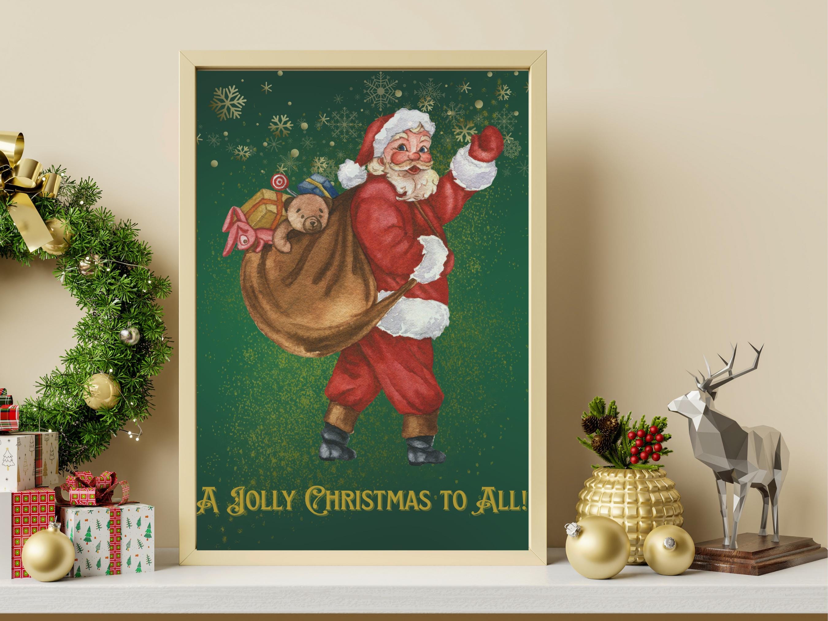 Retro Santa Illustration 🎅 Feel the joy of the season with this heartwarming depiction of a jolly Santa Claus! With a twinkle in his eye and a sack full of toys, he walks against a deep green background dotted with shimmering golden snowflakes. The message "A JOLLY CHRISTMAS TO ALL!" adds a final touch of classic holiday cheer. This piece is pure, festive nostalgia.