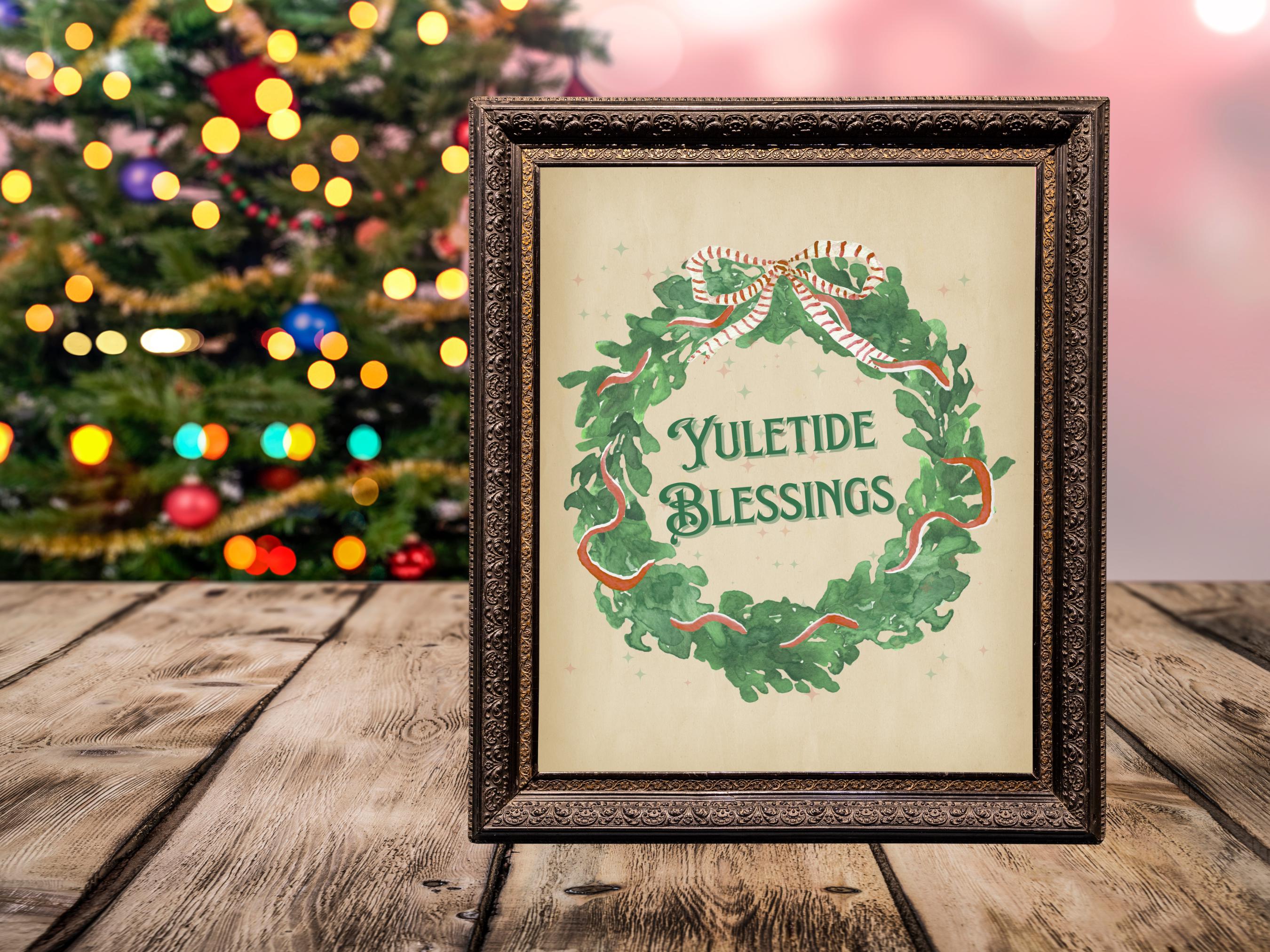Yuletide Wreath 🌿 Welcome friends and family with this elegant watercolor wreath. Lush green leaves are interwoven with a charming red-and-white candy cane striped ribbon, creating a timeless symbol of holiday hospitality. Centered within is the warm greeting "YULETIDE BLESSINGS" in a beautiful vintage font, all set against a soft, parchment-like background.