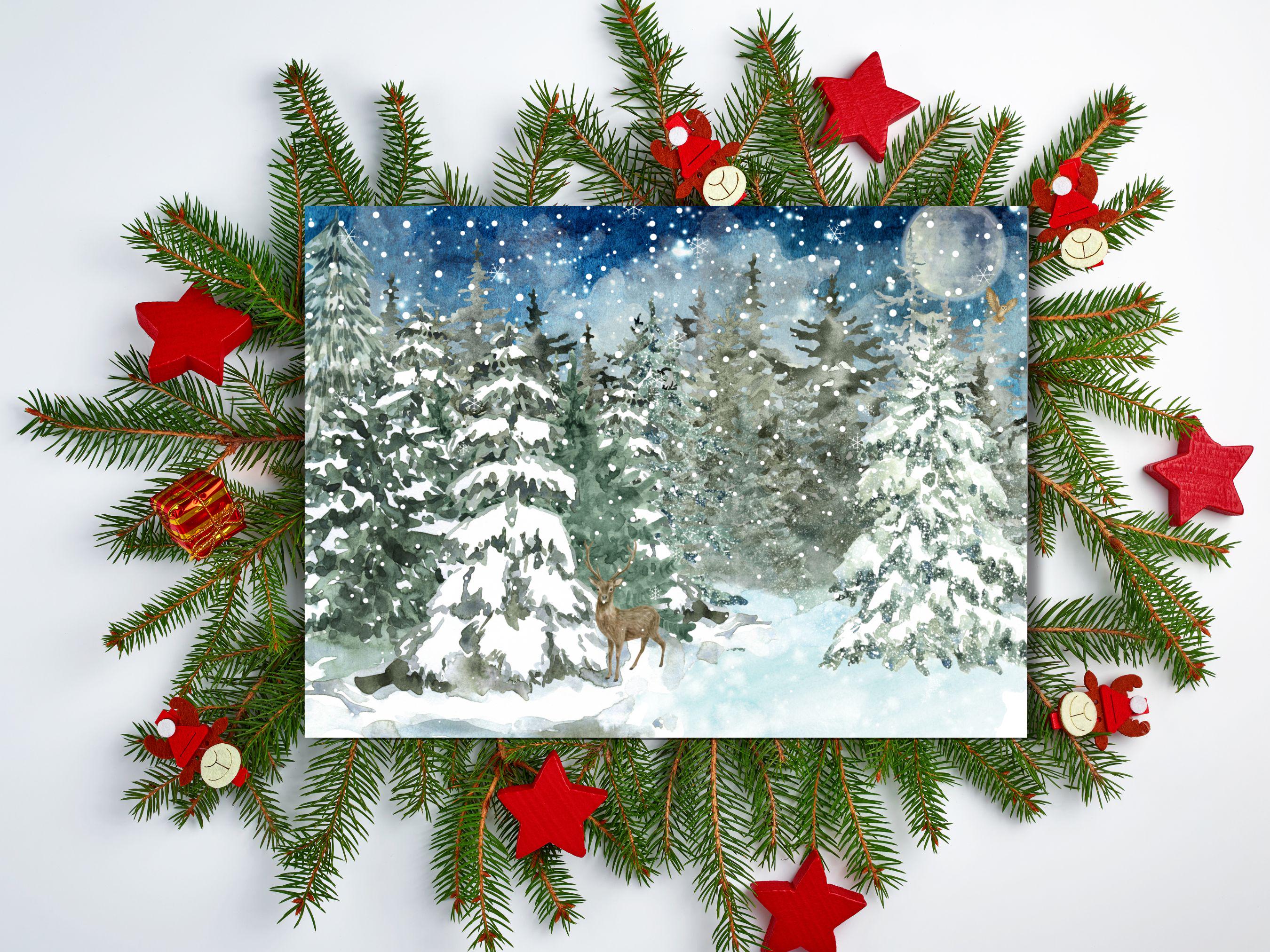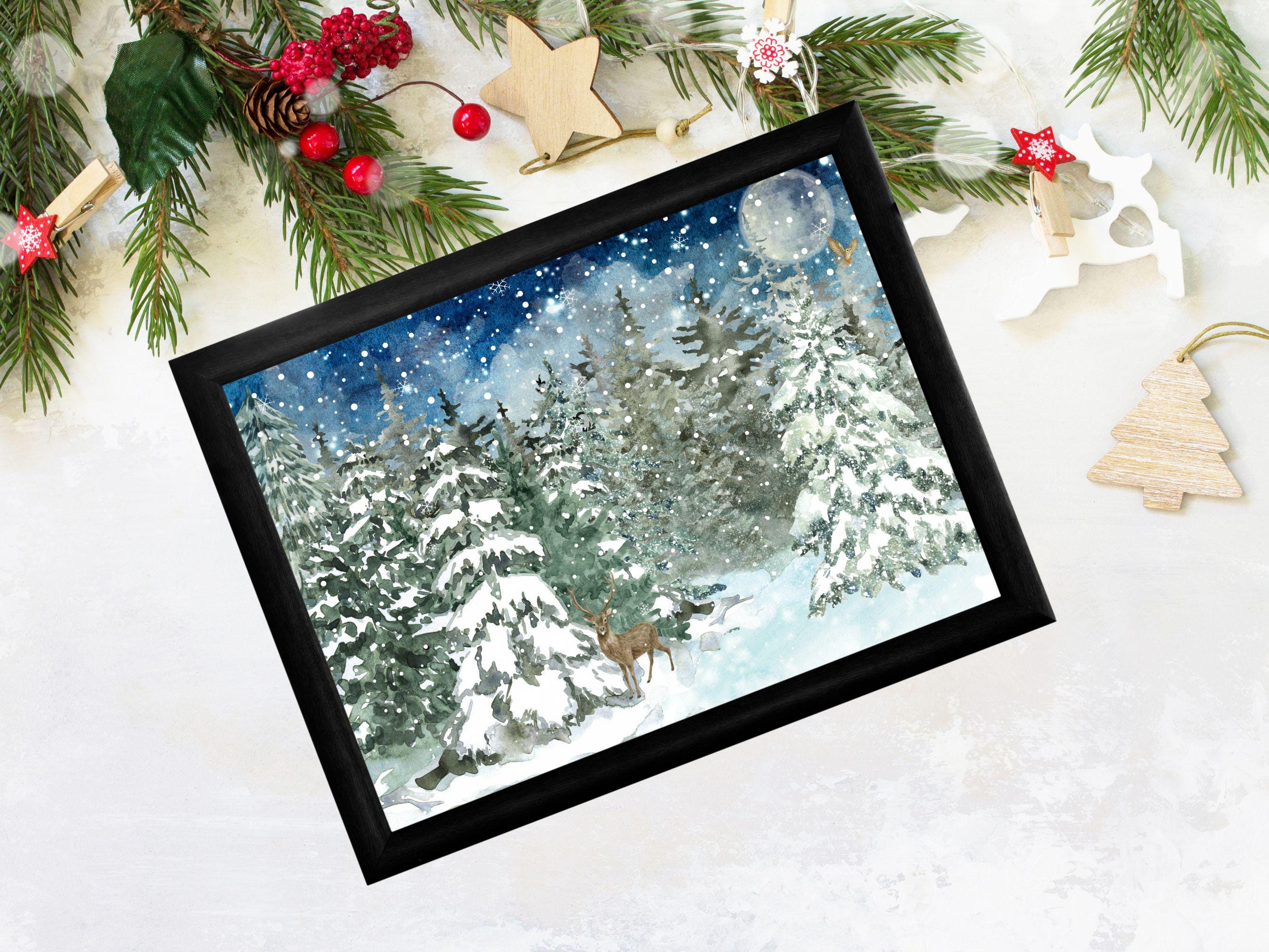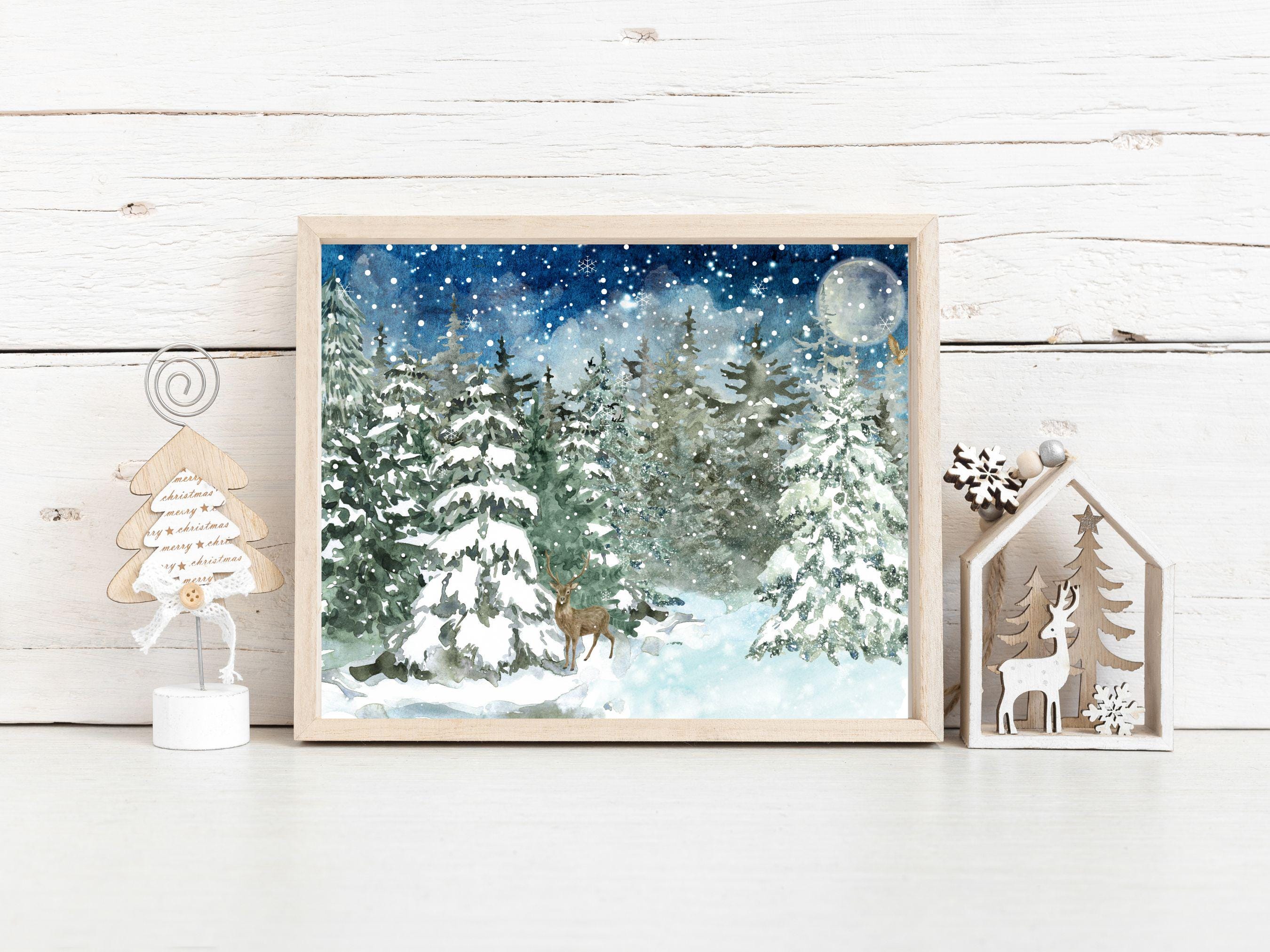 ✨ Discover the Details This high-quality print is a reproduction of an original watercolor painting, preserving the soft textures and rich, layered colors of the handcrafted artwork. Enchanting Atmosphere: 🌌❄️ The deep blues of the night sky and the crisp whites of the snow create a calm, magical mood perfect for the holiday season. Artistic Style: 🖌️ The delicate watercolor technique lends a soft, dreamy quality, making it a unique and sophisticated addition to your decor. Versatile Decor: 🏡 This Christmas wall art is perfect for adding a touch of festive elegance to your living room, bedroom, entryway, or office. Thoughtful Gift: 🎁 This holiday watercolor print makes a beautiful and memorable gift for nature lovers, art enthusiasts, or anyone who cherishes the magic of winter.