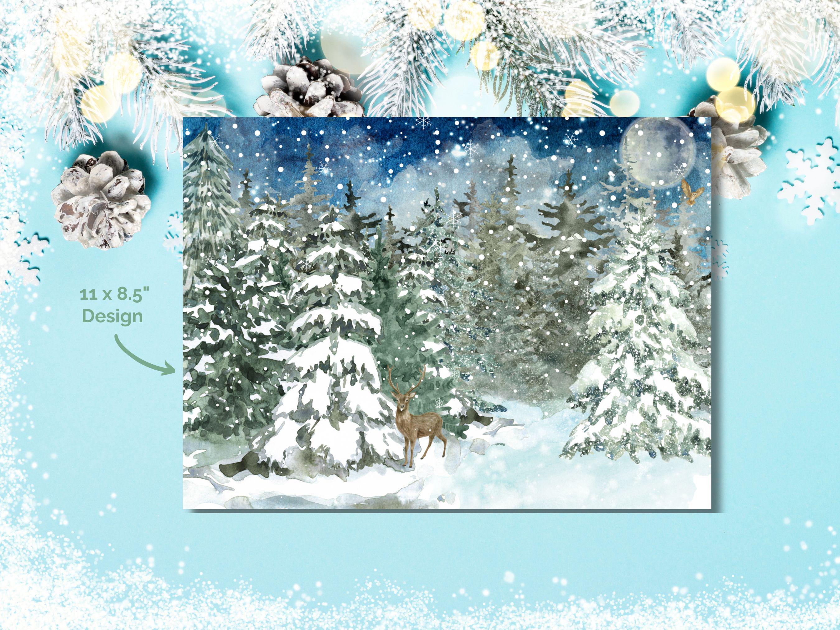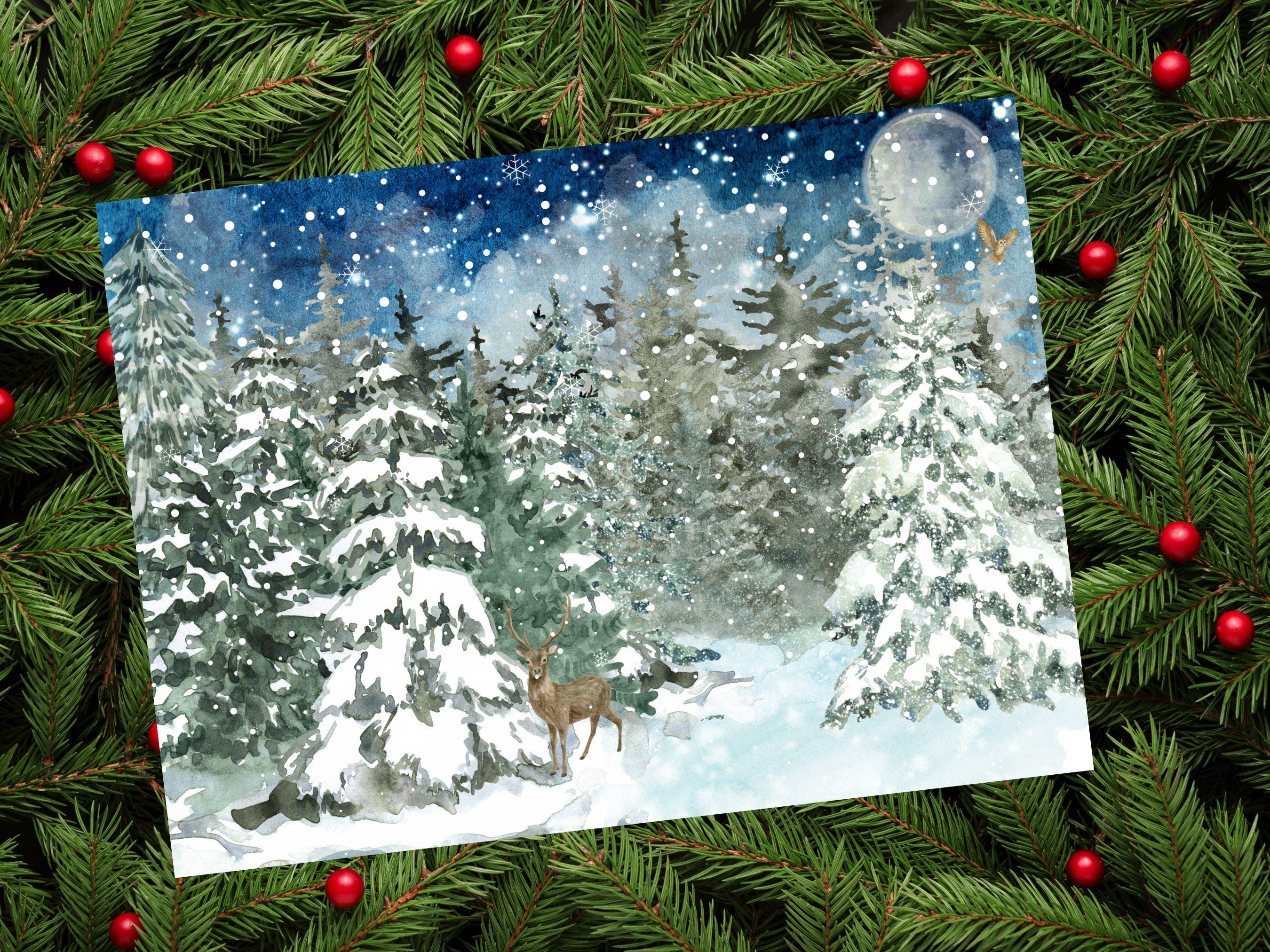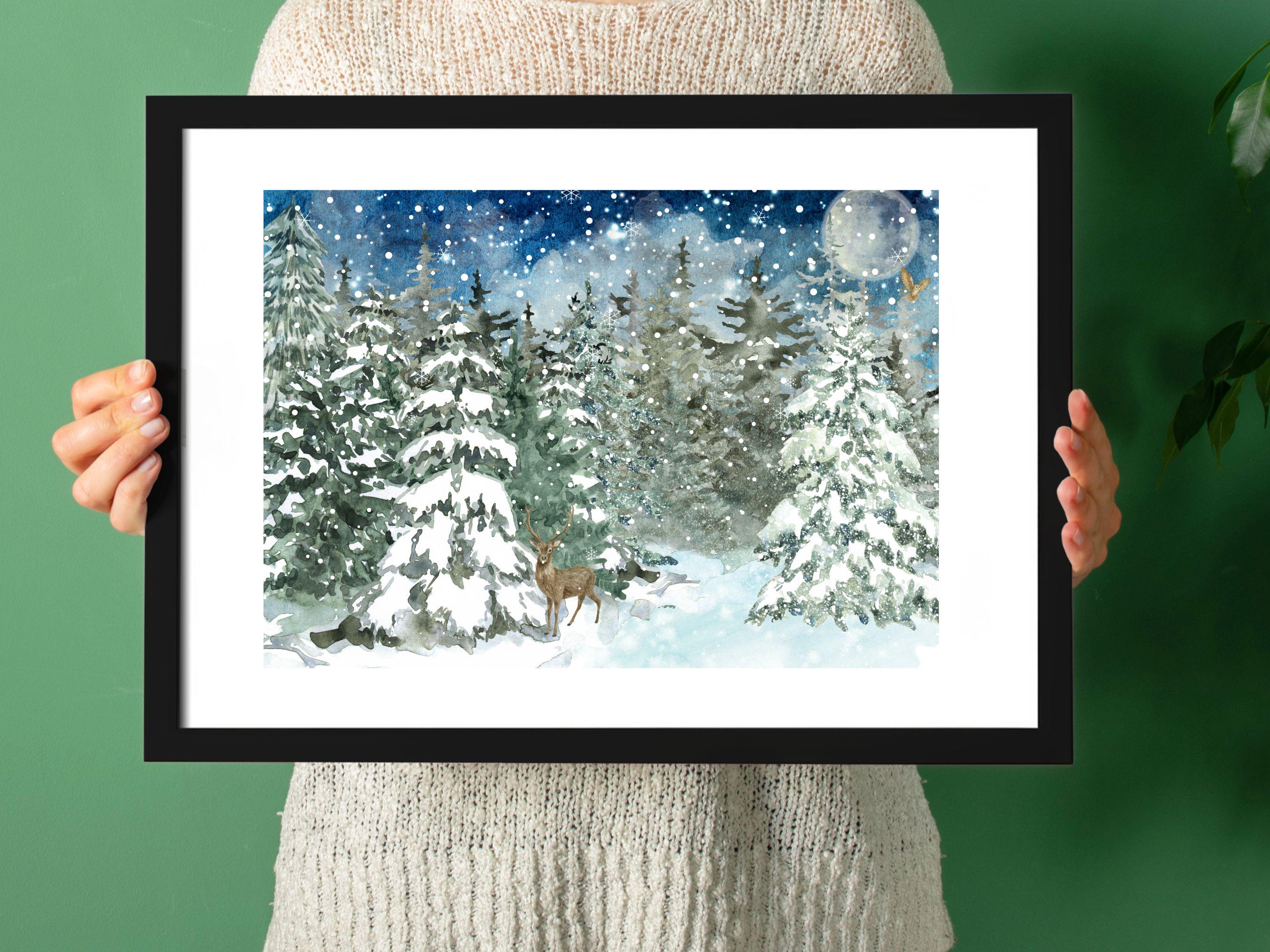 ❄️ Bring the Magic of Winter Indoors 🎄 Welcome a moment of quiet wonder into your home with our "Winter Wonderland - Frosted Forest Scene" watercolor print. This enchanting piece captures a serene winter night, where a majestic deer stands peacefully amidst snow-laden evergreens, a silent owl soars past the glowing full moon, and delicate snowflakes drift through the tranquil air. Let this artwork transform your space into a peaceful, festive sanctuary.
