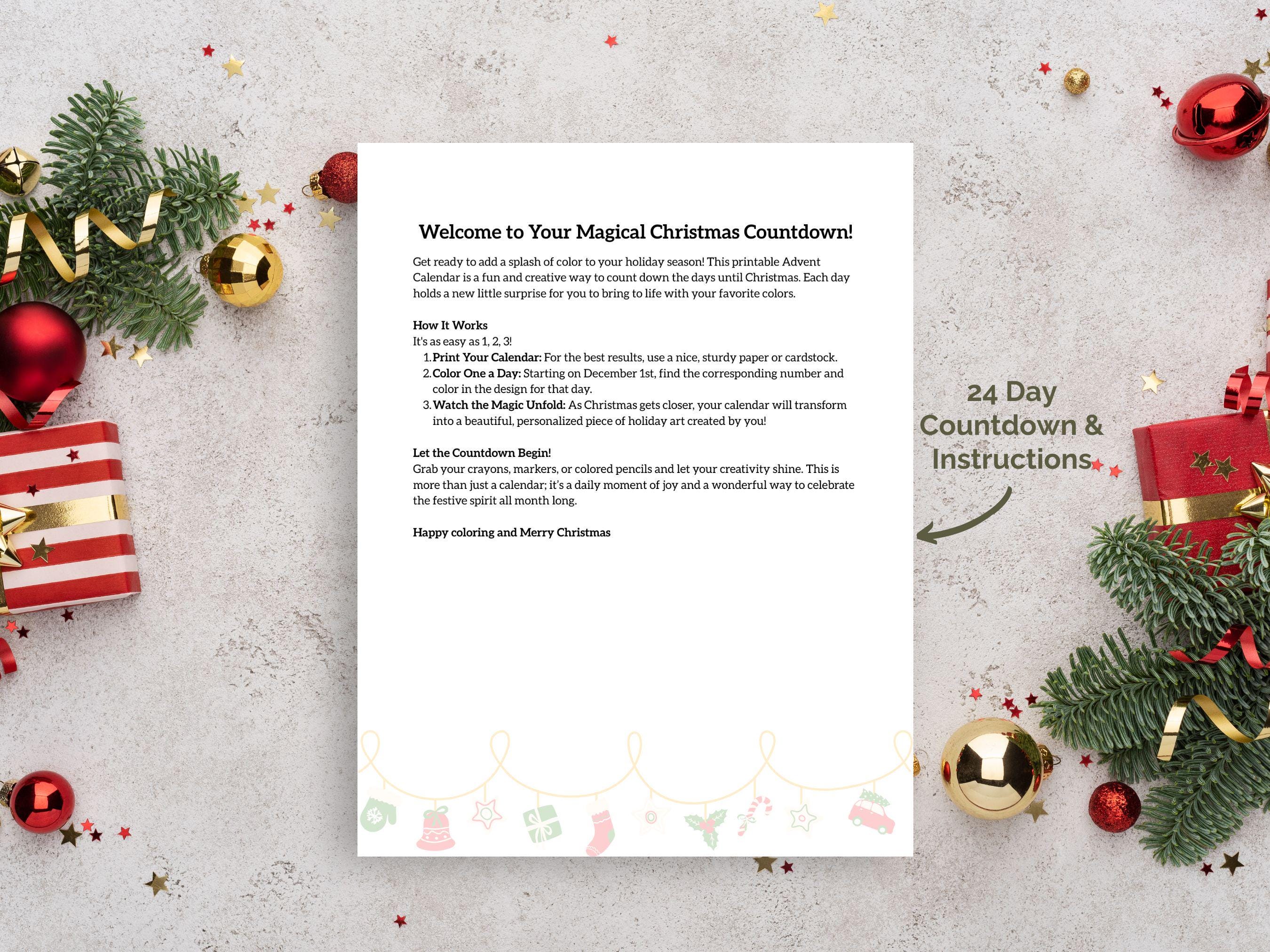 💌 How It Works Purchase this listing. Download your PDF file instantly. Print it on your favorite paper (we recommend cardstock for the best coloring experience!). Color & Countdown! Grab your markers, colored pencils, or crayons and let the festive fun begin!