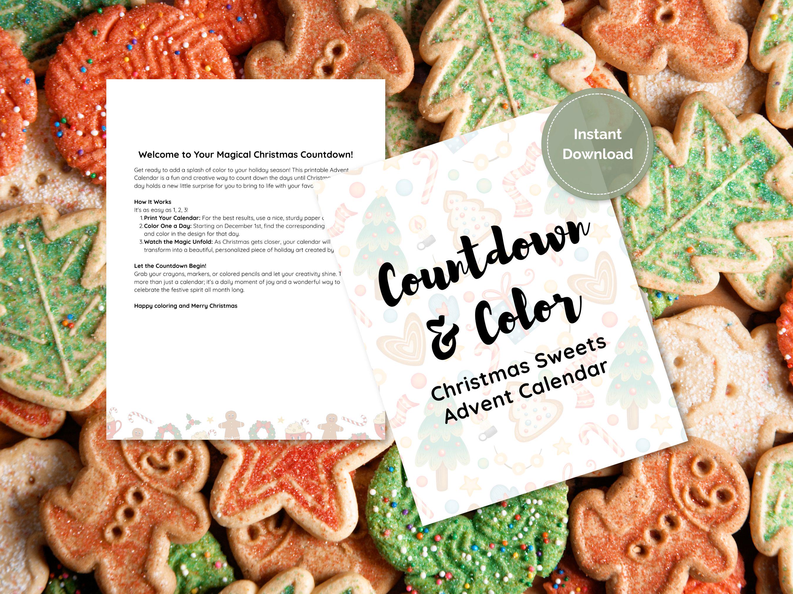 🌟 What's Inside? A Candy-Coated Countdown: Starting on December 1st, color one unique sweet treat each day. From classic candy canes and gingerbread men to festive cupcakes and hot cocoa, you'll find 24 different designs to enjoy. Fun for All Ages: This coloring activity is perfect for kids and adults alike. It’s a great way to spend quality time together and create a beautiful, personalized piece of holiday art. Instant Holiday Fun: No need to wait for shipping! This is a digital download you can print right from home and start coloring immediately.