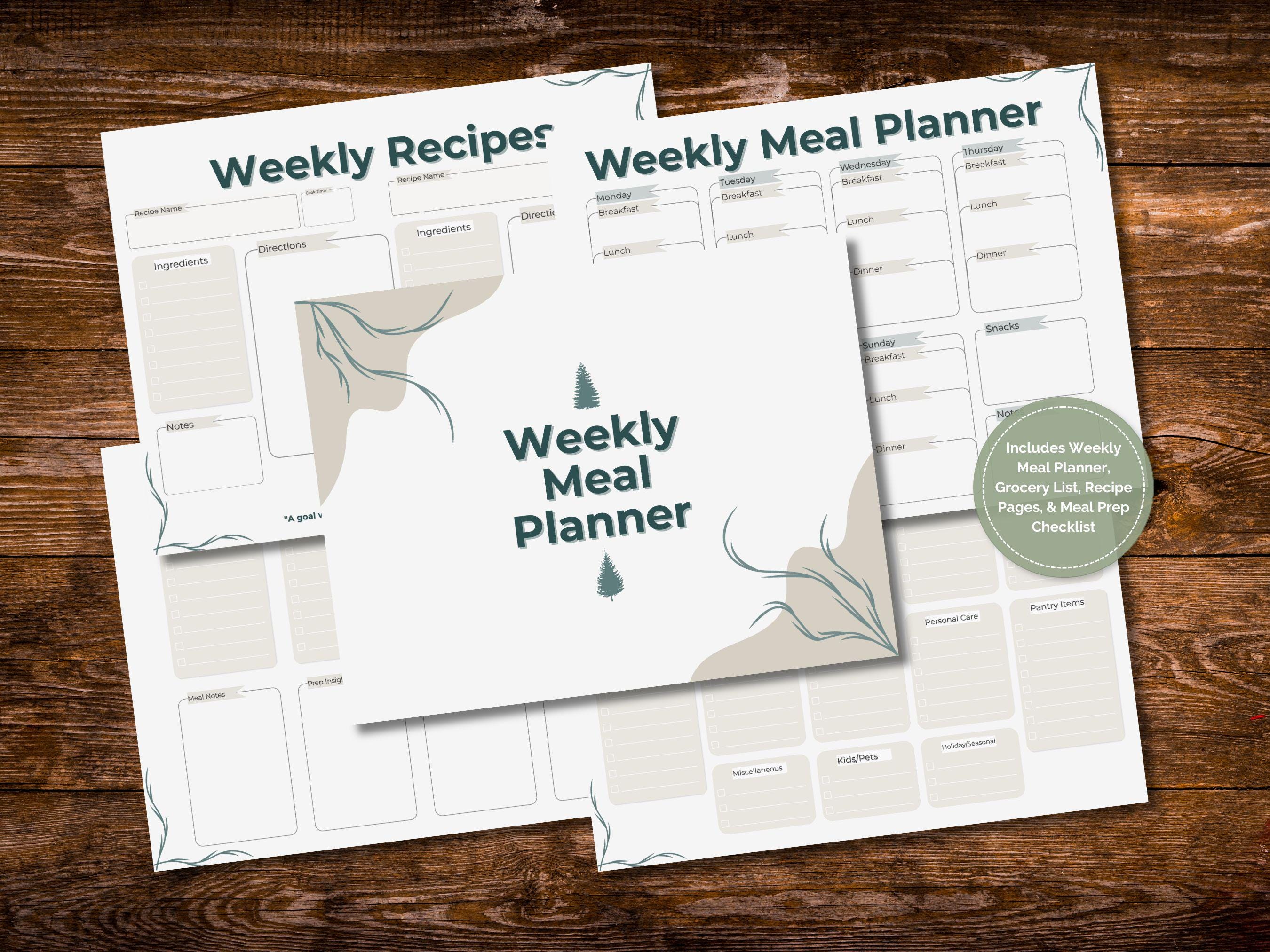 What You'll Receive This instant PDF download is designed to bring clarity and peace to your kitchen. The bundle includes a thoughtfully crafted collection of pages: Weekly Meal Planner: An overview page to map out your meals for the entire week, from breakfast to dinner. Grocery List: A categorized list to make your shopping trips quick, organized, and effective. Weekly Recipe Pages (2): Dedicated space to write down the key recipes for your weekly menu, keeping everything in one place. Meal Prep Checklist: An organized checklist to guide you through prepping ingredients and tasks ahead of time, making weeknight cooking a breeze.