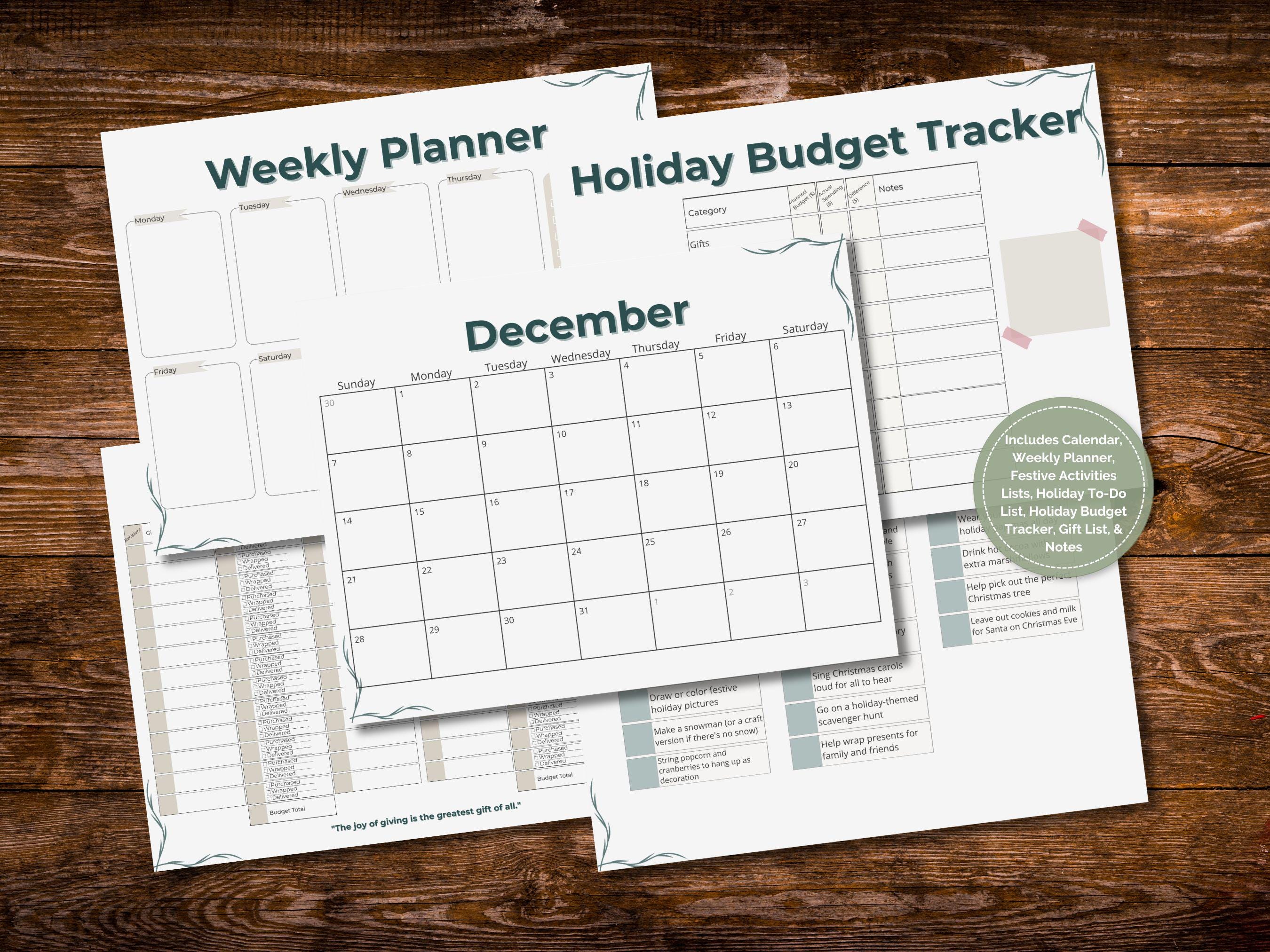 What's Inside Your Planner? This instant digital download is thoughtfully structured to guide you from planning to celebration with ease. Monthly Calendar: Get a clear overview of December to mark important dates, parties, and appointments. Weekly Planner: Break down your tasks week by week, ensuring nothing is overlooked. Festive Activities Lists: Discover curated ideas for all ages to make the season merry and bright. We've included separate lists for general fun and for kids! Holiday To-Do List: A dedicated space to track all your seasonal tasks, from sending cards to decorating the house. Holiday Budget Tracker: Keep your finances in check with a simple, effective tracker for gifts, food, decorations, and more. Gift List Tracker: Organize your gift-giving from start to finish. Track ideas, purchases, and wrapping progress all in one place. Notes Pages: Lined pages for your thoughts, reminders, recipes, or favorite holiday memories.