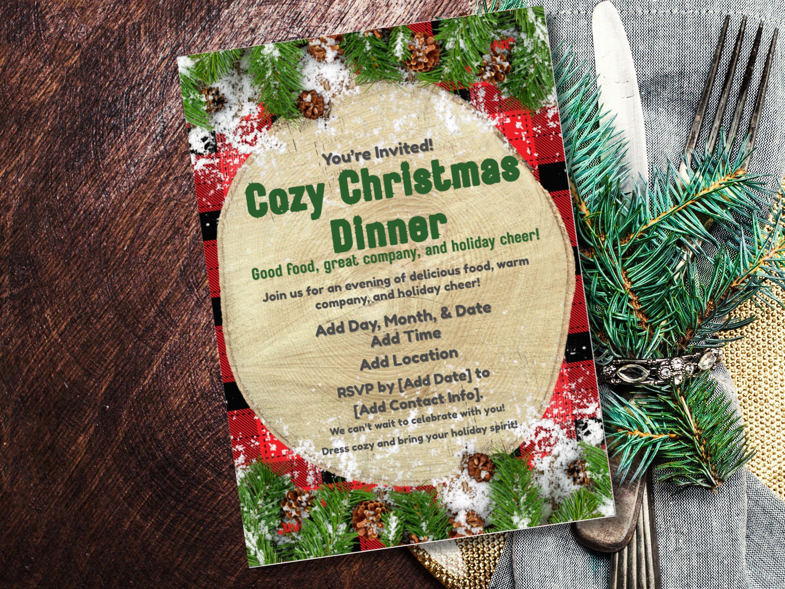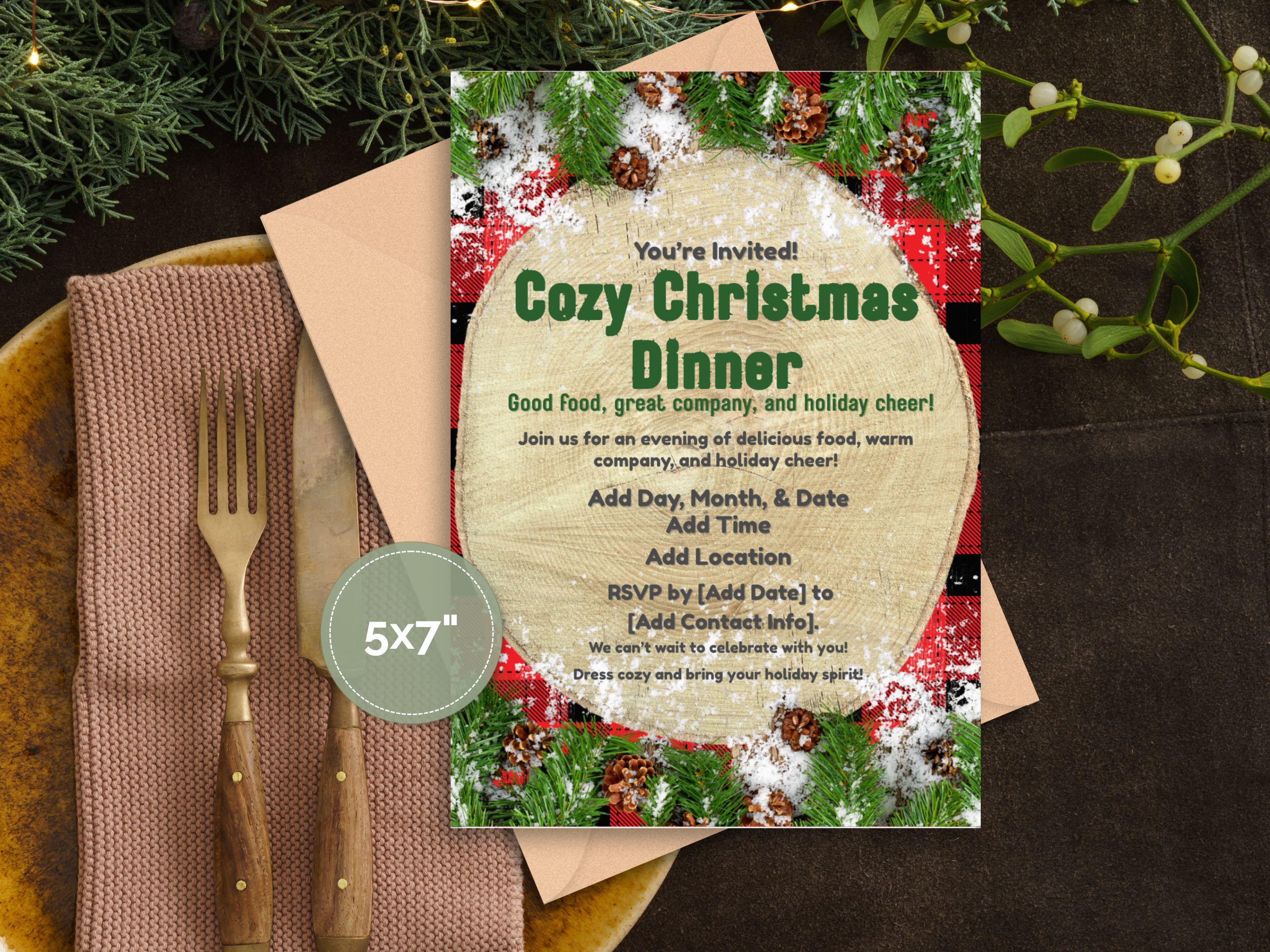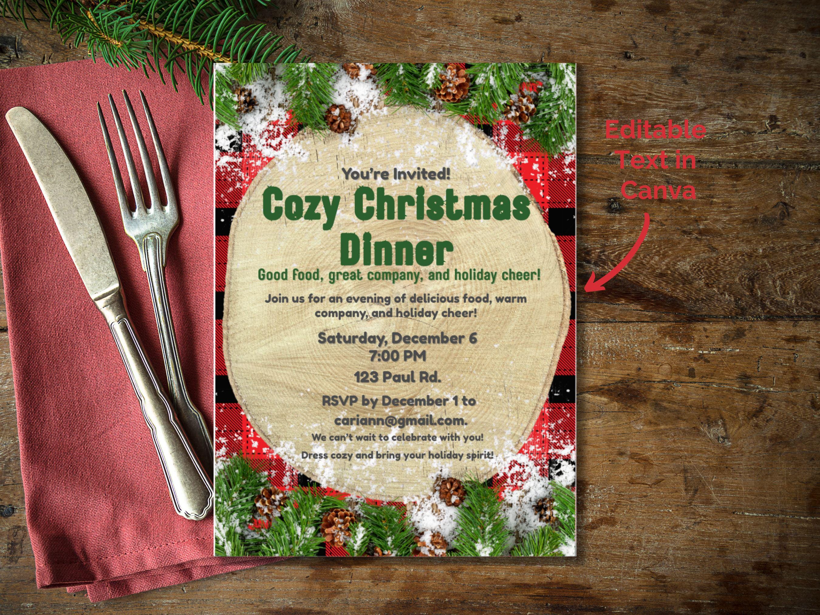 Rustic Christmas Dinner Invitation 🎄 | Editable Farmhouse Holiday Invite Template | Printable Buffalo Plaid Party ❄️ Gather your loved ones for a celebration filled with warmth and holiday cheer! ✨ Our editable Rustic Christmas Dinner Invitation is the perfect way to announce your cozy farmhouse-style gathering. Featuring a classic red and black buffalo plaid background, this design captures the heart of a country Christmas. 🪵