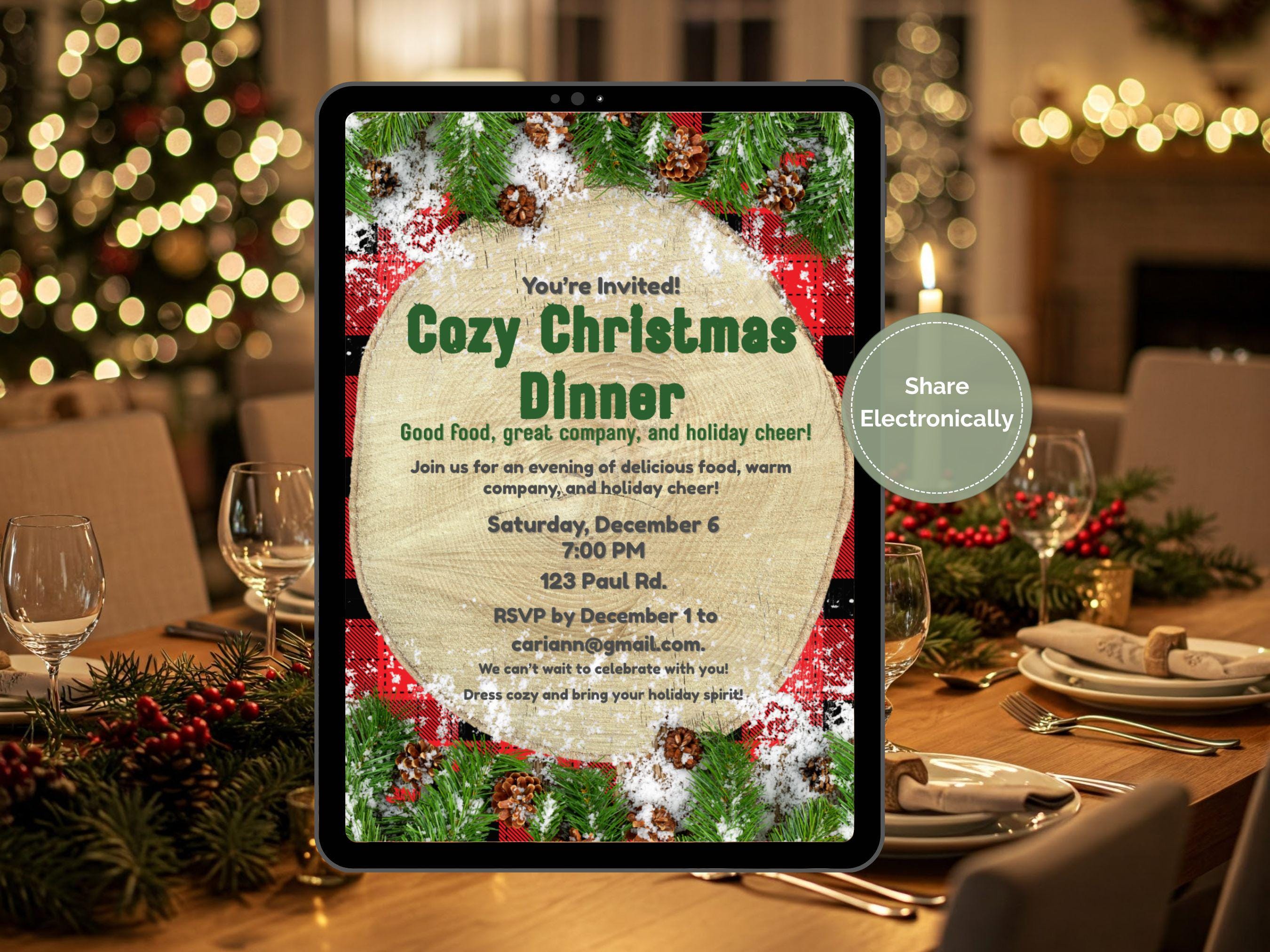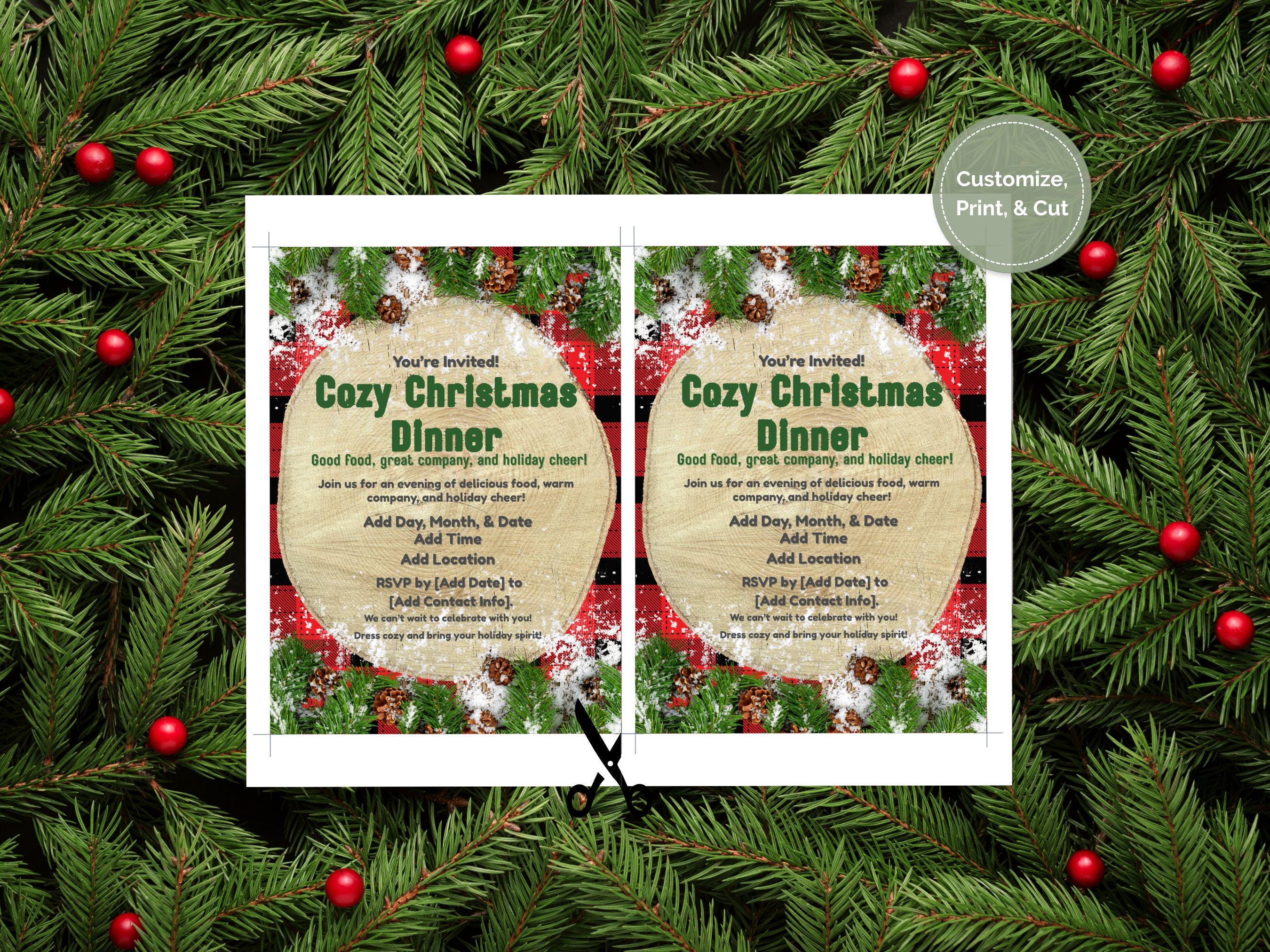 What You’ll Love 🎅 Instantly Editable: Personalize your invitation right after purchase! ⏱️ Easily add your event details, including the date, time, location, and RSVP information. 📝 Charming Rustic Design: The combination of buffalo plaid, a wooden centerpiece, and festive pinecones creates an authentically warm and inviting look. 🌲✨ Printable at Home: Designed for easy home printing, this template allows you to create beautiful invitations quickly and affordably. 🖨️ Perfect for DIY party planners! 🎨 Versatile for Any Holiday Event: Ideal for Christmas dinners, holiday parties, winter gatherings, or any festive celebration where you want a touch of rustic elegance. ❄️🍷