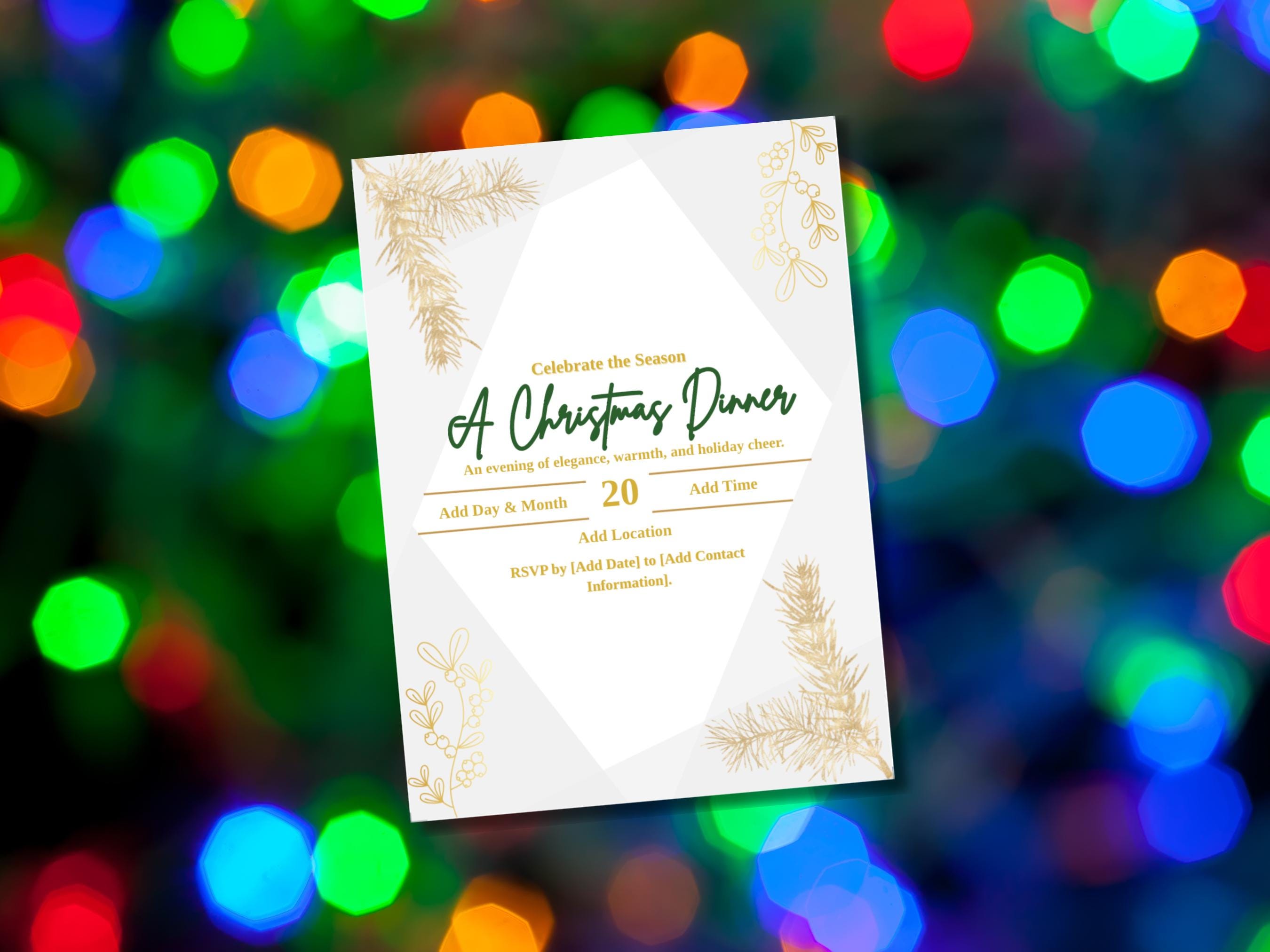 Modern Christmas Invitation | Editable Minimalist Holiday Dinner Invite Template | Emerald Green & Gold ✨ Invite your guests to a holiday celebration filled with elegance and modern charm! 🎄 Our editable Modern Minimalist Christmas Dinner Invitation sets the perfect tone for a sophisticated and memorable evening. This design blends clean lines with festive warmth, creating an unforgettable first impression. Imagine your friends and family receiving this beautiful invitation, featuring striking emerald green script on a crisp white background. Delicate gold accents and subtle geometric patterns add a touch of understated luxury, promising an event that is both stylish and full of holiday cheer. 🤍