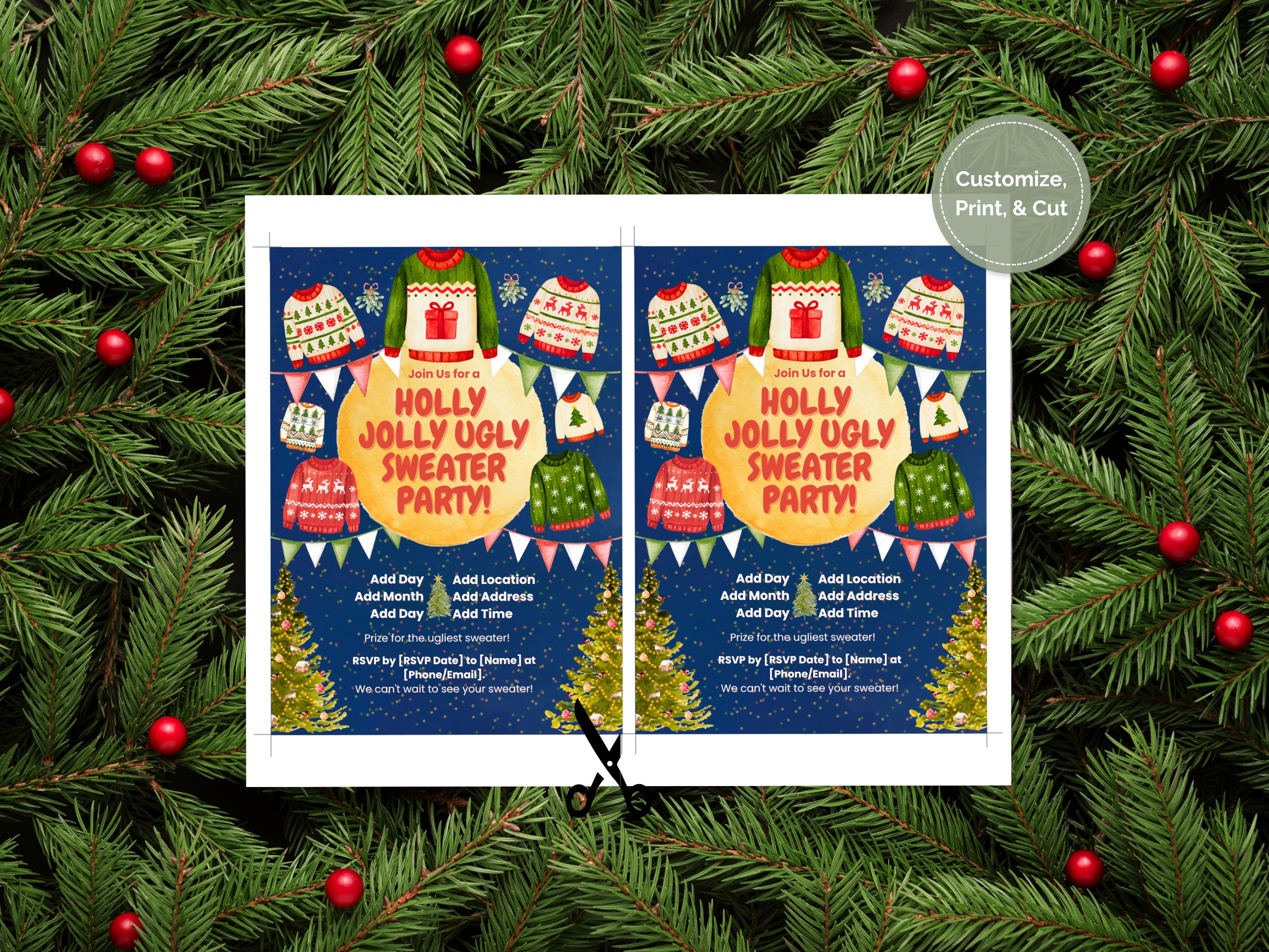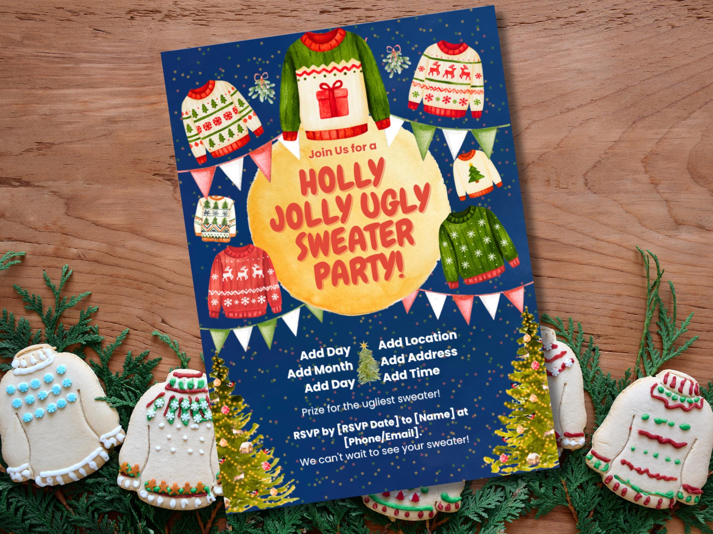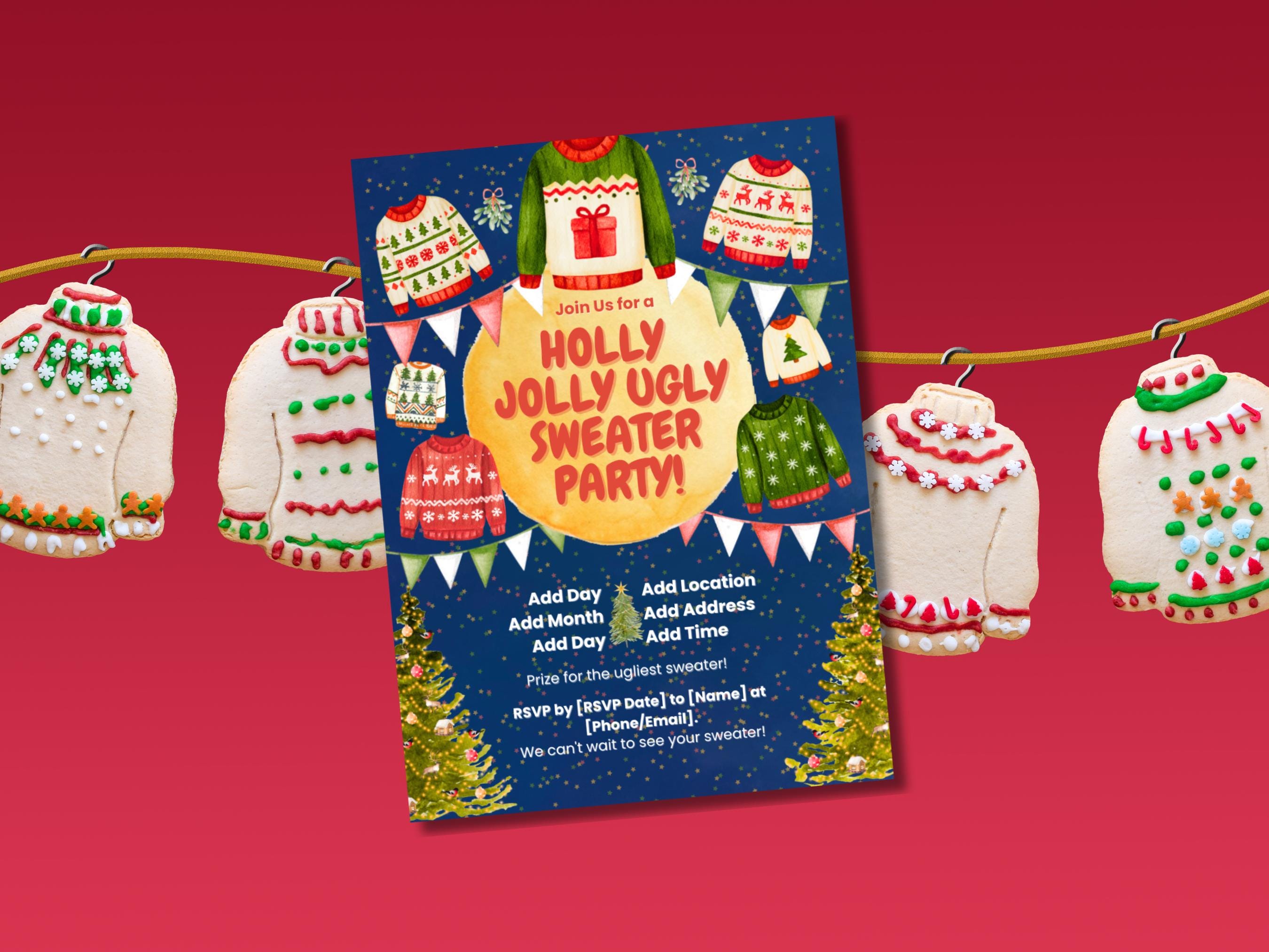 Whimsical Ugly Sweater Party Invitation ✨🎄 Get ready to host the most memorable holiday bash of the season with our Whimsical Ugly Sweater Party Invitation! 🎅 This charming, printable invite is bursting with festive fun, featuring a magical starry background, playful watercolor sweaters, and cheerful holiday details. It’s the perfect way to get your guests excited for a night of cozy, ugly fun!