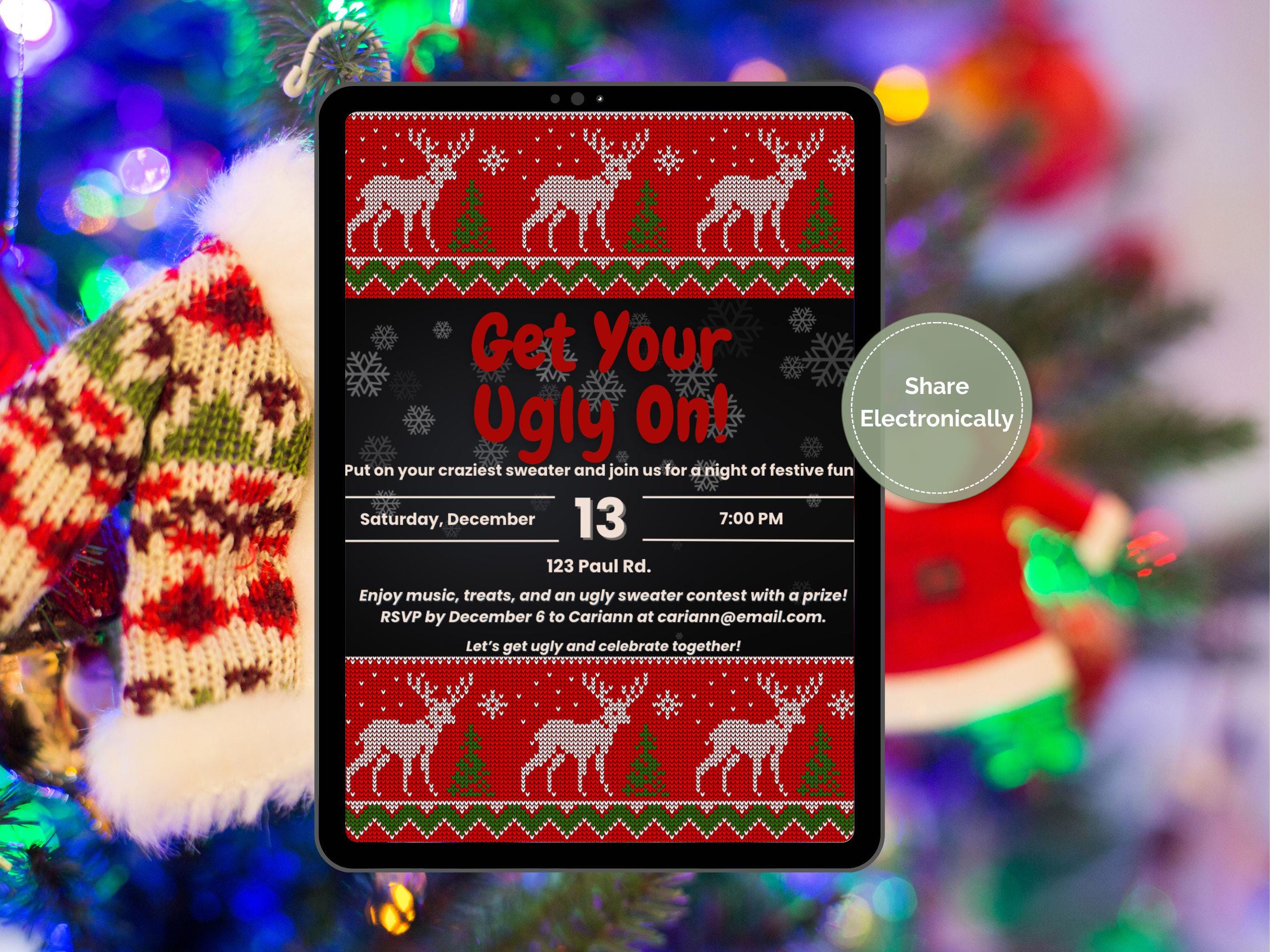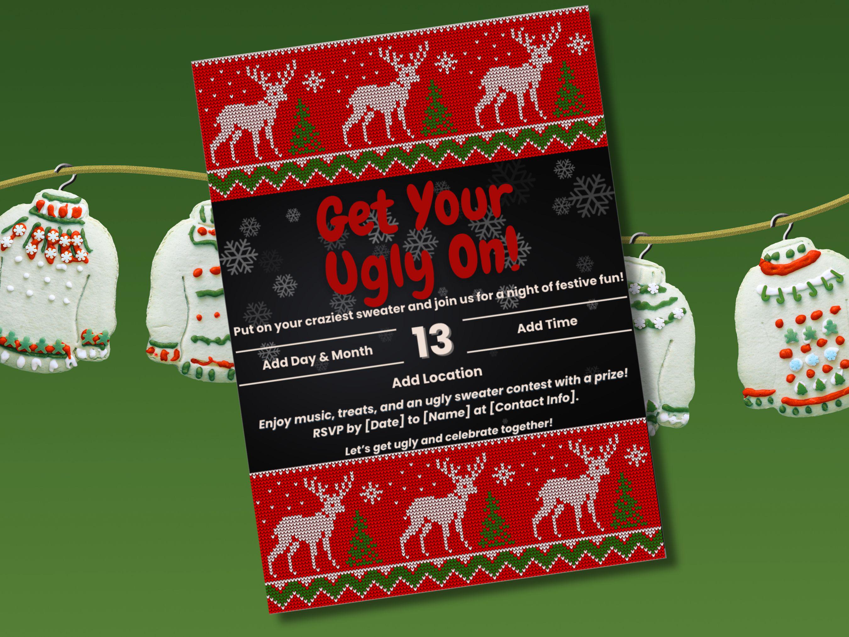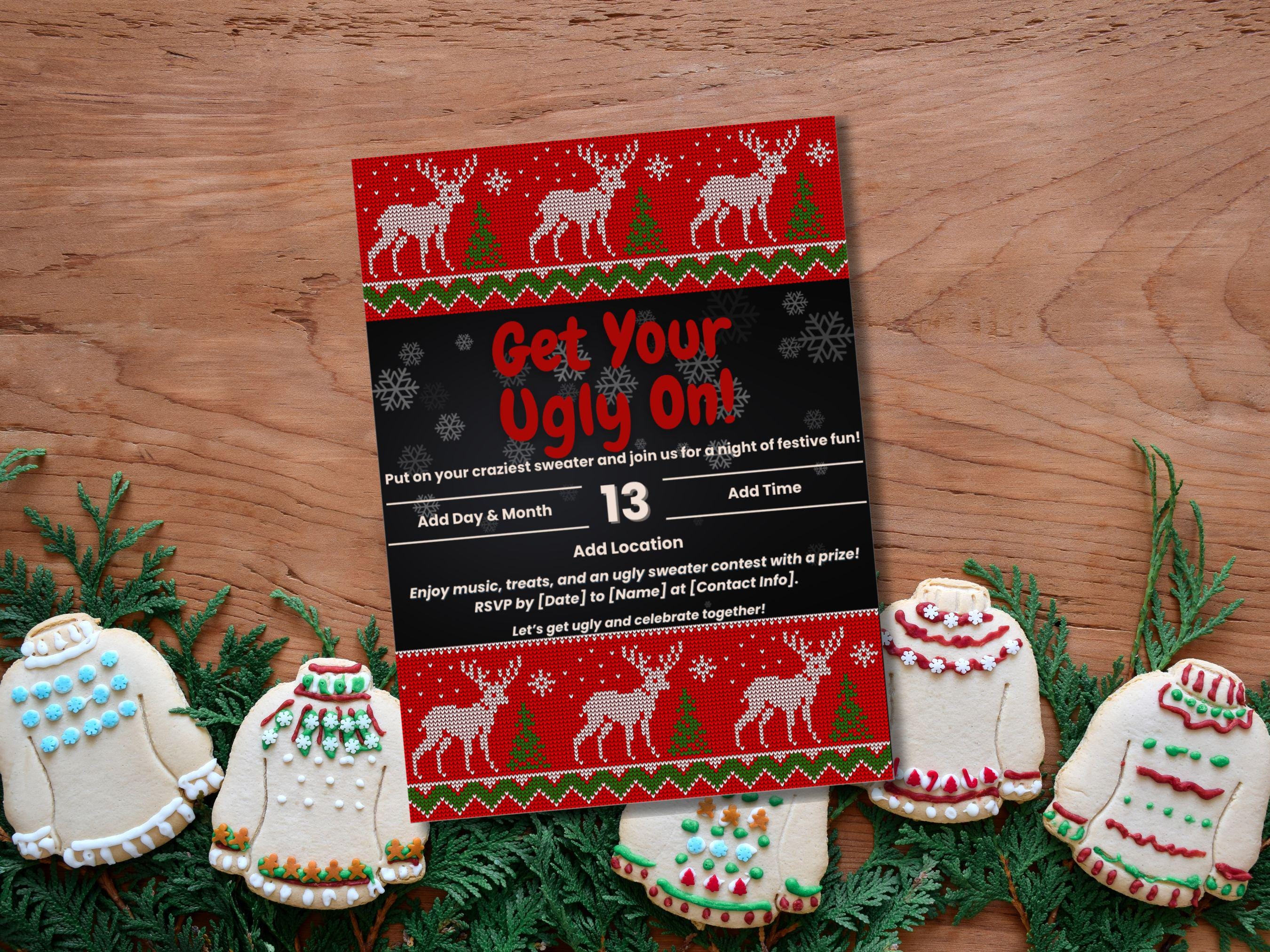 Get Your Ugly On! Ugly Sweater Party Invitation 🎄✨ Ready to host the most fun and festive party of the year? 🥳 Our "Get Your Ugly On!" invitation is here to set the perfect tone for a night of holiday cheer and fantastically tacky sweaters! With its bold, knitted-sweater pattern and playful design, this invite is guaranteed to get your guests excited.